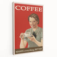 Bring a touch of timeless charm to your space with this Vintage Retro Coffee Poster Art, a perfect addition for any coffee lover's home or office. Featuring a classic mid-century design, this nostalgic art print highlights the warm tones of a vintage coffee advertisement, making it an ideal decor piece for those who appreciate the retro aesthetic. The joyful expression of the woman holding a cup of coffee combined with the vibrant red background evokes a sense of warmth and positivity, perfect for brightening up your living room or kitchen.