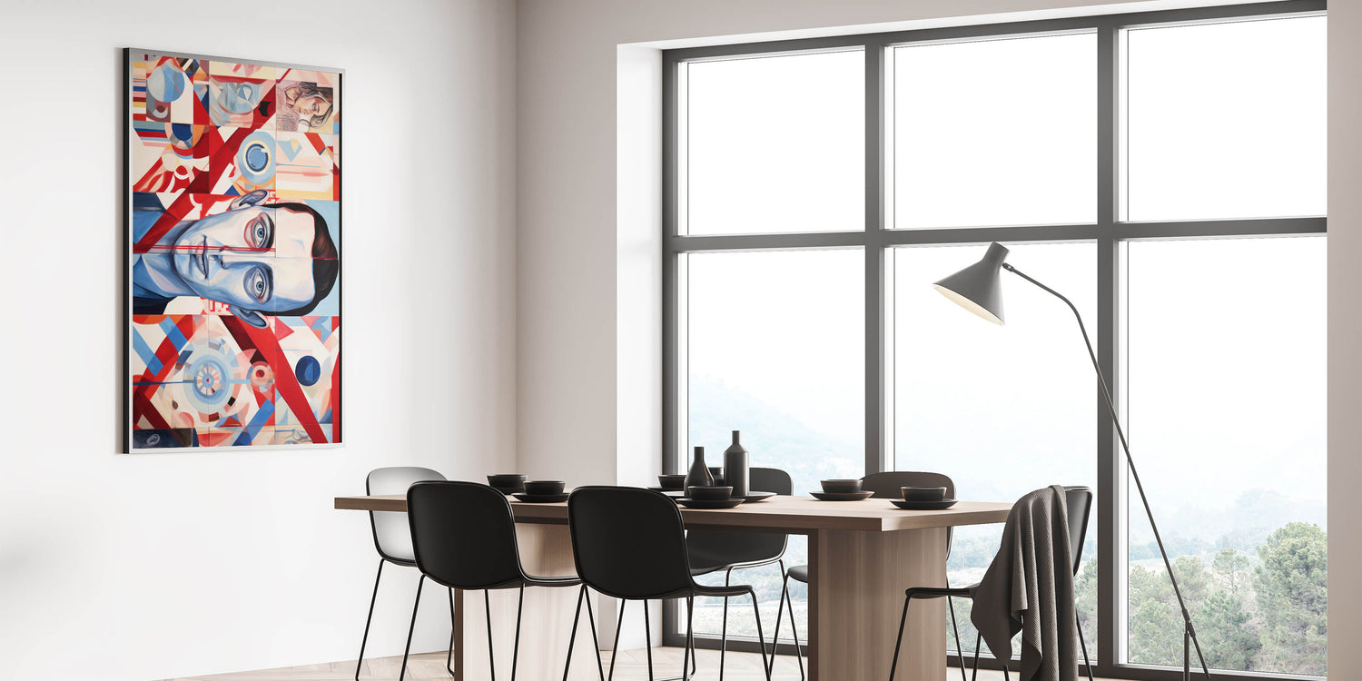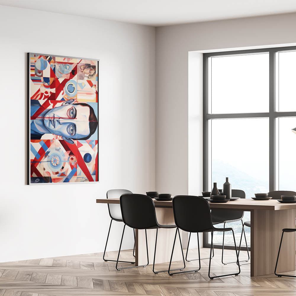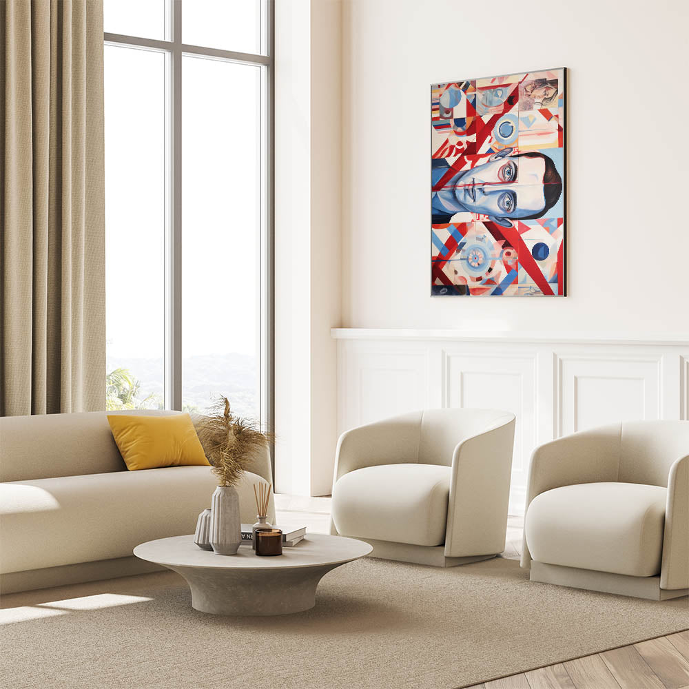 The "Abstract Electric Portrait Canvas" is a bold and dynamic piece of electric wall art that combines abstract shapes, vivid colors, and fragmented imagery to create an eye-catching design. Featuring a striking portrait intertwined with geometric patterns in red, blue, and white, this artwork delivers a sense of movement and energy, perfect for modern and contemporary interiors.