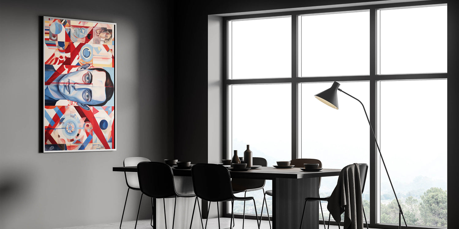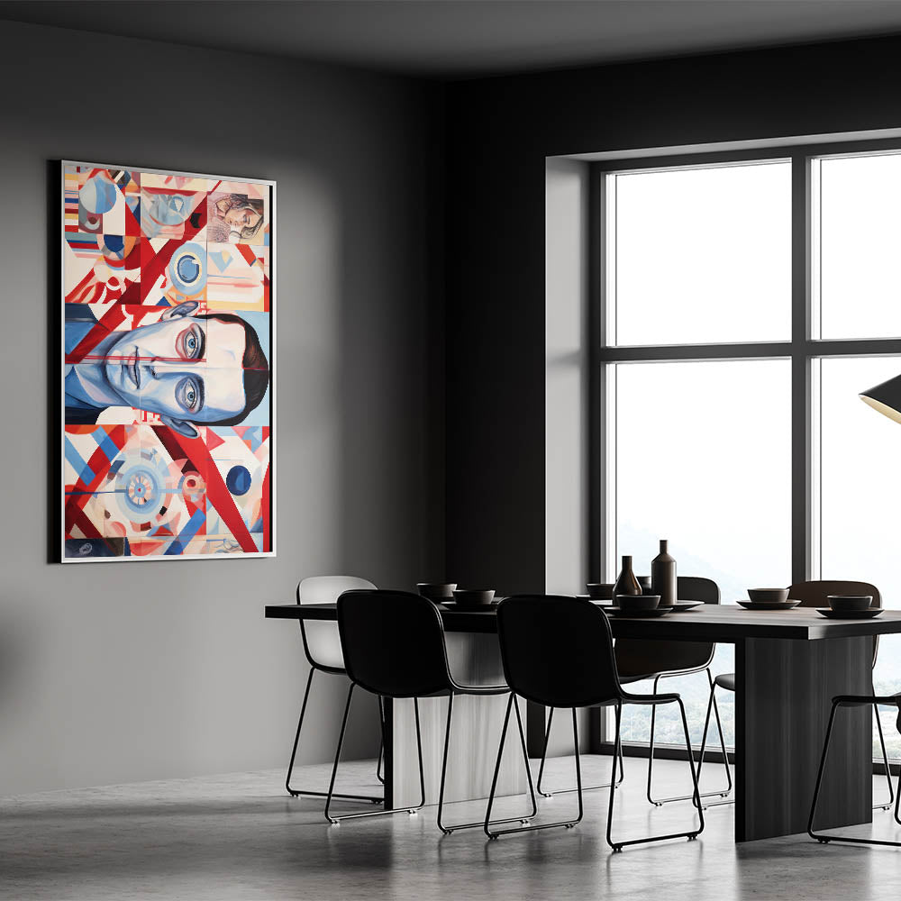 • An electric-themed artwork that merges abstract and portrait styles, making it an ideal focal point for creative spaces.