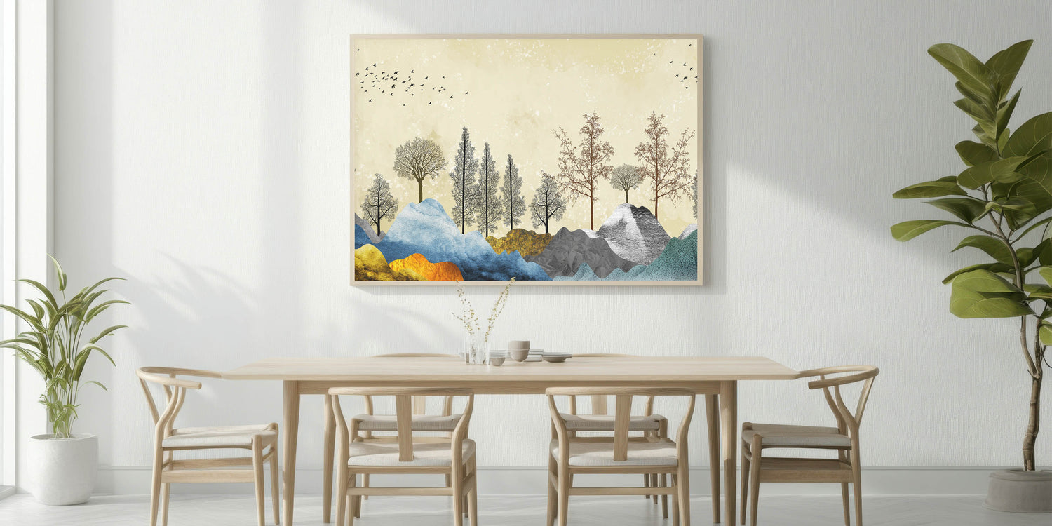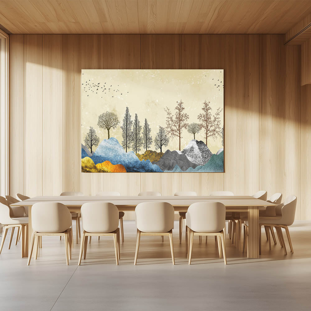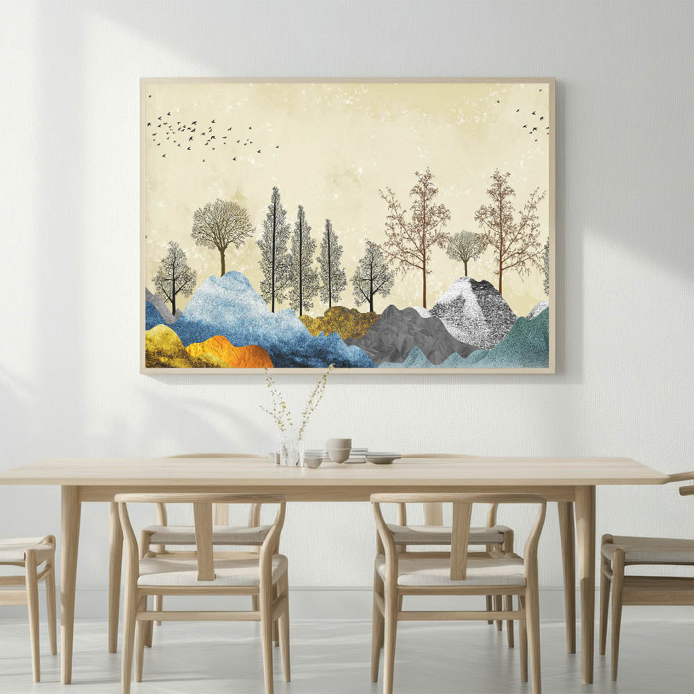 Transform your space with the vibrant beauty of our Colorful Abstract Landscapes wall art. This piece features an enchanting blend of colorful mountains and intricately detailed tree silhouettes against a subtle, textured background. The harmonious mix of colors and forms creates a dynamic and visually captivating scene, perfect for any modern or contemporary setting.
