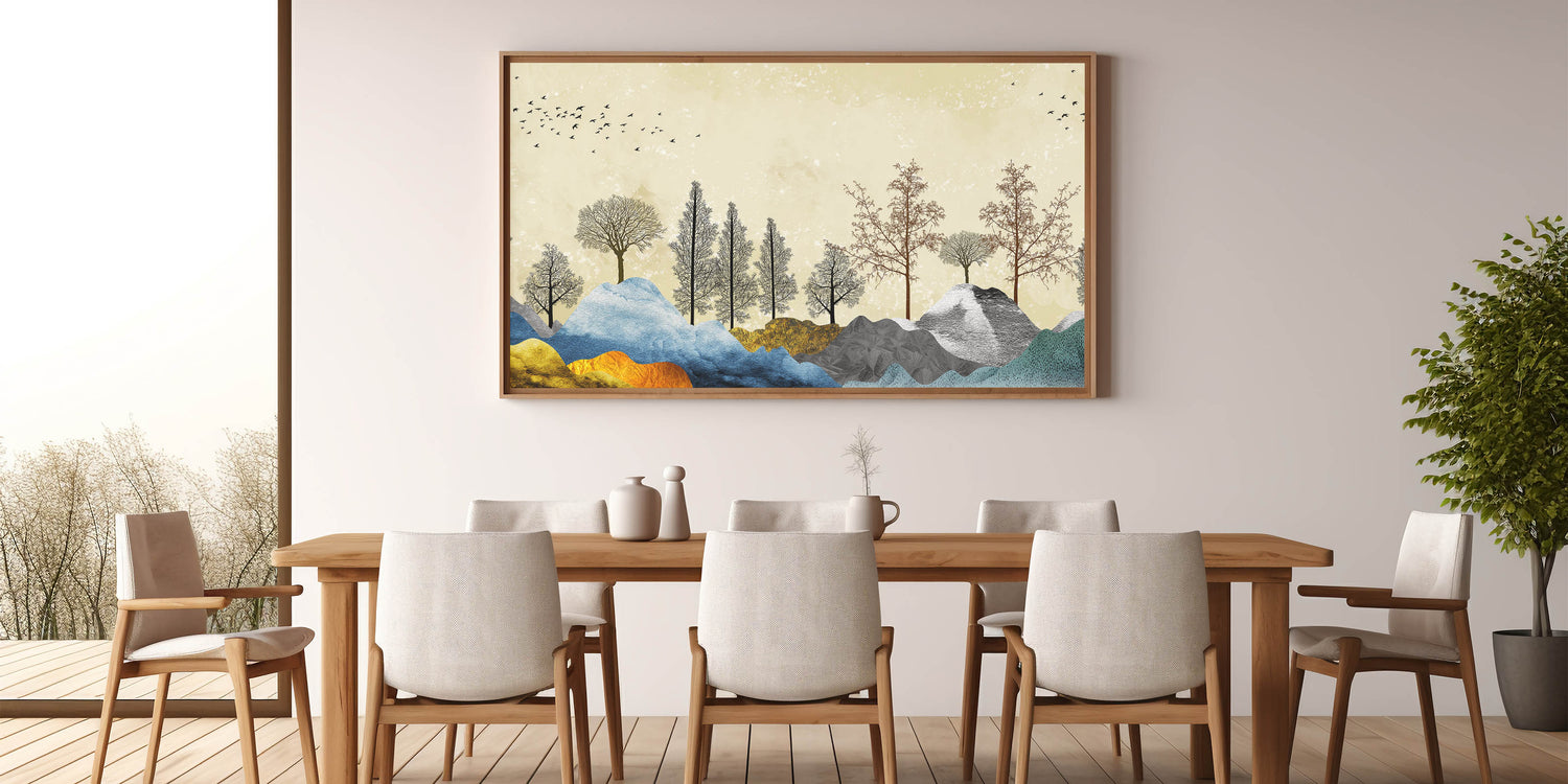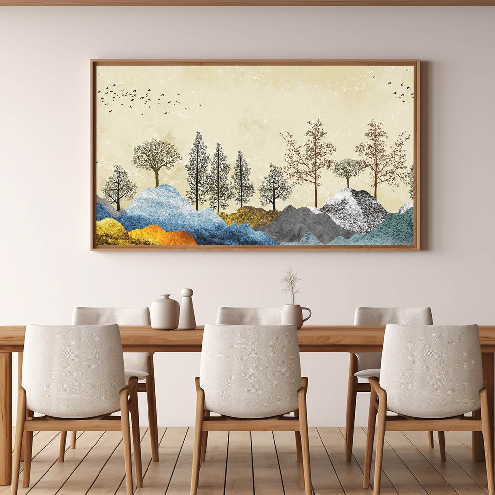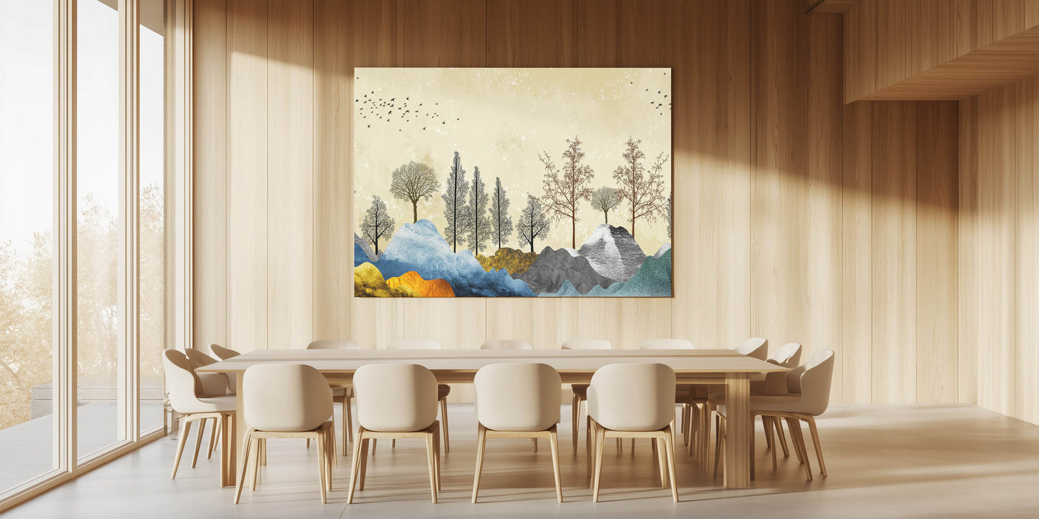 Transform your space with the vibrant beauty of our Colorful Abstract Landscapes wall art. This piece features an enchanting blend of colorful mountains and intricately detailed tree silhouettes against a subtle, textured background. The harmonious mix of colors and forms creates a dynamic and visually captivating scene, perfect for any modern or contemporary setting.