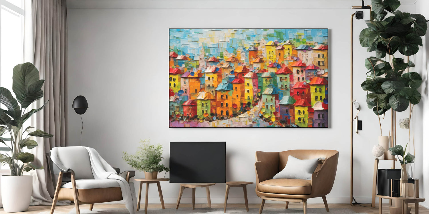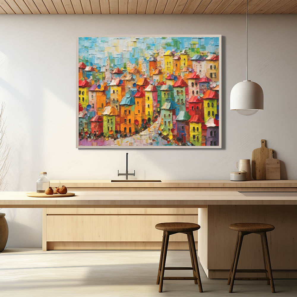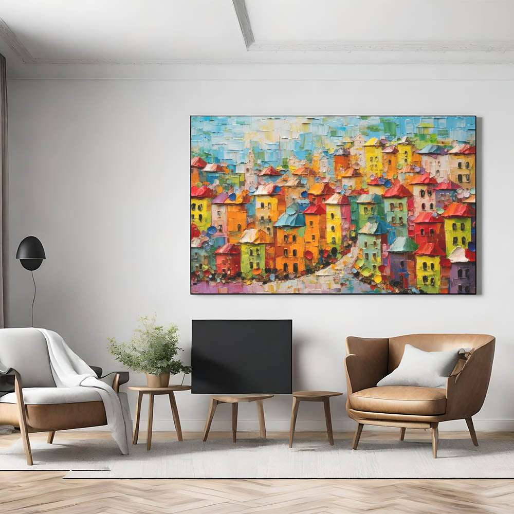 ��This colorful village abstract art brings joy and energy into any room with its lively palette and charming depiction of a quaint village. It's an excellent choice for adding a fun and artistic touch to your decor, brightening up any space with its vibrant appeal.