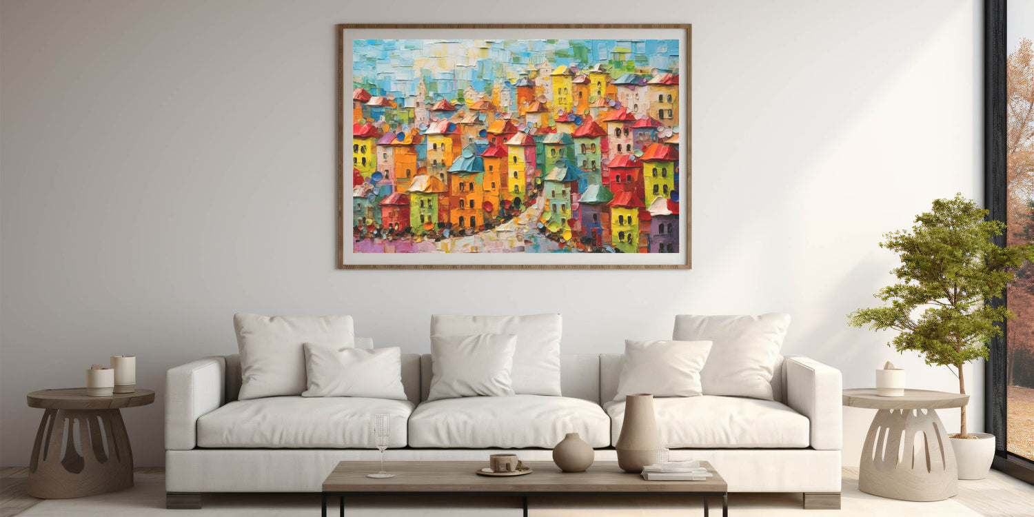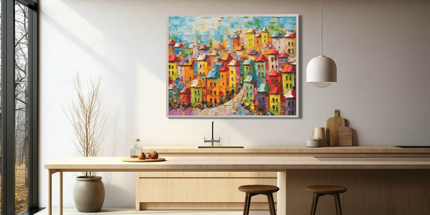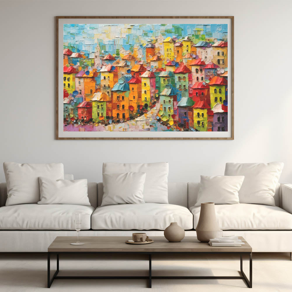 Add a splash of color and whimsy to your space with this vibrant village abstract art. Featuring a delightful array of bright, textured houses in a picturesque village scene, this piece is perfect for those who love bold colors and playful design.