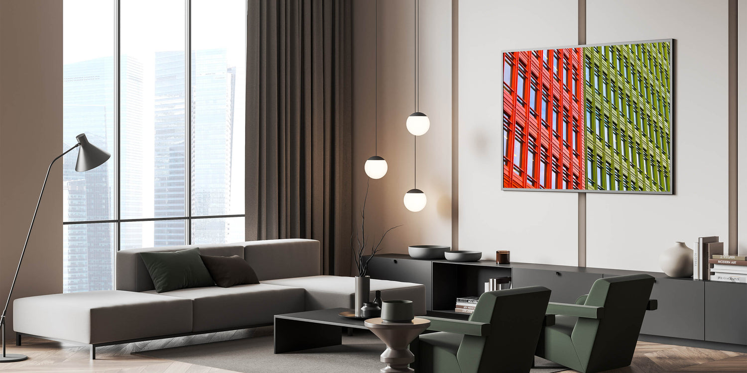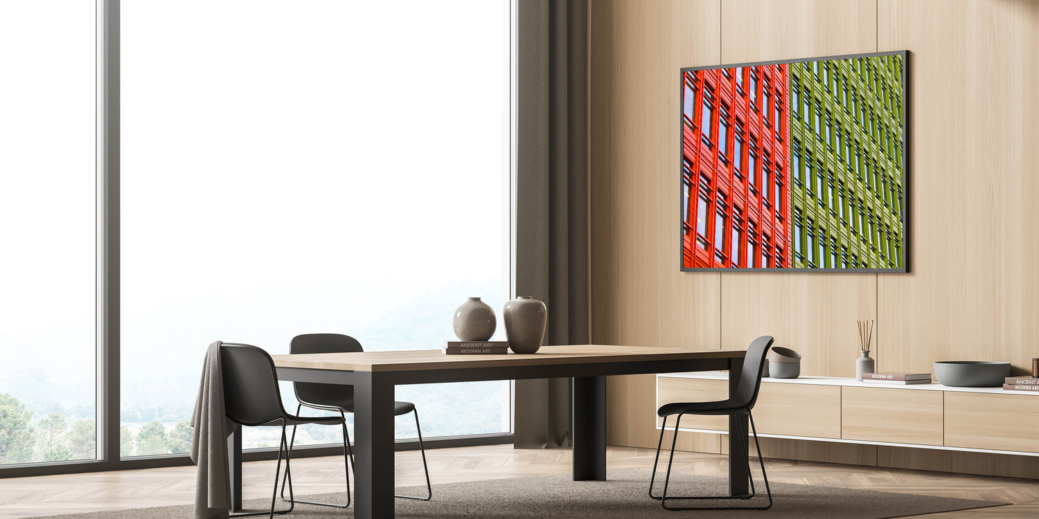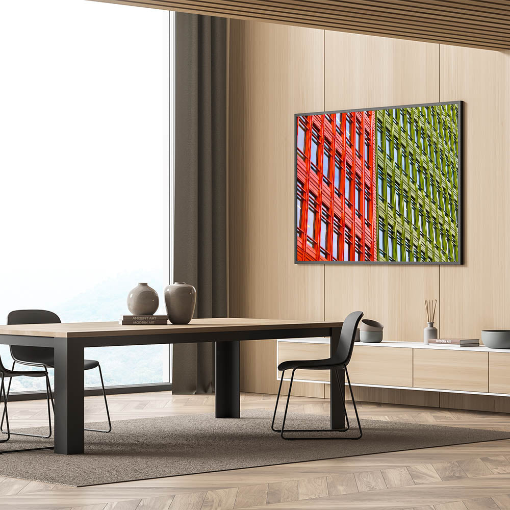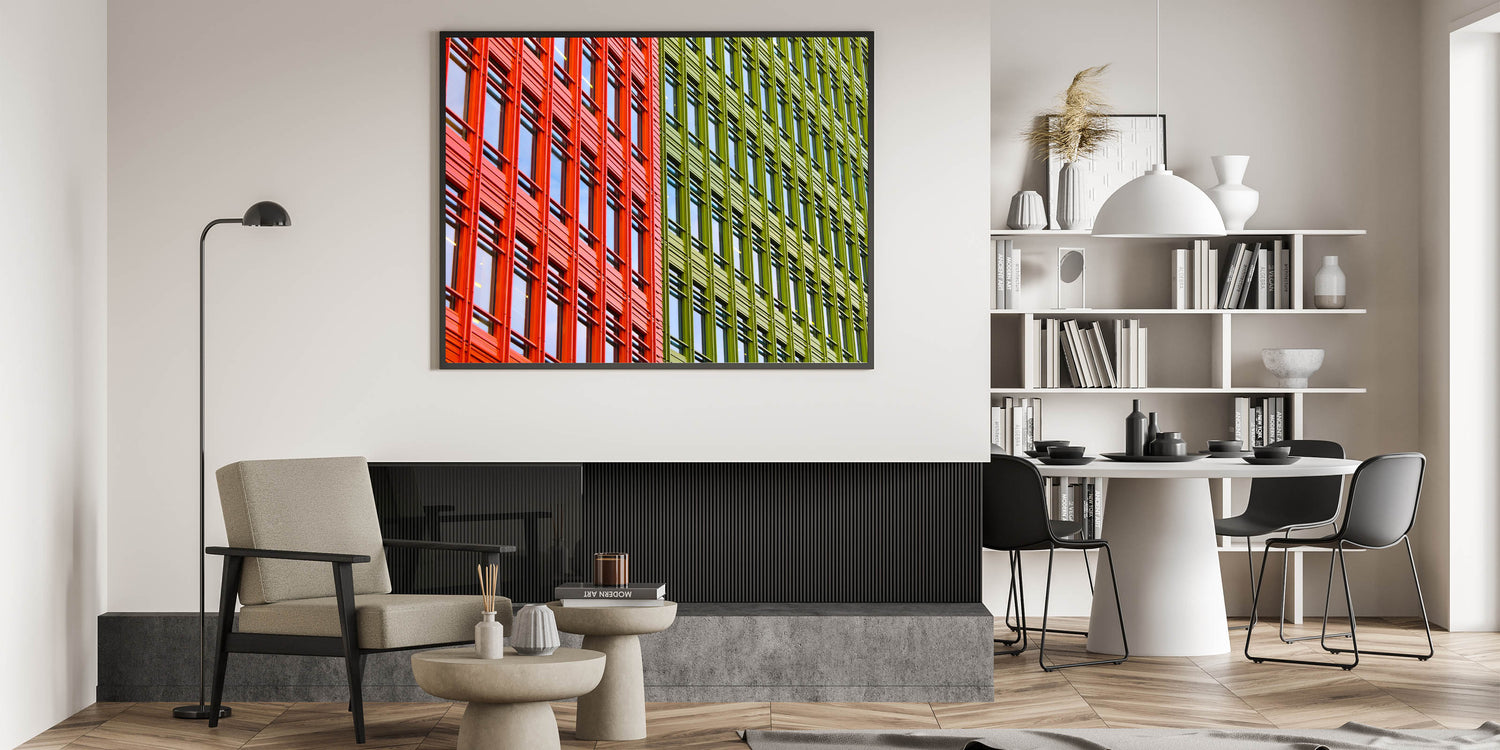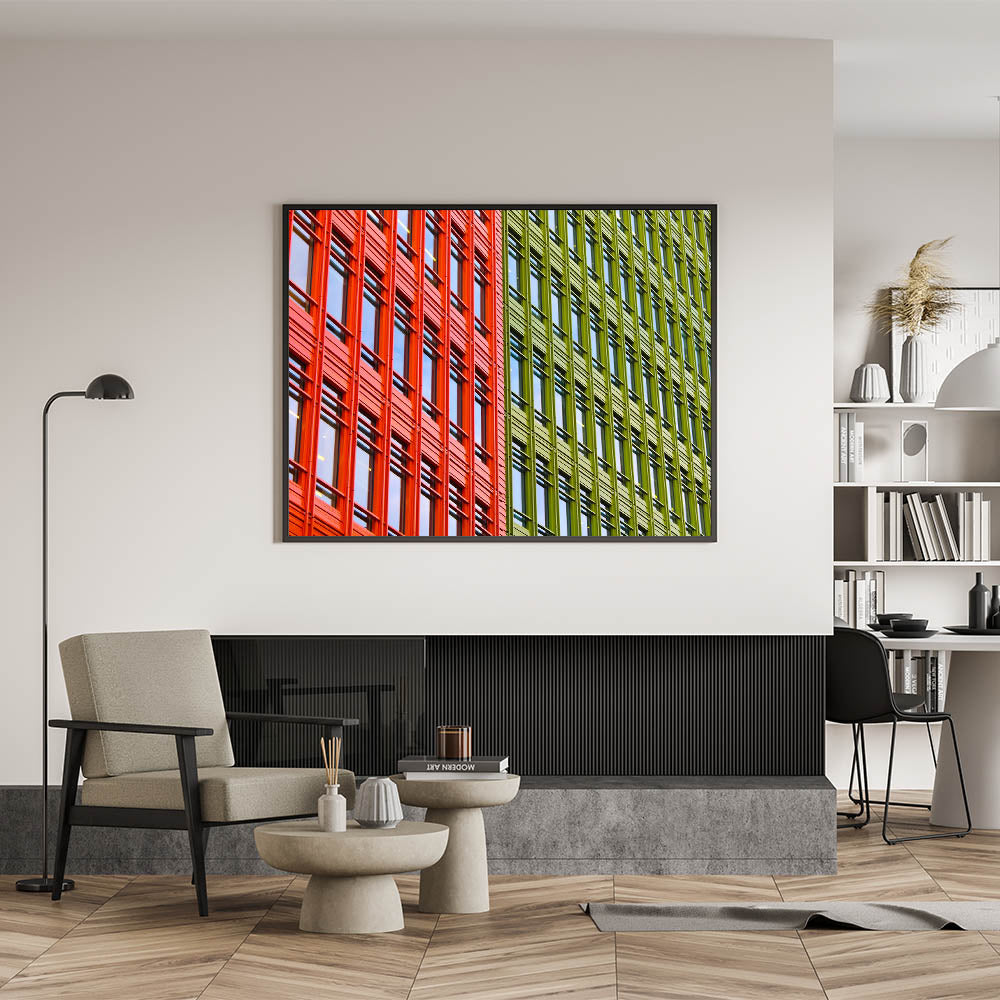 Brighten your walls with this stunning modern architecture art print featuring the colorful facades of a London building. The contrast of bold red and green tones, set against sleek glass windows, creates a captivating visual that highlights London’s blend of contemporary design and vibrant urban life. Perfect for lovers of abstract cityscape art, this piece adds a pop of color and architectural flair to any space.