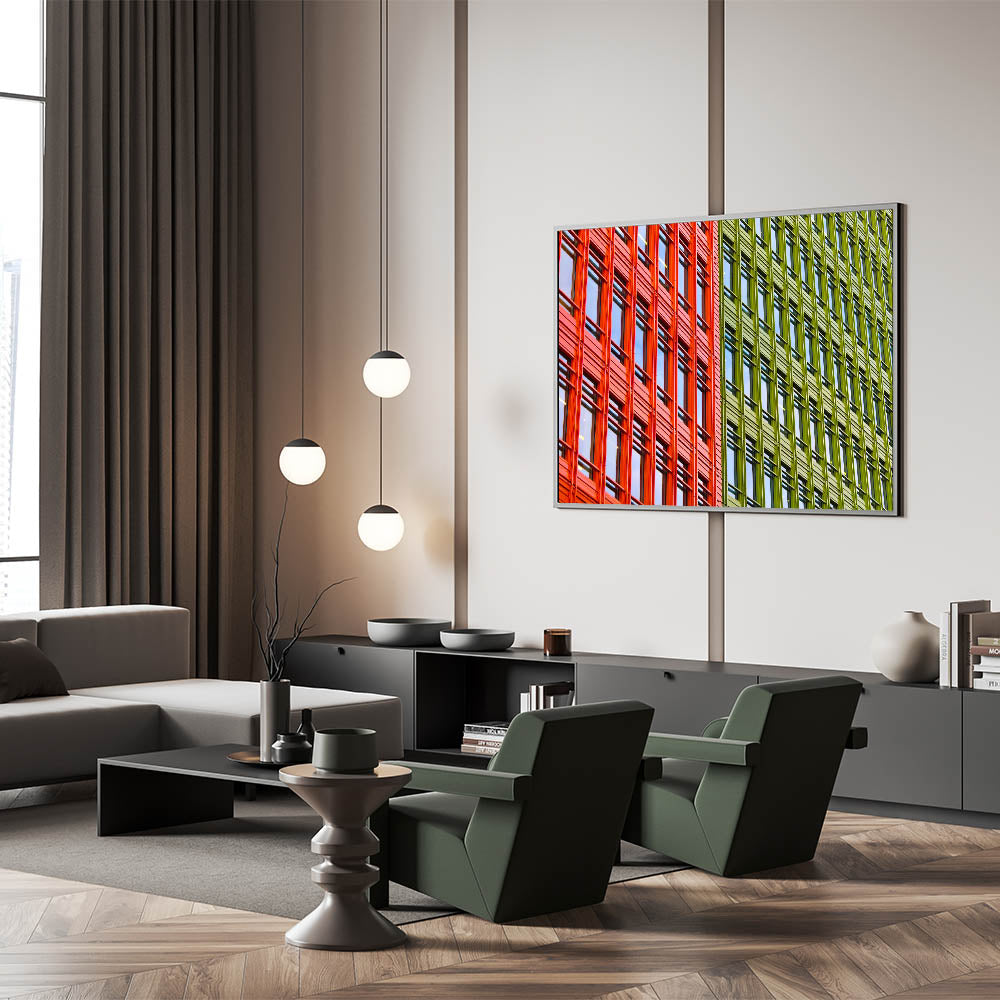 Bring a slice of modern London into your living space with this dynamic and colorful print. The eye-catching red and green combination makes it an excellent statement piece for those who appreciate striking, modern architecture and bold design choices.