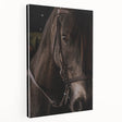 Intimate Horse Portrait" captures the soulful gaze of a horse, offering a deep, emotional connection through the art of photography. This compelling piece highlights the detailed texture of the horse's coat and the intricate elements of its bridle, set against a soft, blurred background that enhances the subject's strong features.