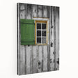 Rustic Cabin Window" art piece beautifully captures the essence of a weathered wooden cabin adorned with a charming green shutter and a yellow-framed window. This artwork highlights the textural contrasts and rich, muted colors that evoke a sense of nostalgia and timeless tranquility.