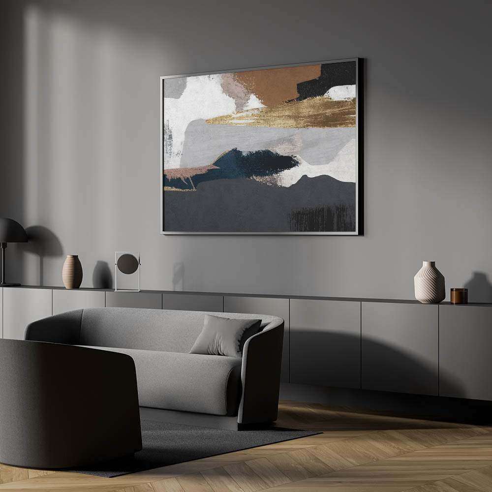 Elevate your interior decor with this striking abstract strokes and lines art. This piece blends earthy tones with bold geometric patterns, creating a visually stunning composition that exudes warmth and sophistication. Featuring a rich palette of deep navy, warm gold, and soft browns, this artwork is perfect for adding a touch of rustic charm to any space.