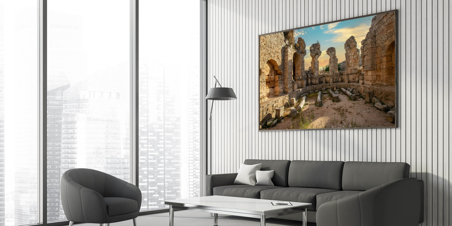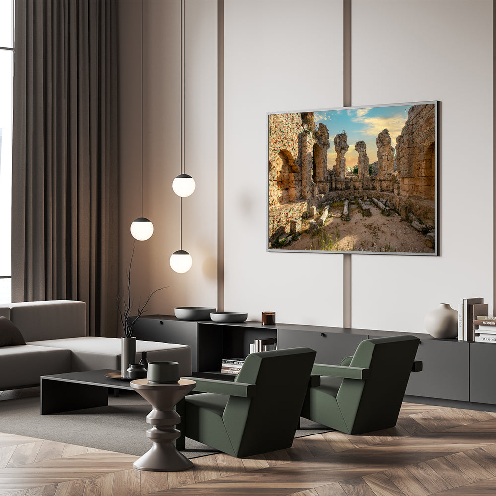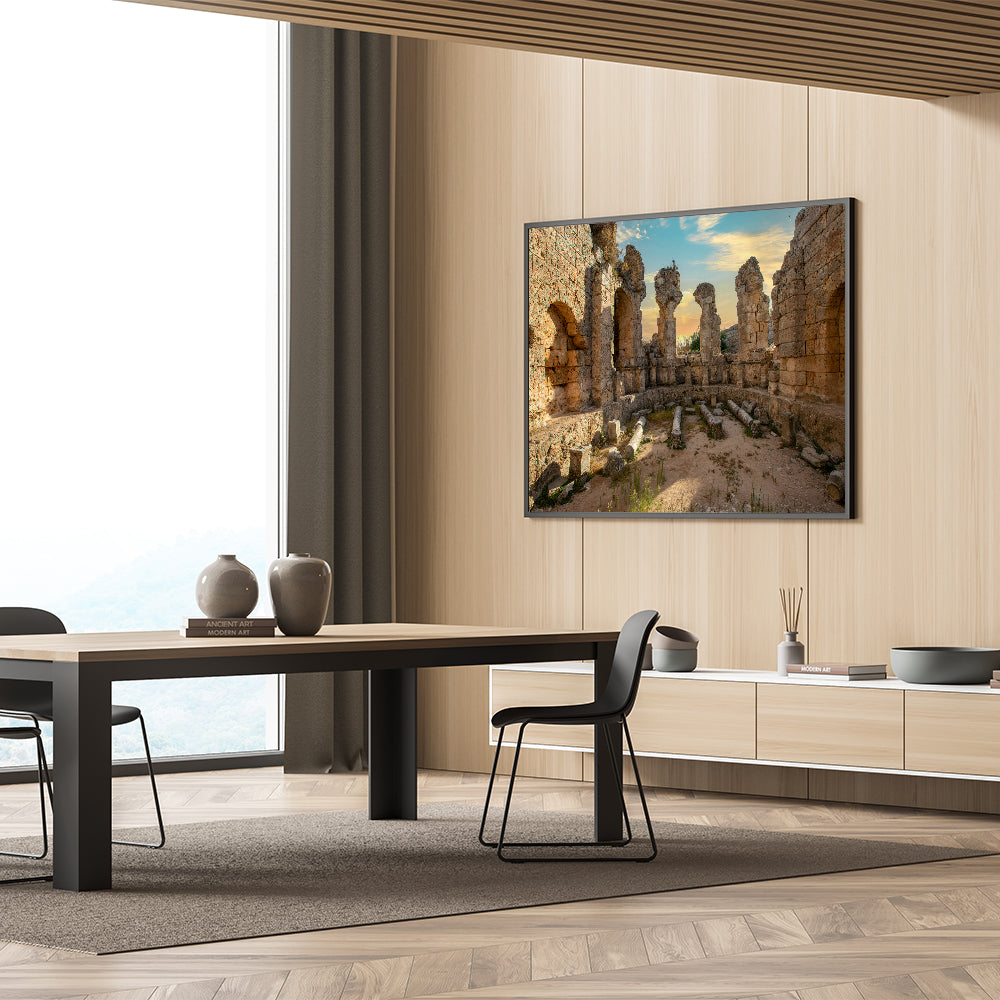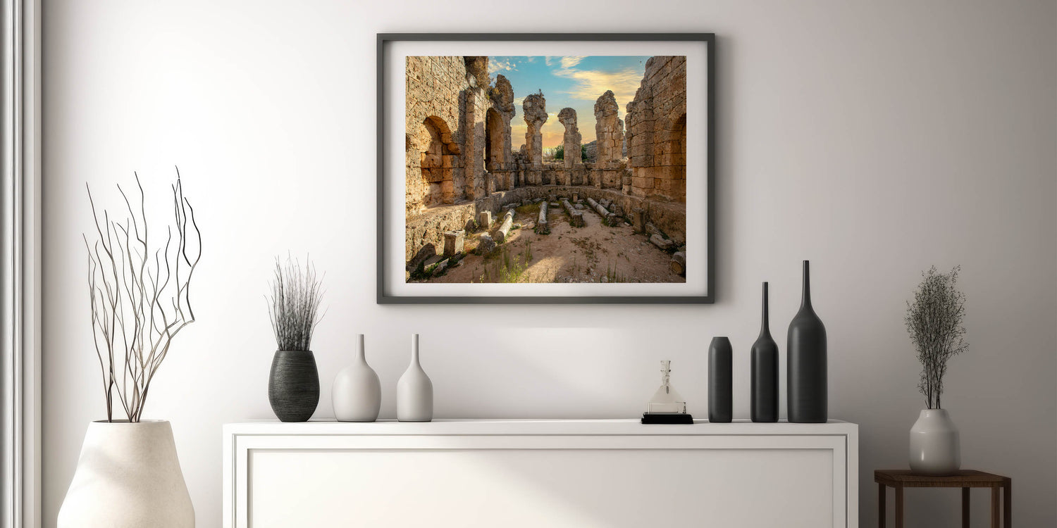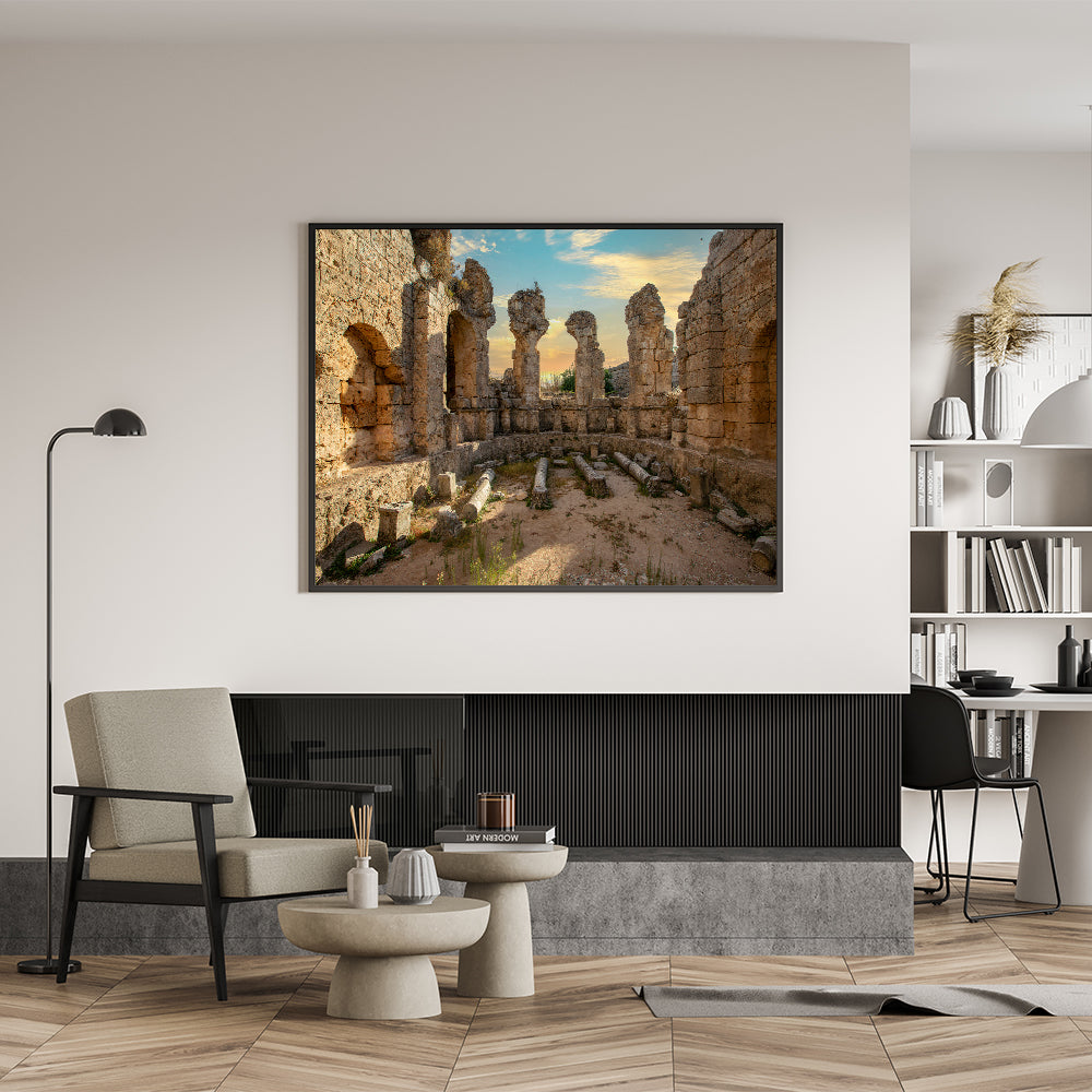 Discover the timeless beauty of ancient architecture with this stunning wall art featuring a circular amphitheater bathed in the warm glow of the setting sun. The intricate stonework and remnants of ancient columns evoke a sense of history and grandeur, making this piece perfect for those who appreciate the elegance and significance of past civilizations.