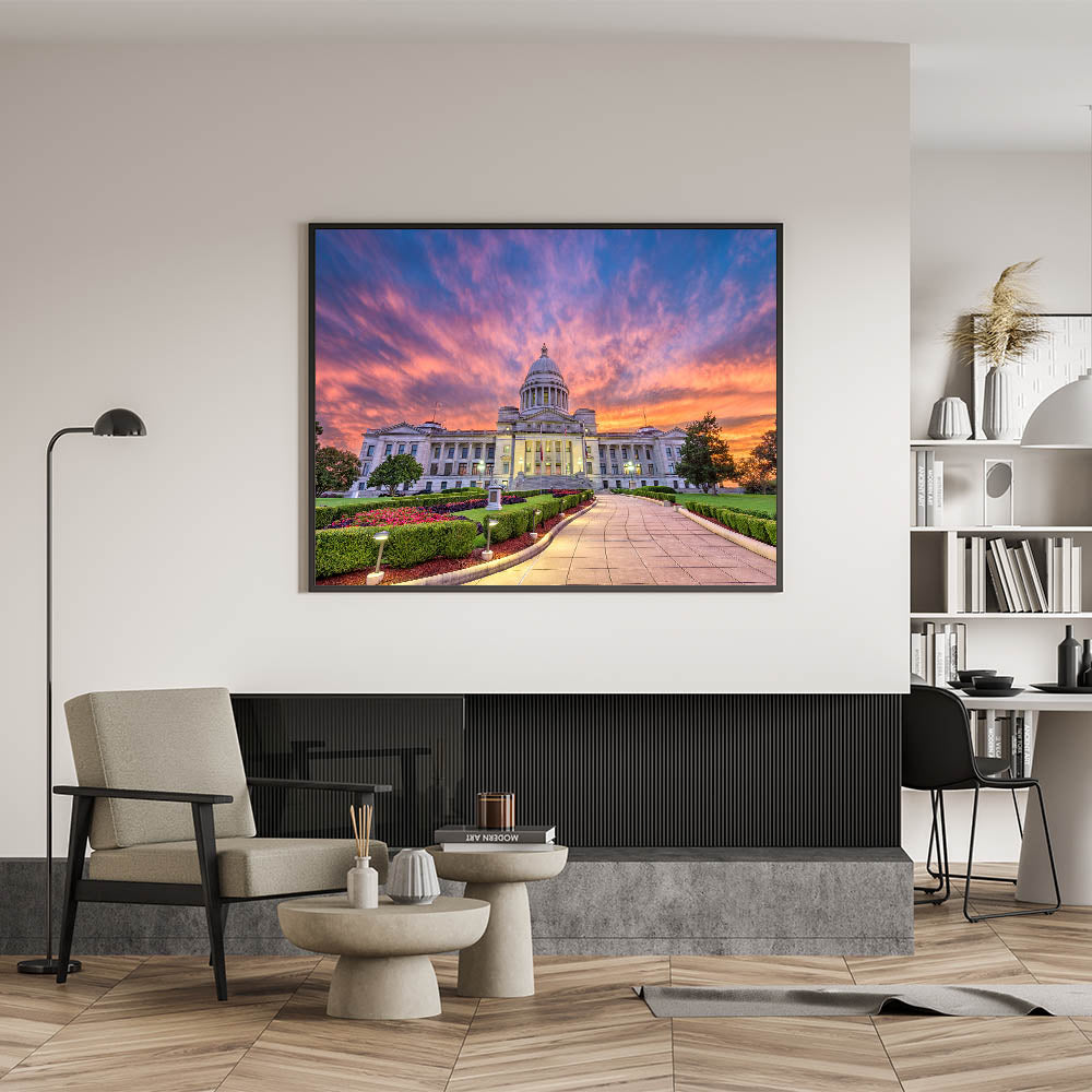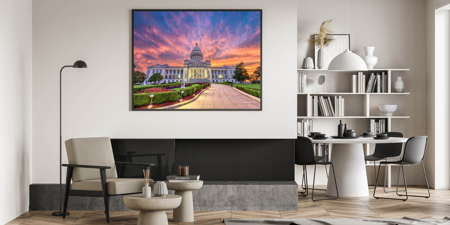 Celebrate Arkansas’s rich history and stunning architecture with this striking art print of the Arkansas State Capitol at sunset. The grand structure is illuminated against a vibrant, colorful sky, creating a perfect blend of historical significance and natural beauty. This photograph captures the essence of Arkansas’s landmarks and makes a beautiful addition to any home or office. Perfect for those who appreciate art of Arkansas landmarks, this print will add a touch of elegance to your space.
