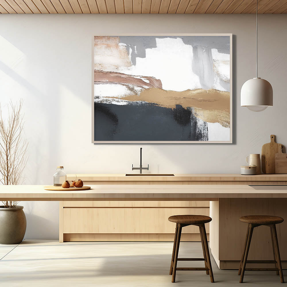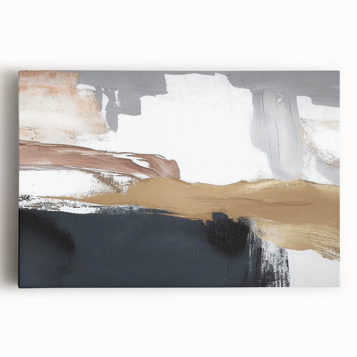 Bring modern elegance to your space with this Contemporary Abstract Strokes and Lines Art. This striking piece features a sophisticated blend of beige, gold, and black brush strokes, creating a dynamic and visually appealing composition. The soft, neutral tones are beautifully contrasted by bold, dark accents, making it an ideal choice for those who appreciate refined yet impactful artwork.