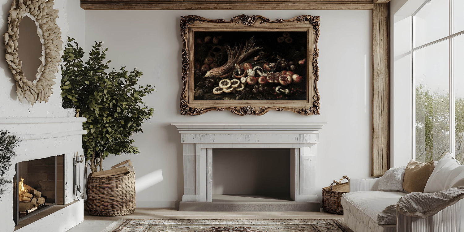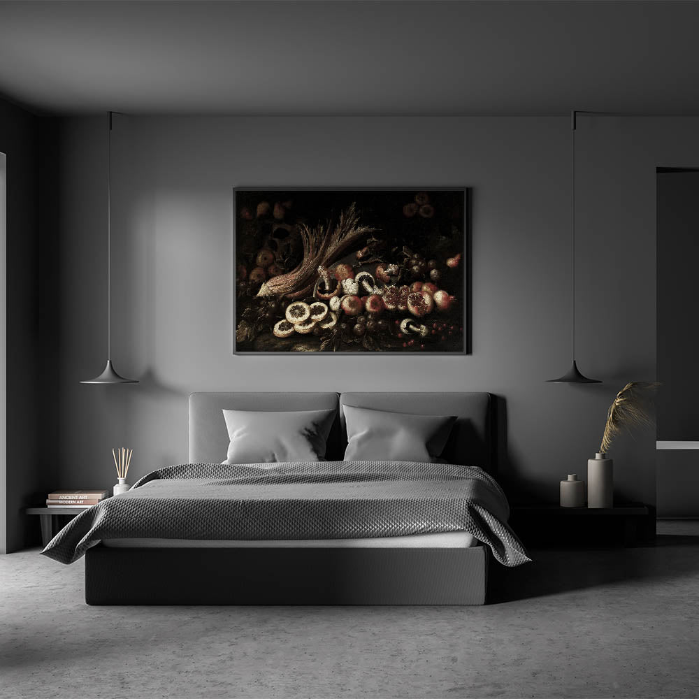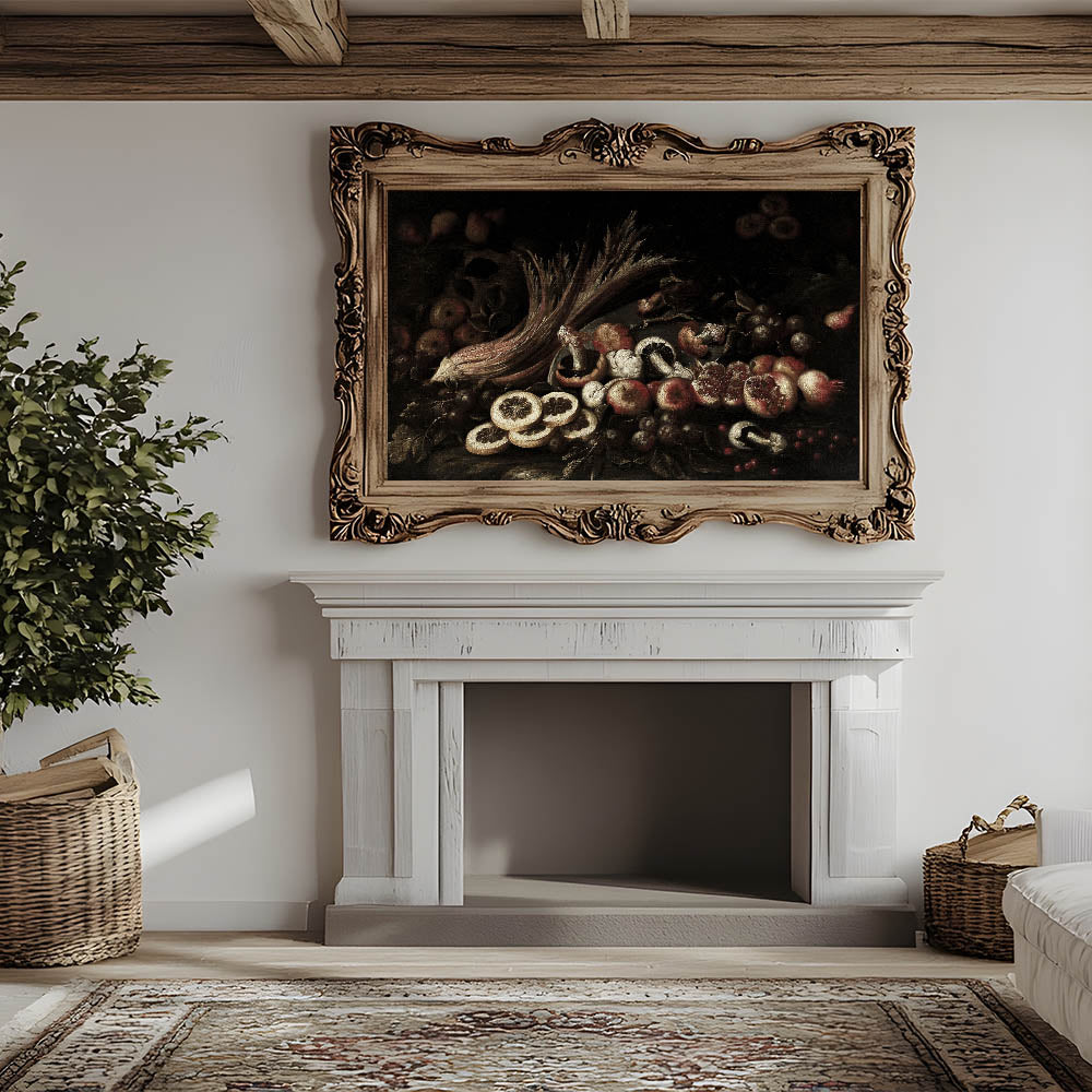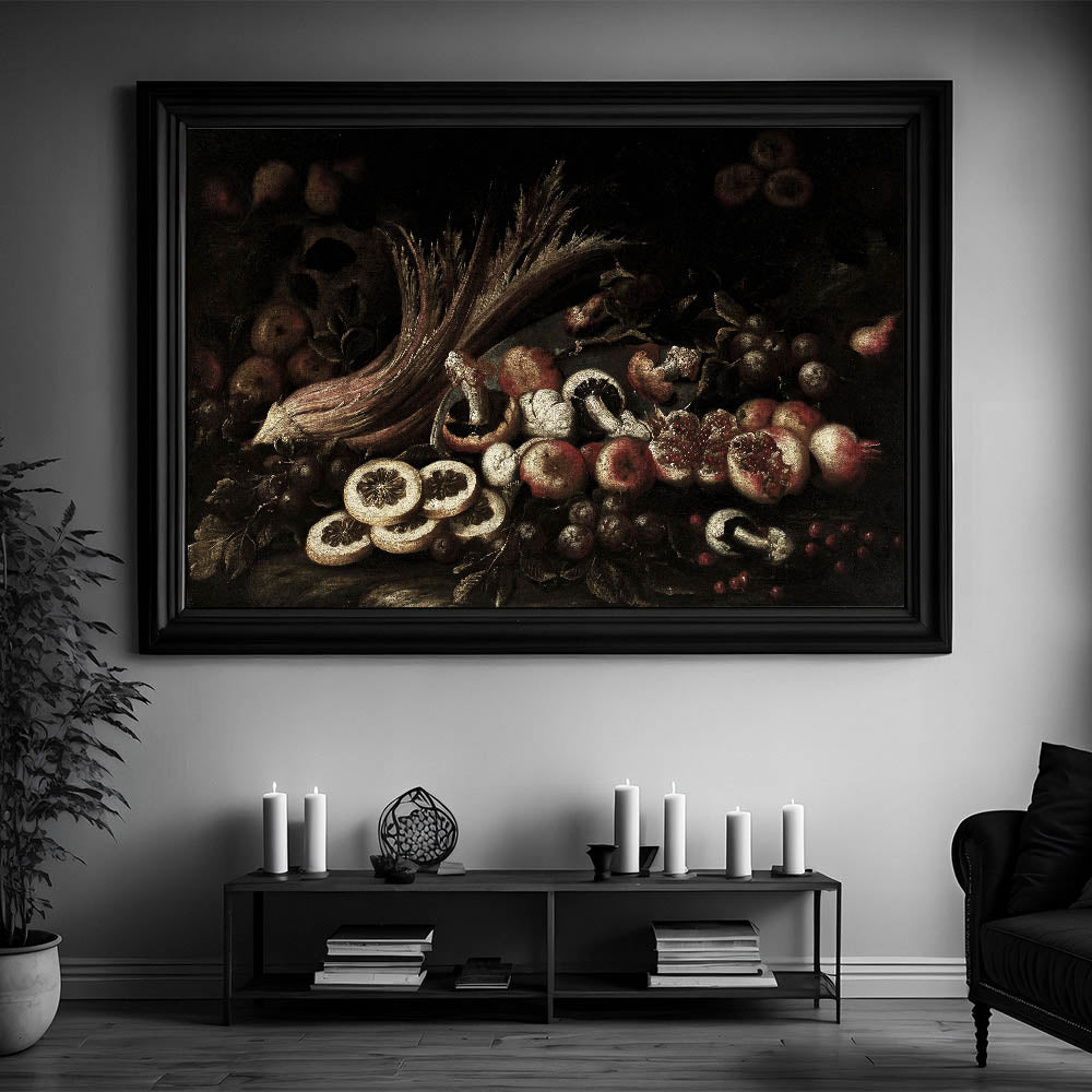 Embrace the timeless charm of classic still life with this Dark Moody wall art, featuring an elegant arrangement of fruits captured in rich, muted tones. The artwork presents a variety of fruits like pomegranates, grapes, and lemons, displayed with rustic details and deep shadows that create a sense of depth and mystery. Perfect for adding an old-world touch to any living space, this piece is ideal for kitchens, dining areas, or studies, bringing a touch of moody elegance and sophistication to your home.