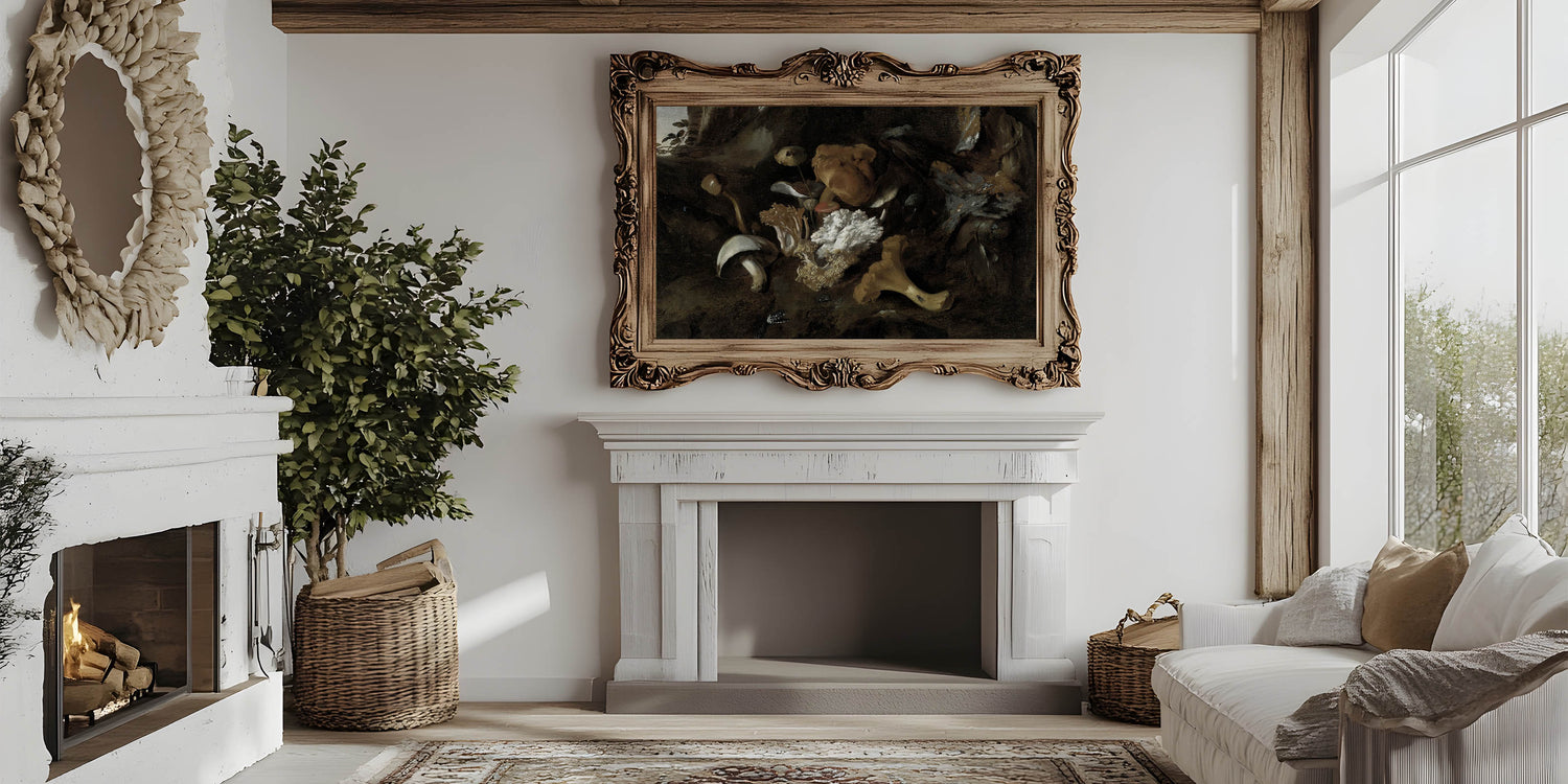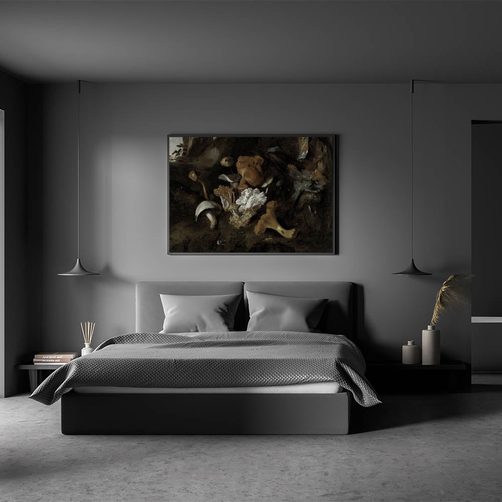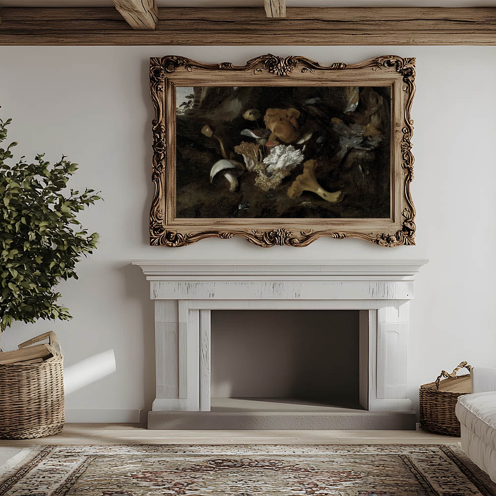Enhance your space with the mysterious allure of this Dark Moody Mushroom Still Life. This atmospheric artwork showcases a variety of mushrooms and fungi, intricately detailed against a shadowy, earthy background. The play of light and dark emphasizes the textures and organic forms, creating a dramatic and immersive botanical scene that is perfect for adding a moody touch to your home decor. Ideal for living rooms, kitchens, or studies, this piece brings the beauty of nature's subtleties into your space.