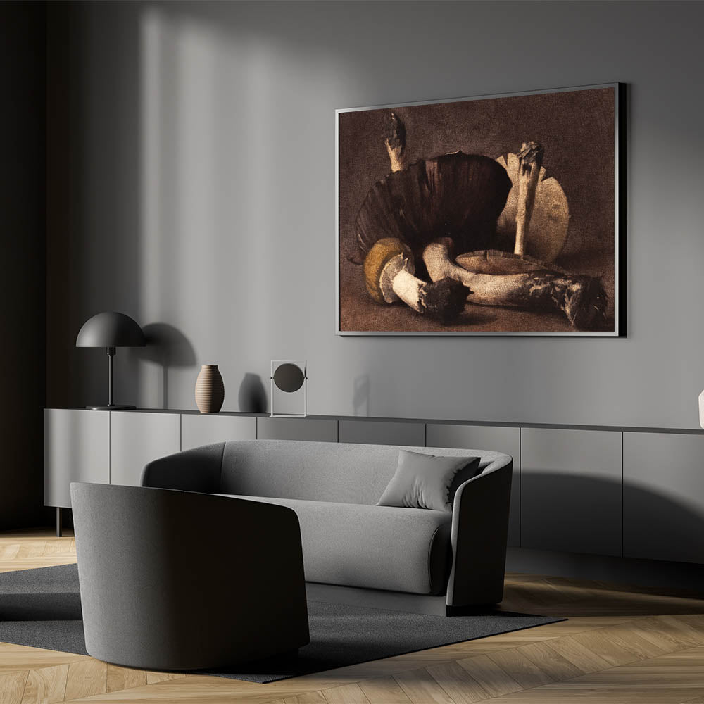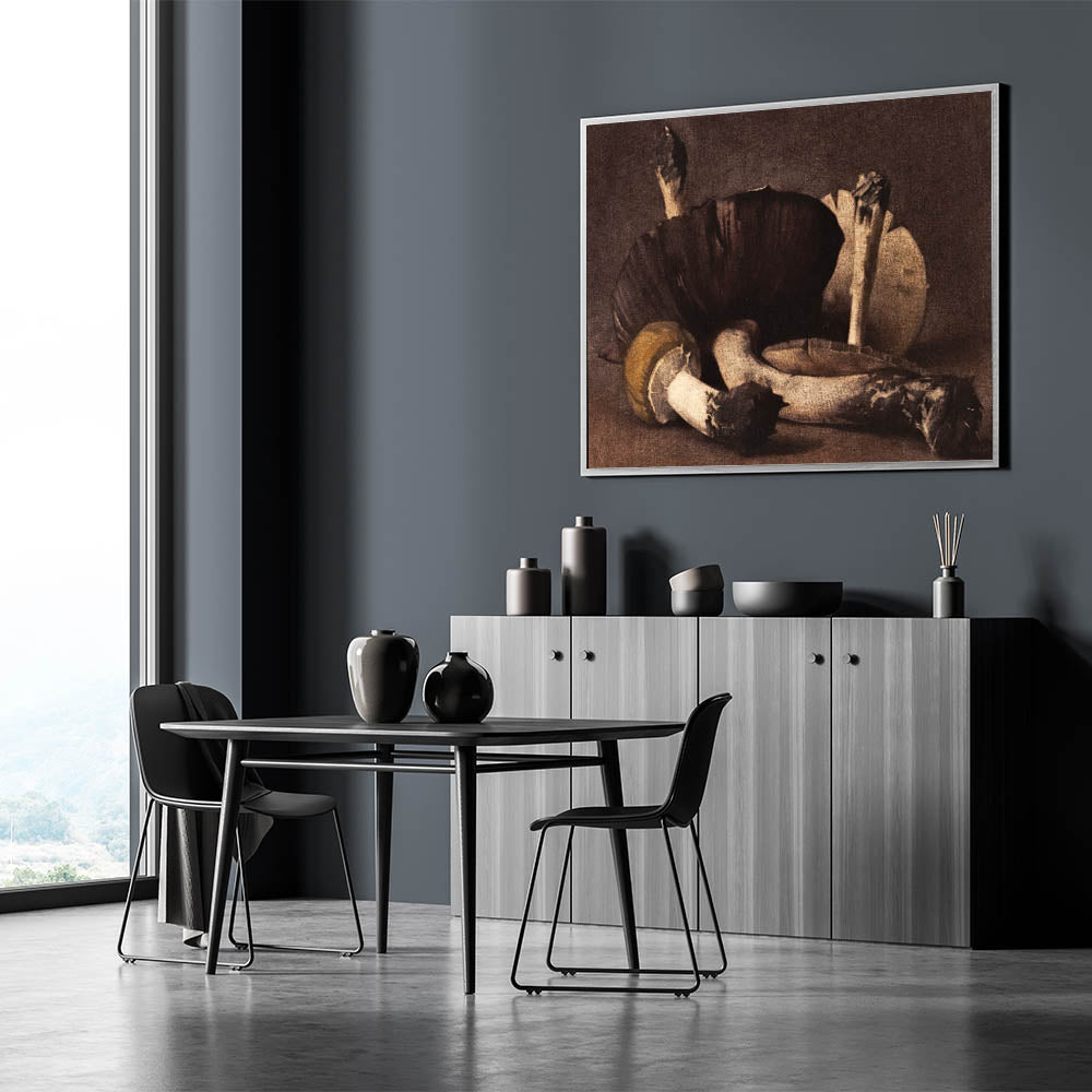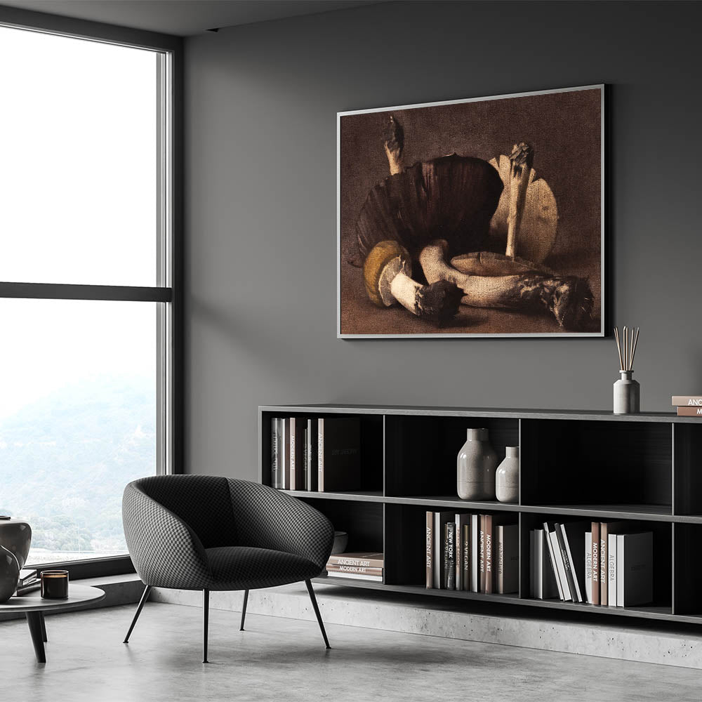 Enhance your space with this evocative Dark Moody Wall Art, featuring a timeless still life of mushrooms. This piece captures the essence of moody art decor, making it a perfect addition to any interior looking for depth and character. The dark, earthy tones create an atmospheric effect, while the subtle play of light and shadow brings out the intricate details of the mushrooms, offering a captivating focal point for your living room, study, or bedroom.