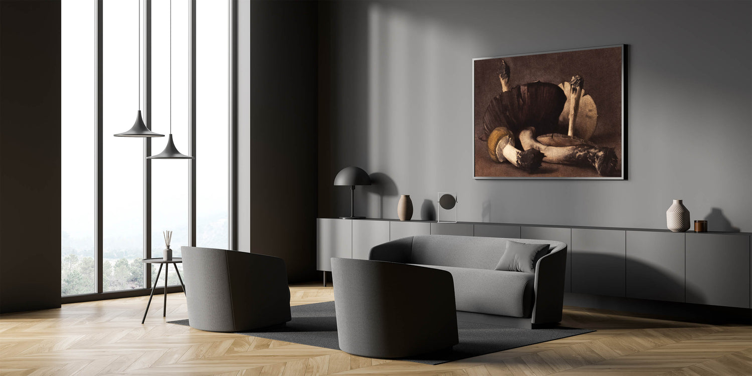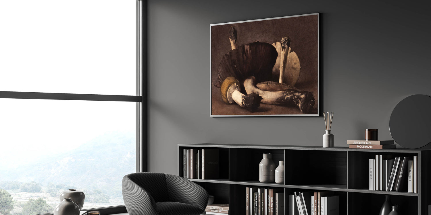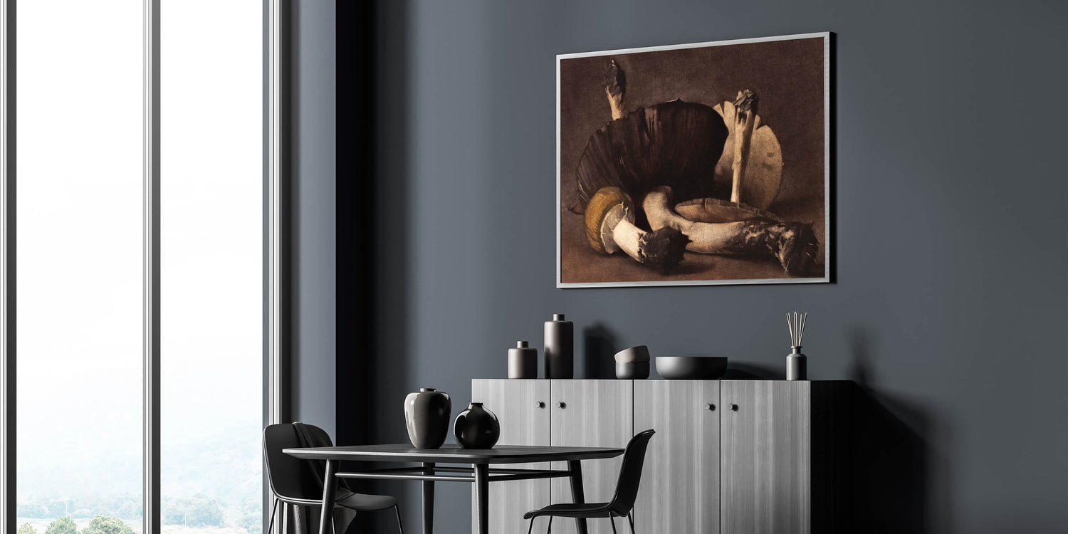 Enhance your space with this evocative Dark Moody Wall Art, featuring a timeless still life of mushrooms. This piece captures the essence of moody art decor, making it a perfect addition to any interior looking for depth and character. The dark, earthy tones create an atmospheric effect, while the subtle play of light and shadow brings out the intricate details of the mushrooms, offering a captivating focal point for your living room, study, or bedroom.