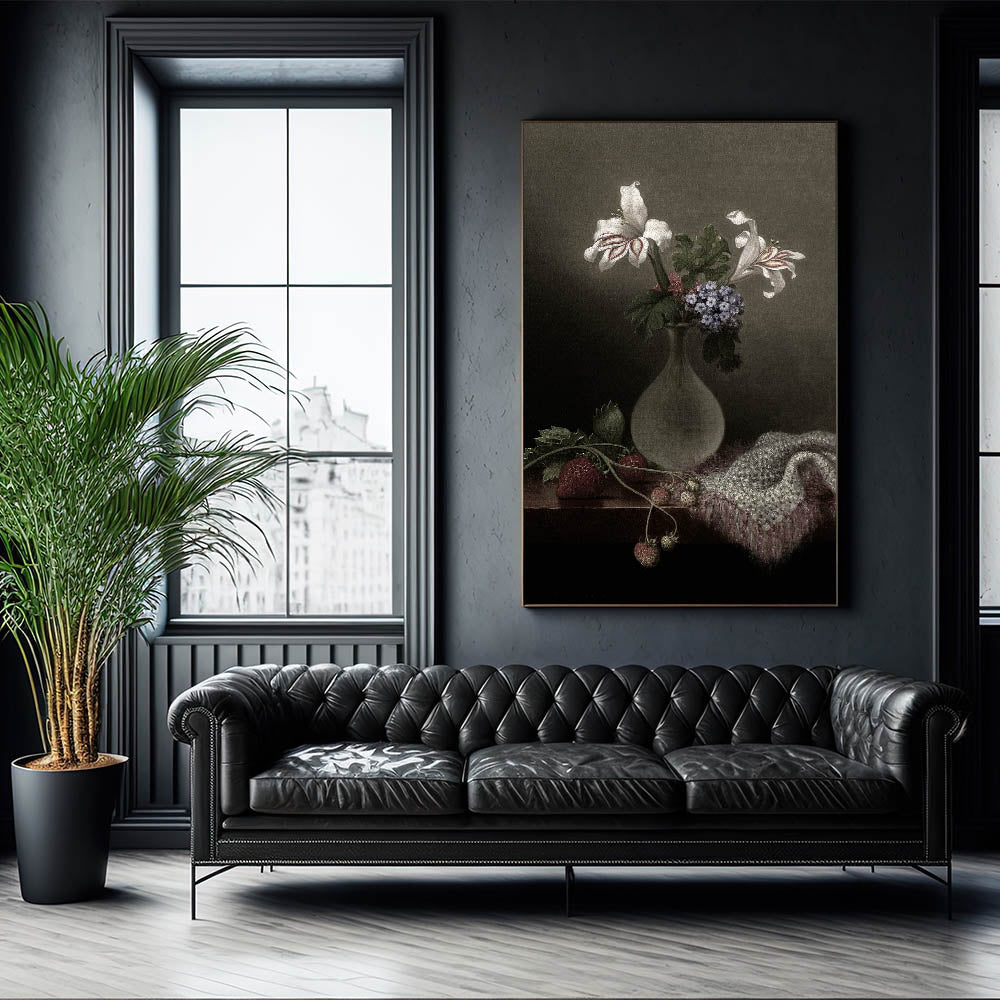 Enhance your space with this captivating Dark Moody Wall Art, featuring a dramatic floral still life that exudes elegance and sophistication. This piece captures the essence of timeless beauty, showcasing delicate flowers in a soft, shadowy arrangement. The dark, atmospheric background adds depth, highlighting the vivid details of the petals, leaves, and accompanying strawberries, which bring an artistic balance to the composition.