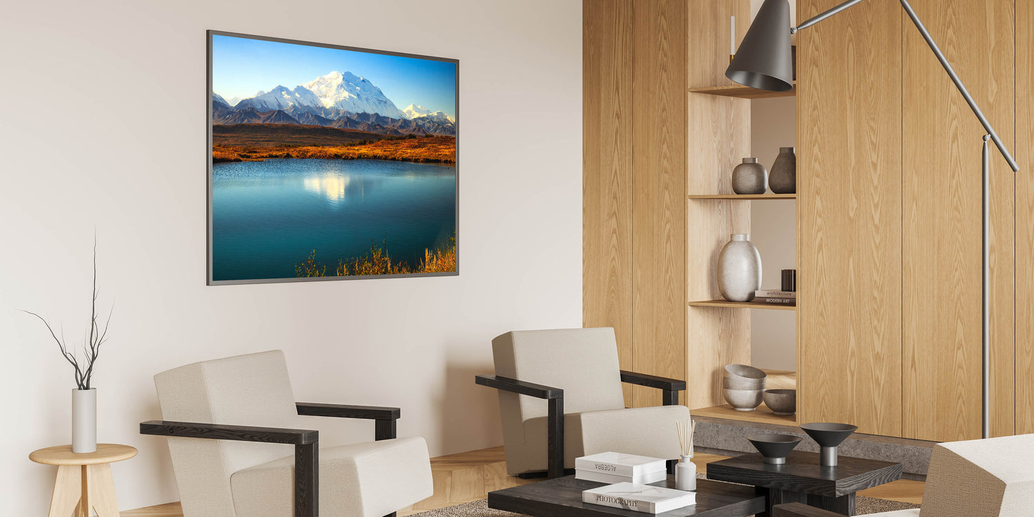 Experience the grandeur of Denali, Alaska’s tallest mountain, with this stunning wall art featuring the iconic snow-capped peaks reflected in a tranquil lake. The rich autumnal tones of the surrounding wilderness add a warm glow to this breathtaking landscape, making it a perfect addition to any home or office decor. This piece captures the essence of Alaska’s untouched beauty, combining the serenity of water with the majesty of towering mountains.