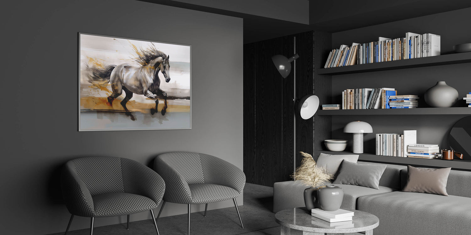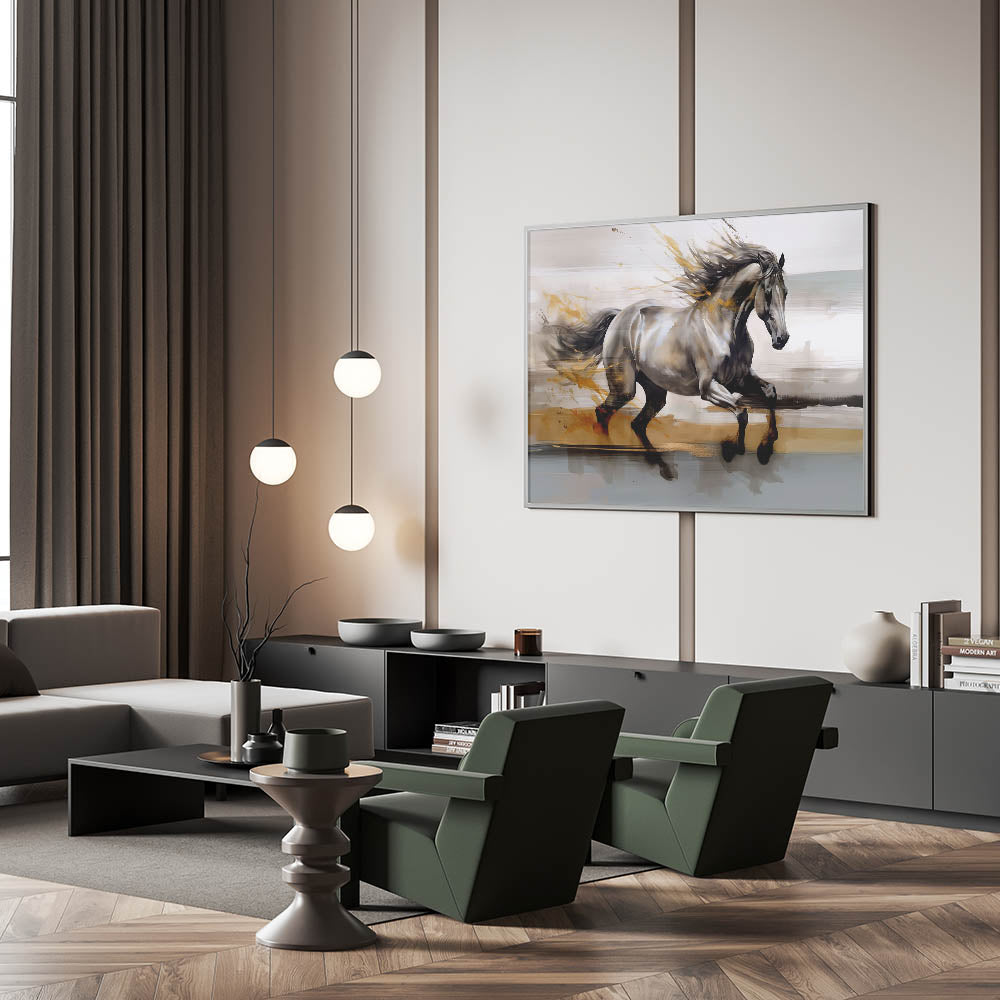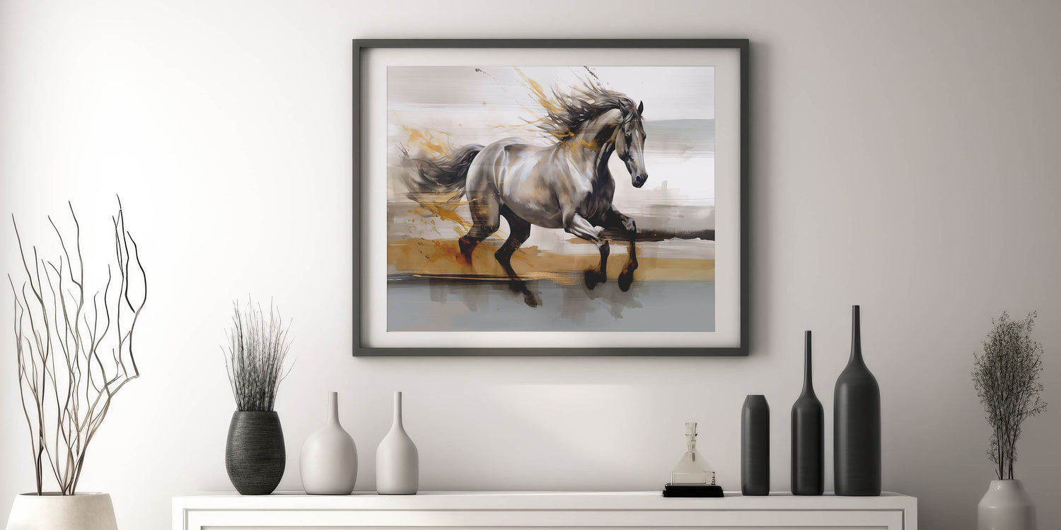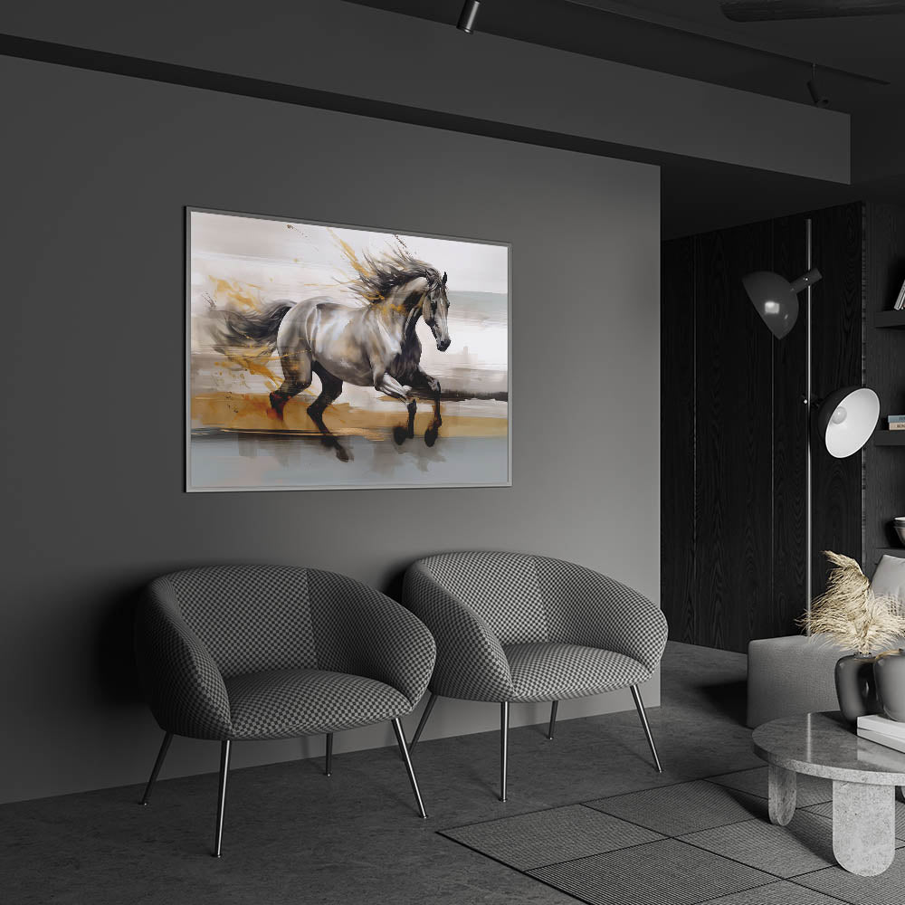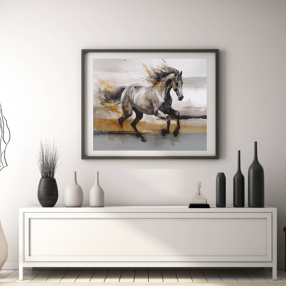 Capture the spirit of freedom and strength with this stunning modern abstract equine artwork. The piece showcases a powerful horse in mid-gallop, brought to life through dynamic brush strokes and rich colors. The blend of deep greys, blacks, and gold accents highlights the horse's muscular form and the energy of its movement. This artwork is perfect for adding a sense of motion and elegance to any room.