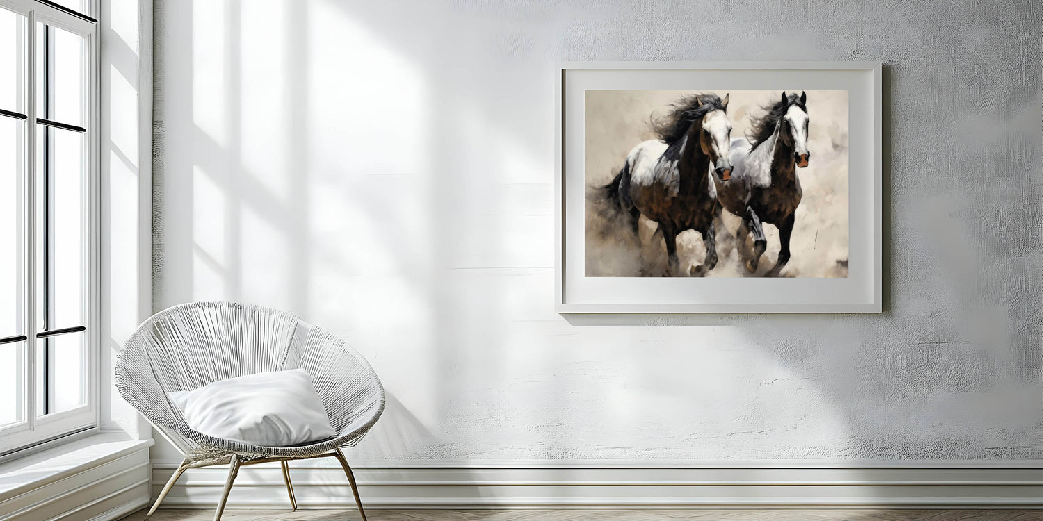 Bring the energy and power of running horses into your space with this stunning wall art. The dynamic movement and intense expressions of the horses create a sense of vitality and strength, making this piece an ideal addition to any room that needs a touch of equestrian majesty. The dusty earth tones add to the realism, making this artwork both captivating and timeless.