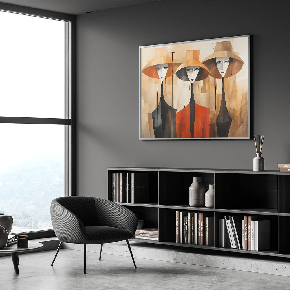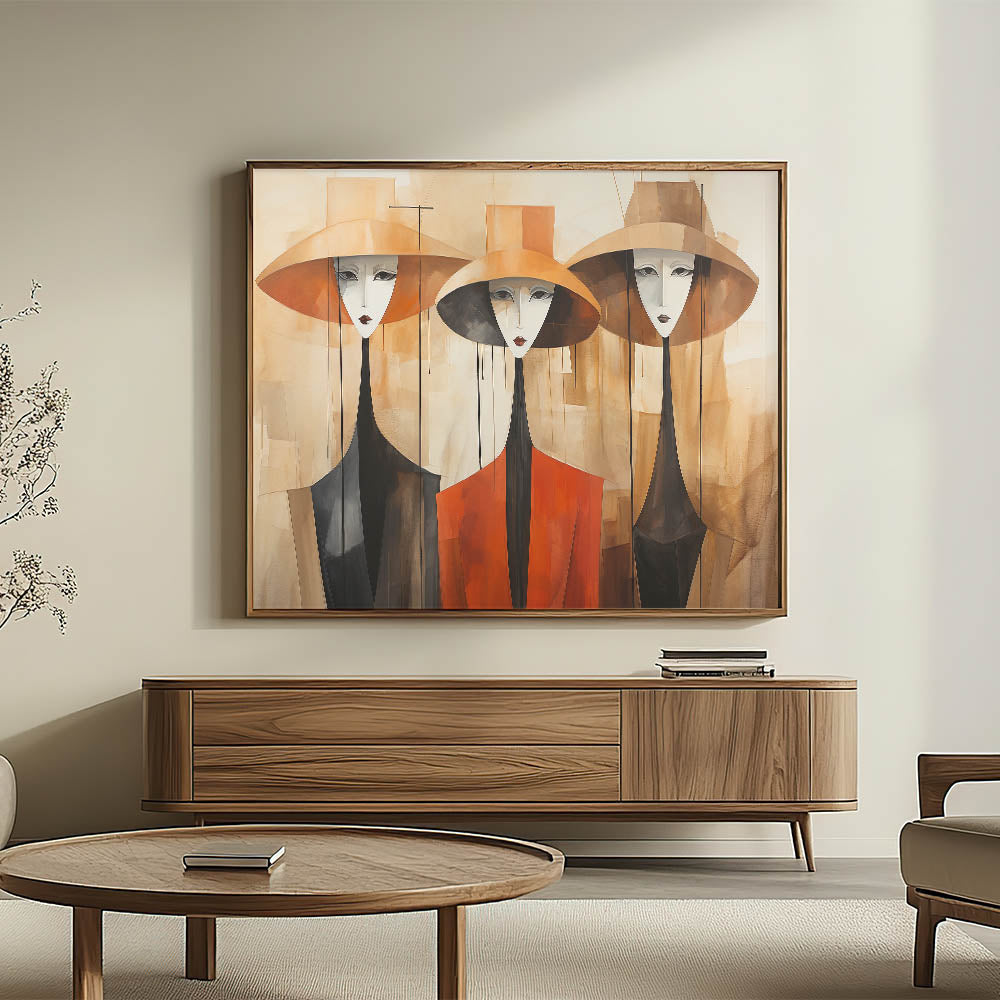 This stunning contemporary figurative abstract art piece features three elegant figures, beautifully rendered in warm tones of orange, brown, and beige. The artist’s use of elongated forms and minimalist details brings a sense of sophistication and intrigue to the composition. Each figure wears a wide-brimmed hat, their expressions serene, creating a harmonious blend of modern style and timeless grace. The warm palette and soft gradients make this artwork a perfect addition to any space seeking a touch of elegance and warmth.