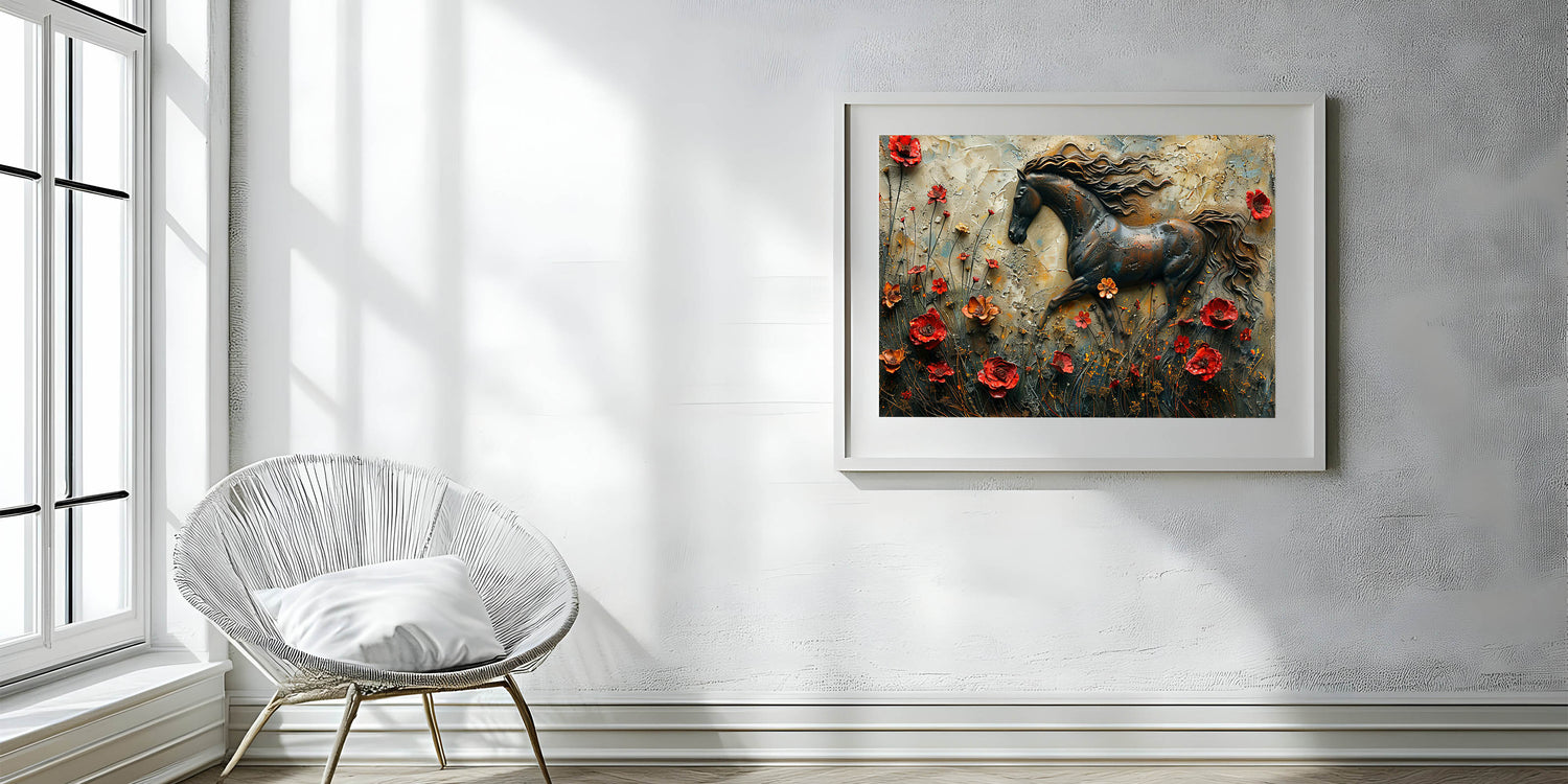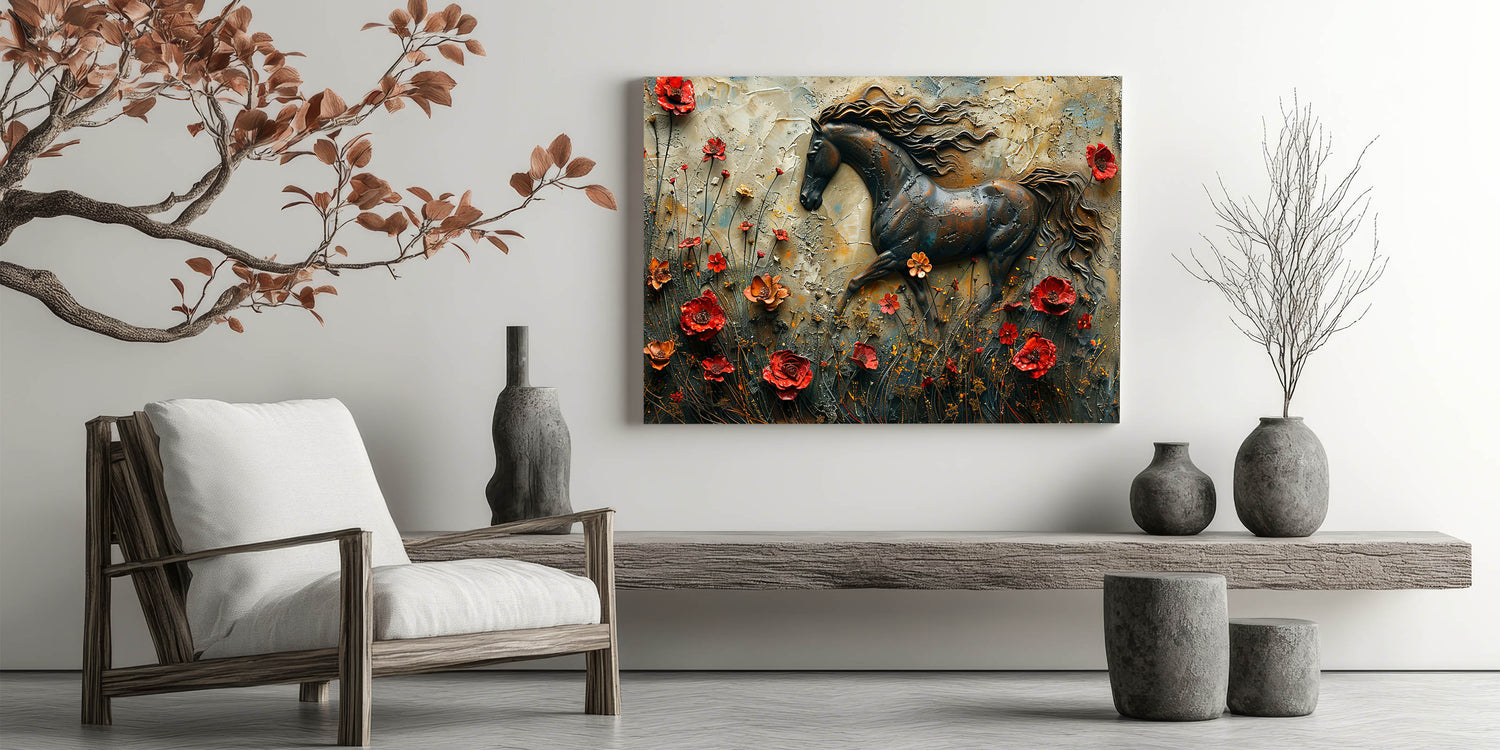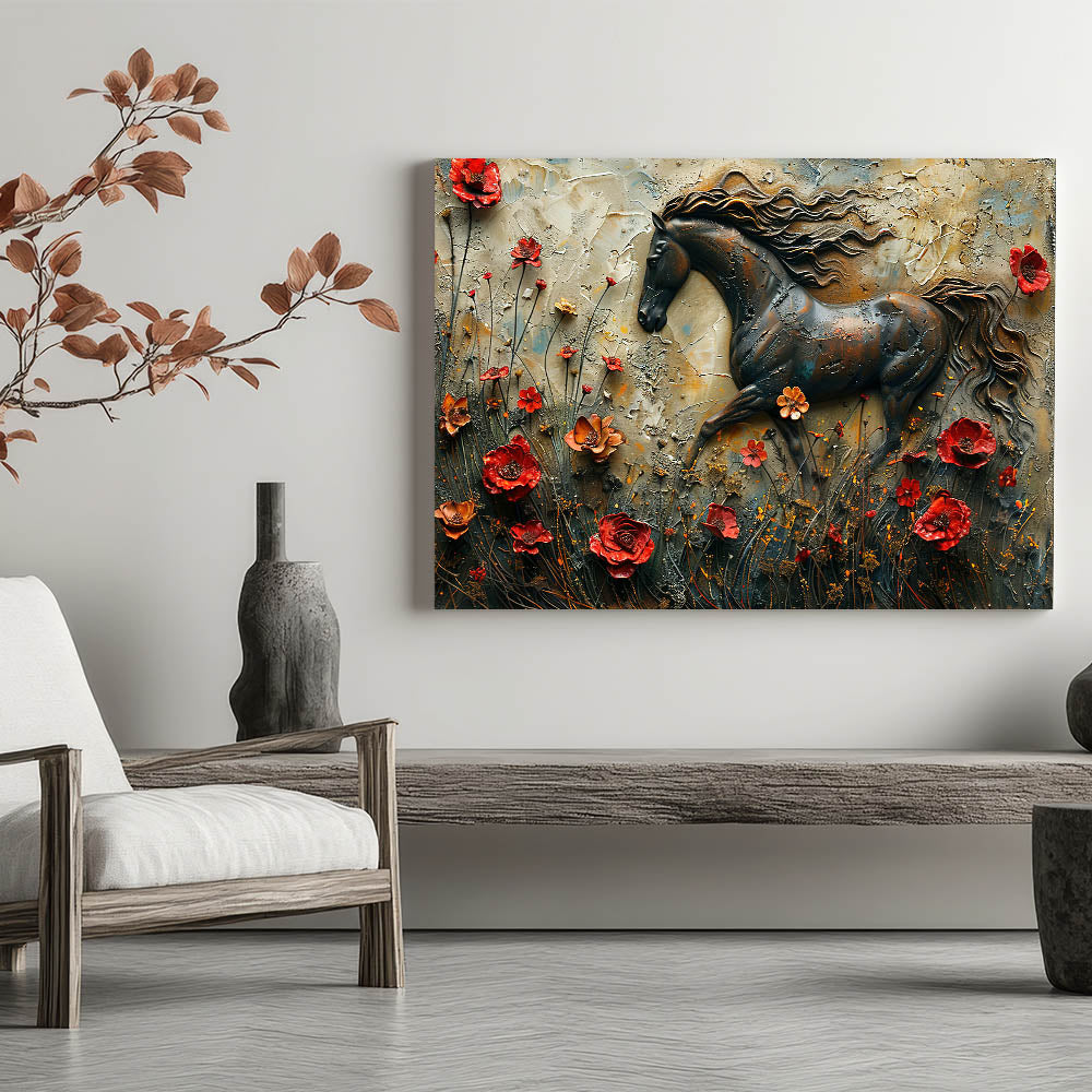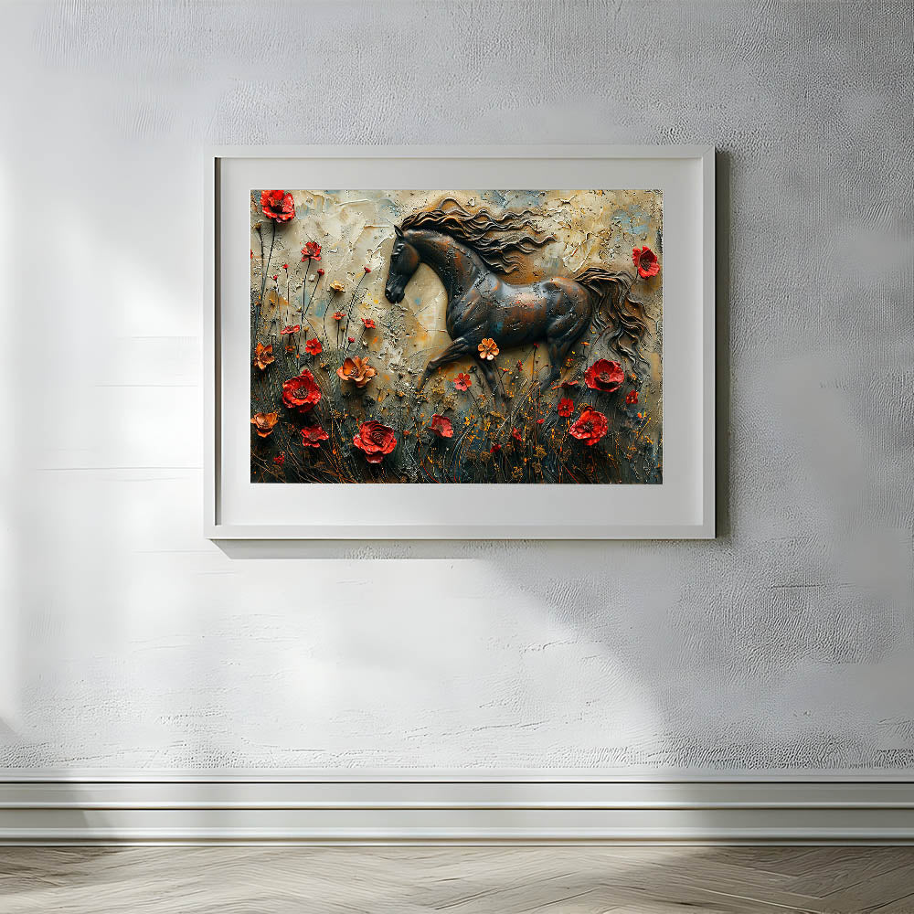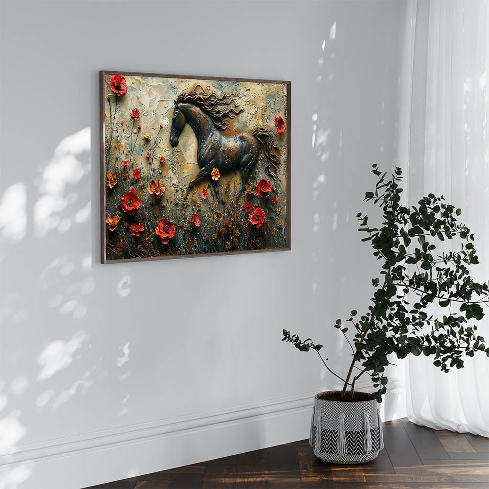 Enhance your space with this exquisite wall art piece featuring a graceful horse galloping through a vibrant floral meadow. The intricate details of the flowers and the textured portrayal of the horse create a stunning visual that is both captivating and elegant. This artwork is perfect for those who appreciate the beauty of nature combined with the majesty of equestrian subjects, bringing a rustic yet refined charm to any room.