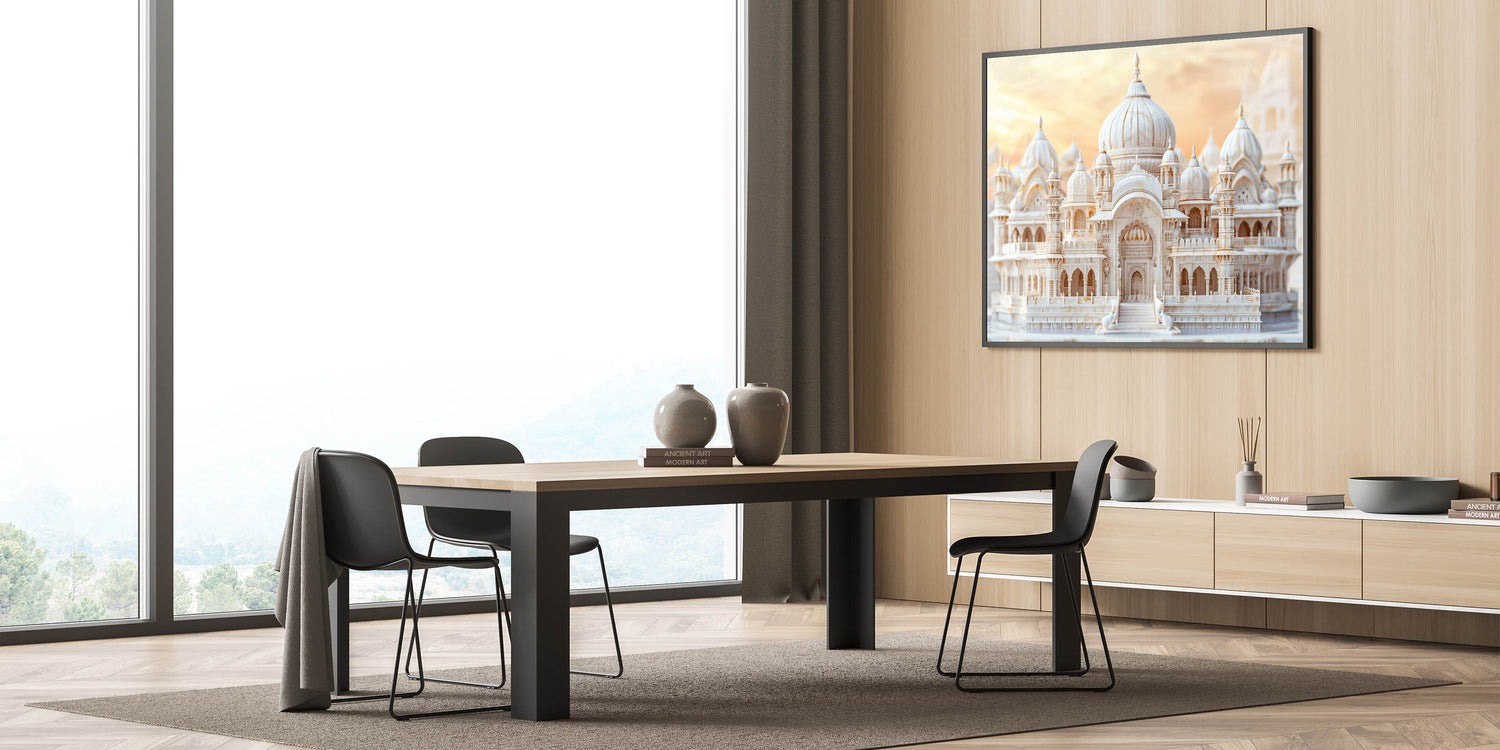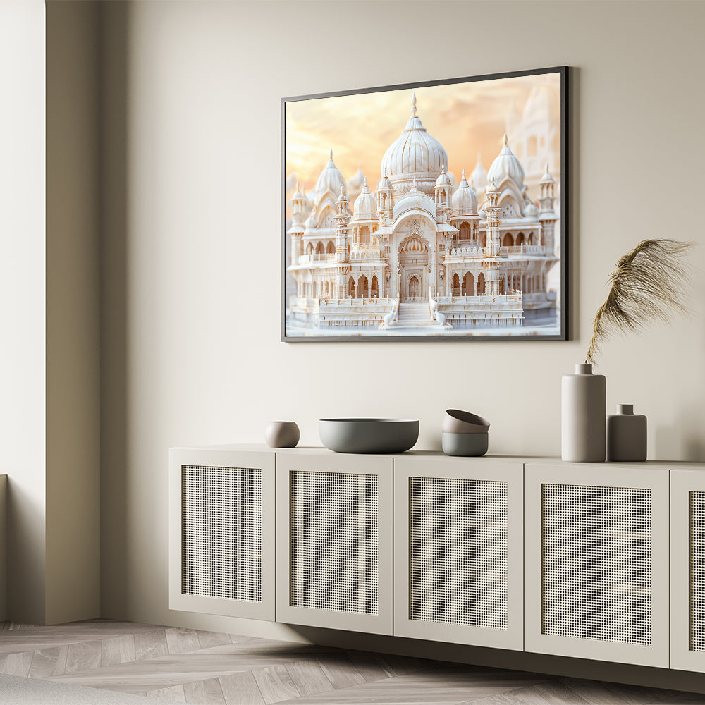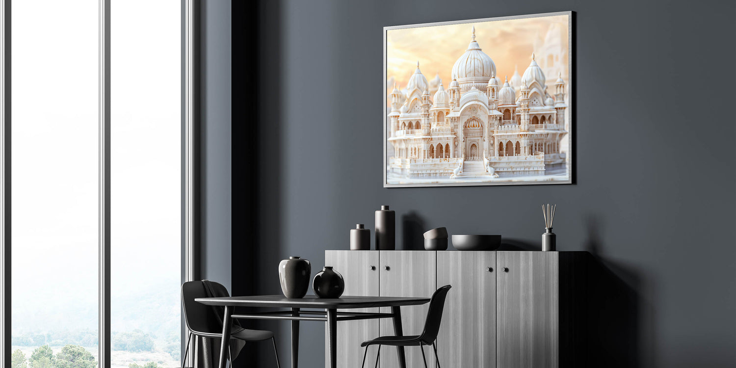 Infuse your space with the opulence of grand architecture through this elegant marble domes wall art. Featuring a stunning palace with intricate domes and detailed carvings, this artwork captures the beauty and craftsmanship of classical design. The soft hues of the marble structure are complemented by the warm glow of the sunset, creating a serene and majestic scene that adds sophistication to any room. Perfect for those who appreciate architectural artistry and luxury, this print is an exquisite addition to any decor.