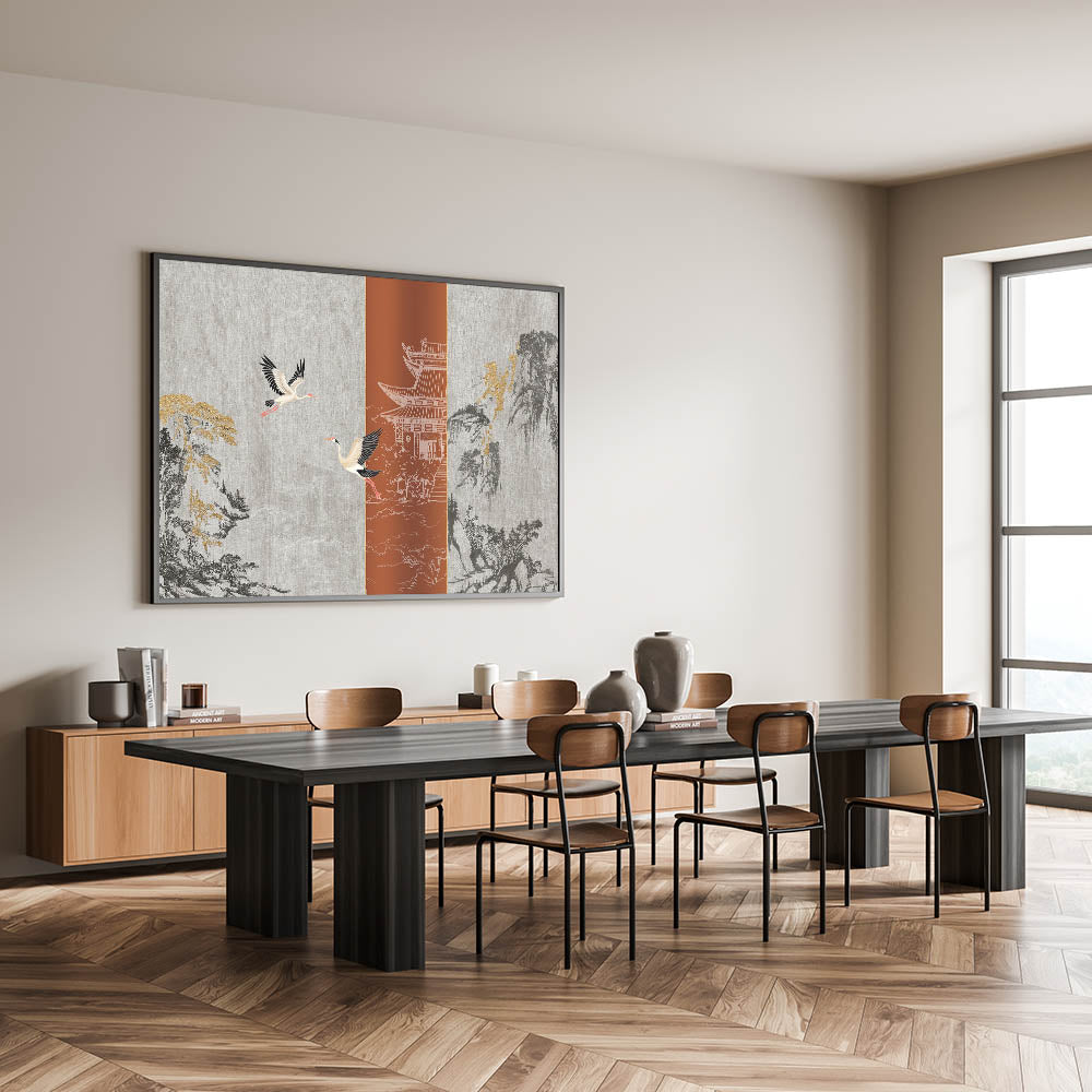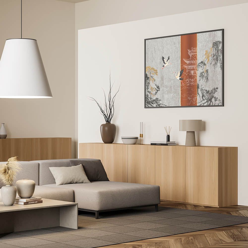Enhance your interior with this elegant Strokes and Lines Abstract Art. This artwork features a beautiful blend of dynamic strokes and intricate line patterns, capturing a serene scene with flying cranes and traditional architectural elements. The detailed design and harmonious color palette make it a perfect addition to any contemporary or classic decor.