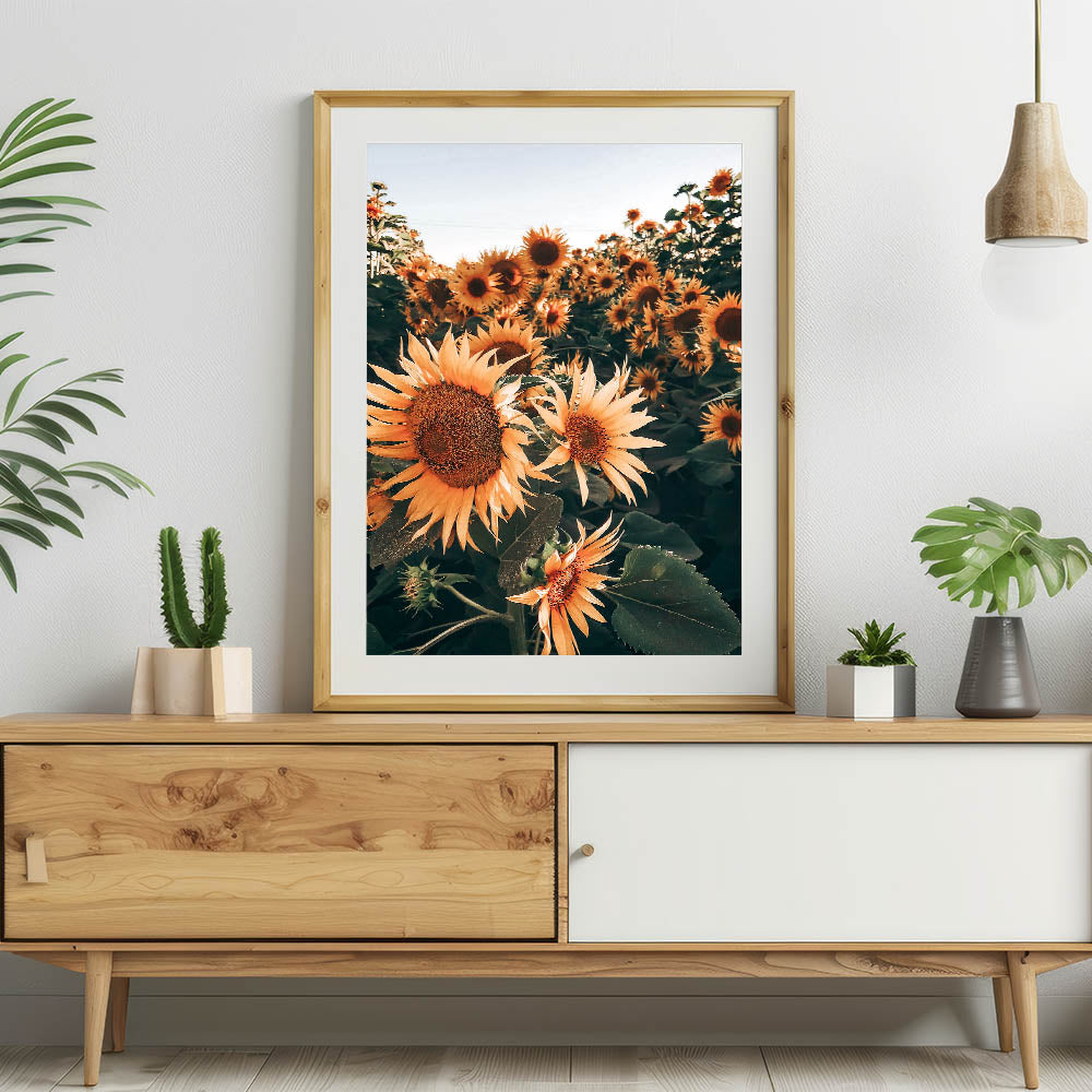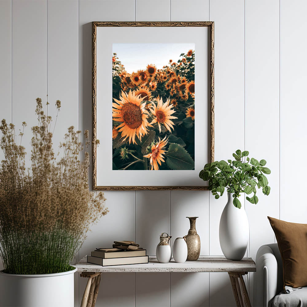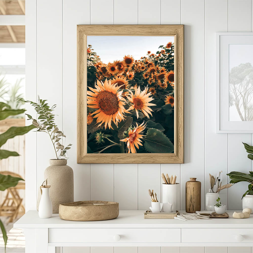 Celebrate the vibrant beauty of nature with this stunning sunflowers in bloom wall art, perfect for creating a warm, rustic atmosphere in your home. This photograph captures the essence of a field of sunflowers basking in the sunlight, evoking the charm of the countryside and the beauty of rural life. The deep earthy tones and vivid yellows make this piece a timeless addition to any farmhouse decor.