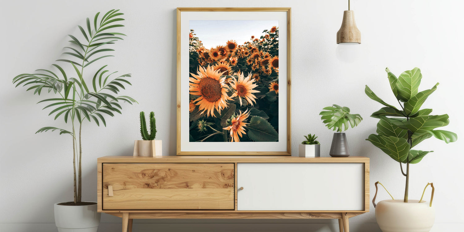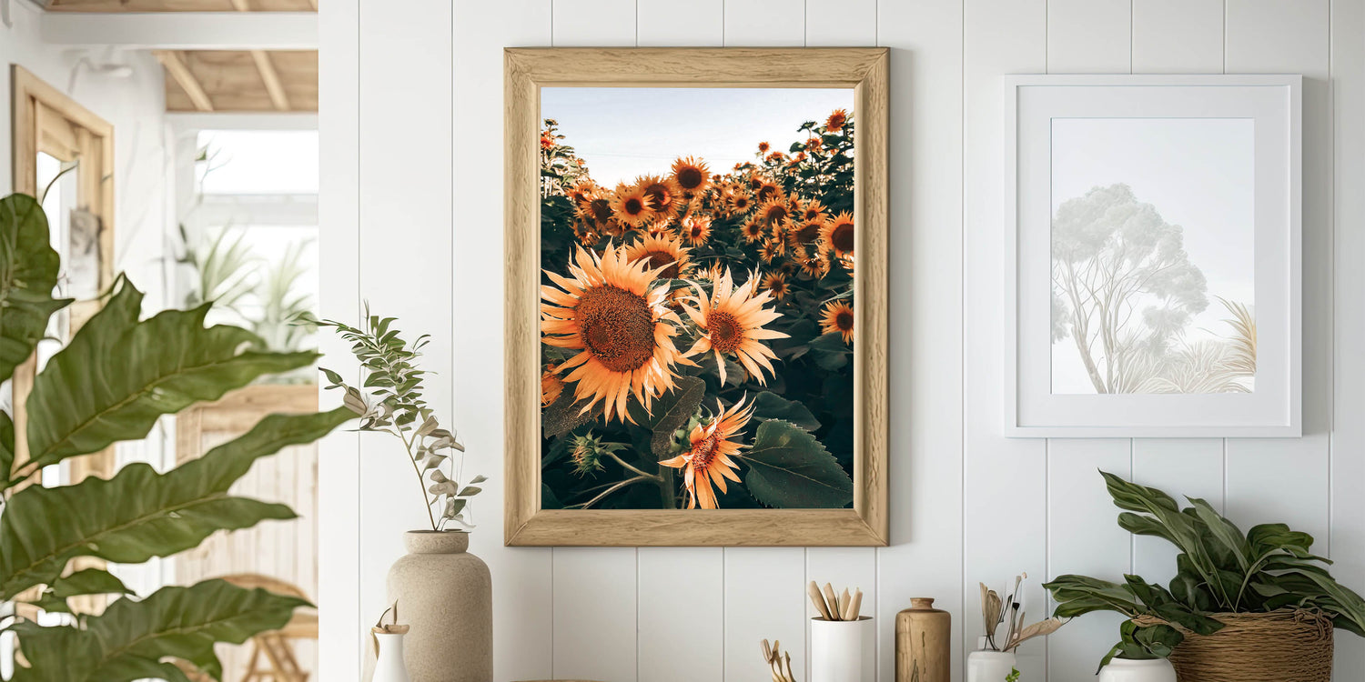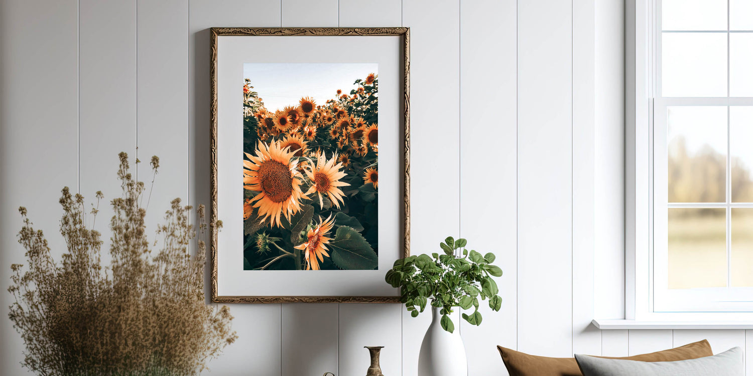 Celebrate the vibrant beauty of nature with this stunning sunflowers in bloom wall art, perfect for creating a warm, rustic atmosphere in your home. This photograph captures the essence of a field of sunflowers basking in the sunlight, evoking the charm of the countryside and the beauty of rural life. The deep earthy tones and vivid yellows make this piece a timeless addition to any farmhouse decor.