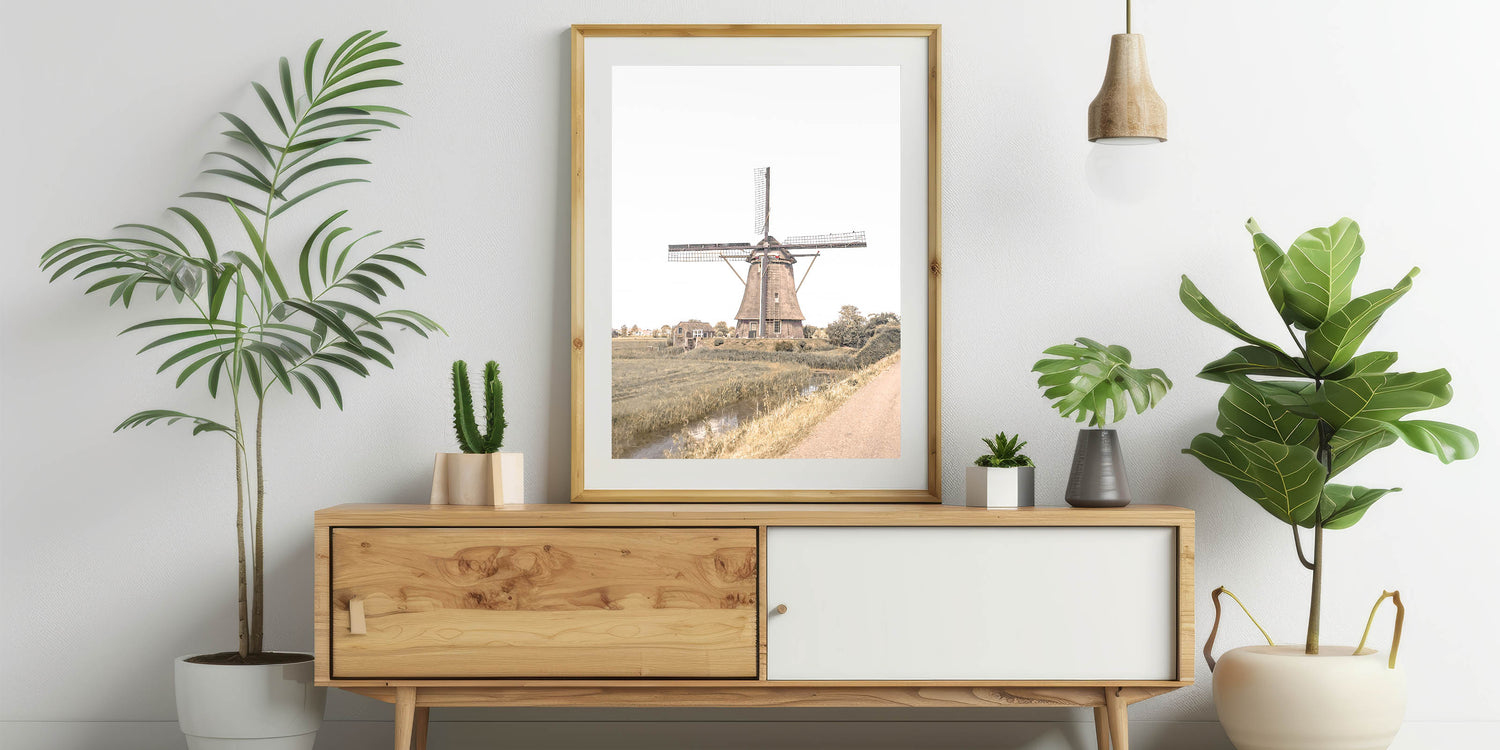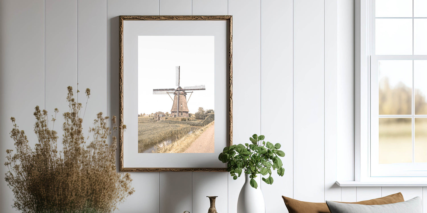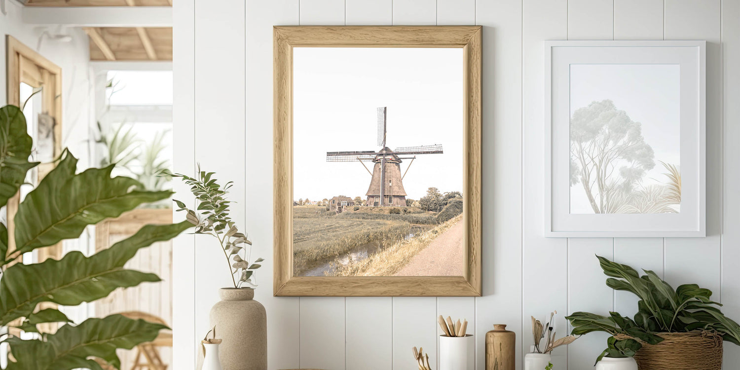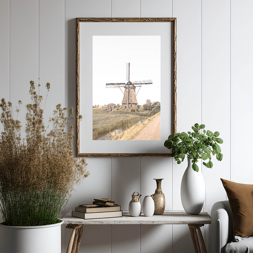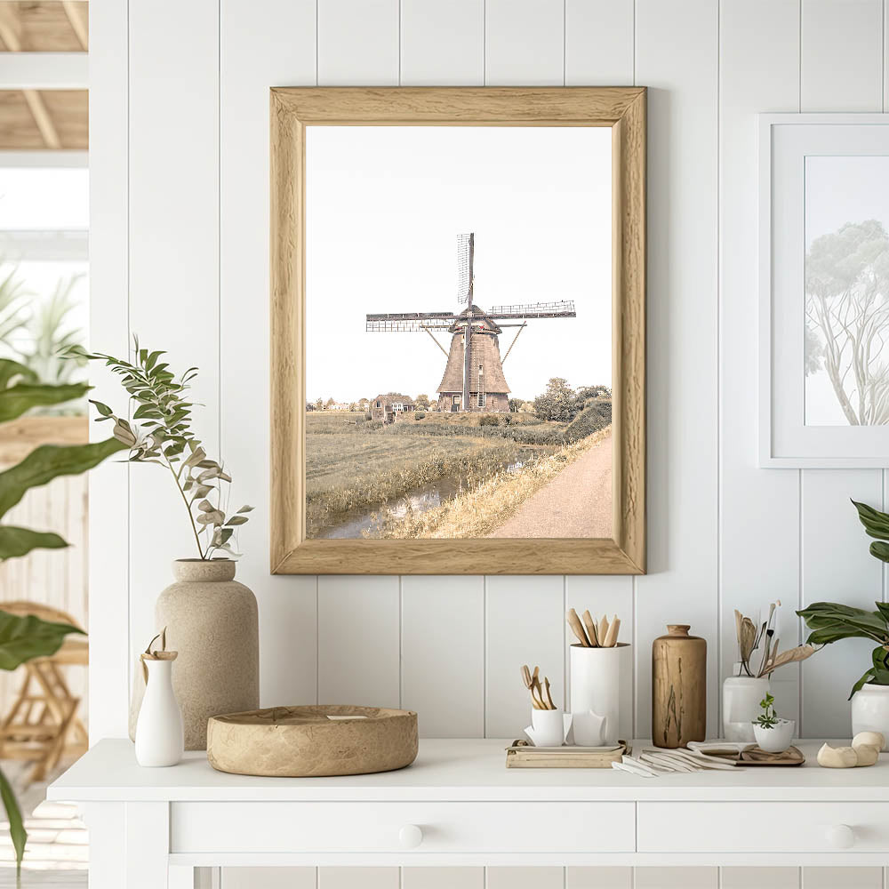 - Rustic charm with a serene windmill and canal scene, ideal for any room