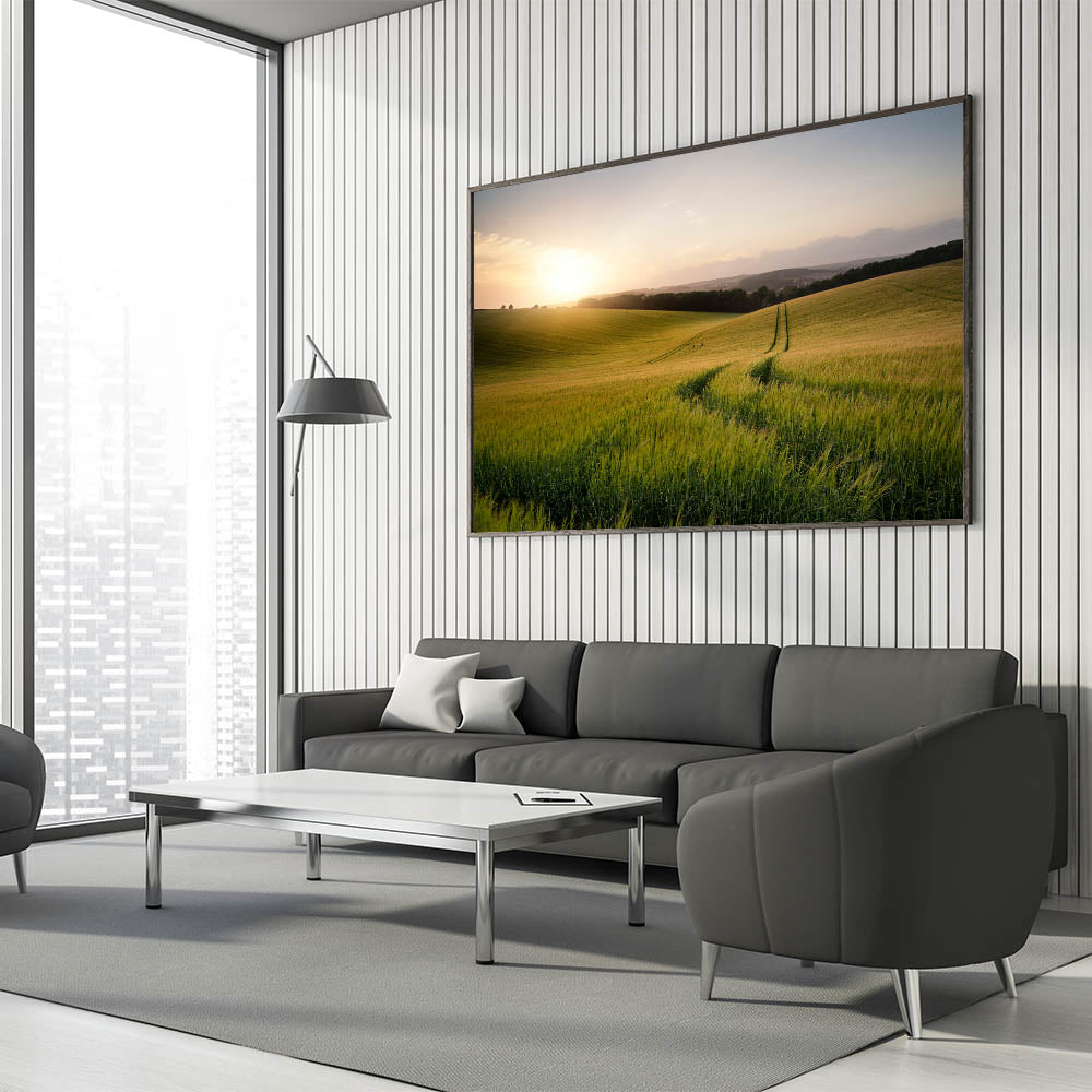 Immerse yourself in the tranquil beauty of nature with this stunning fields landscape acrylic print, capturing the golden hues of wheat fields bathed in the soft light of sunrise. The gentle slopes of the rolling hills and the warm glow of the morning sun create a serene and peaceful atmosphere, perfect for bringing a touch of calm and natural beauty into any room. Available in multiple formats, including stretched canvas, framed canvas, and acrylic glass, this artwork is a timeless addition to your home decor.