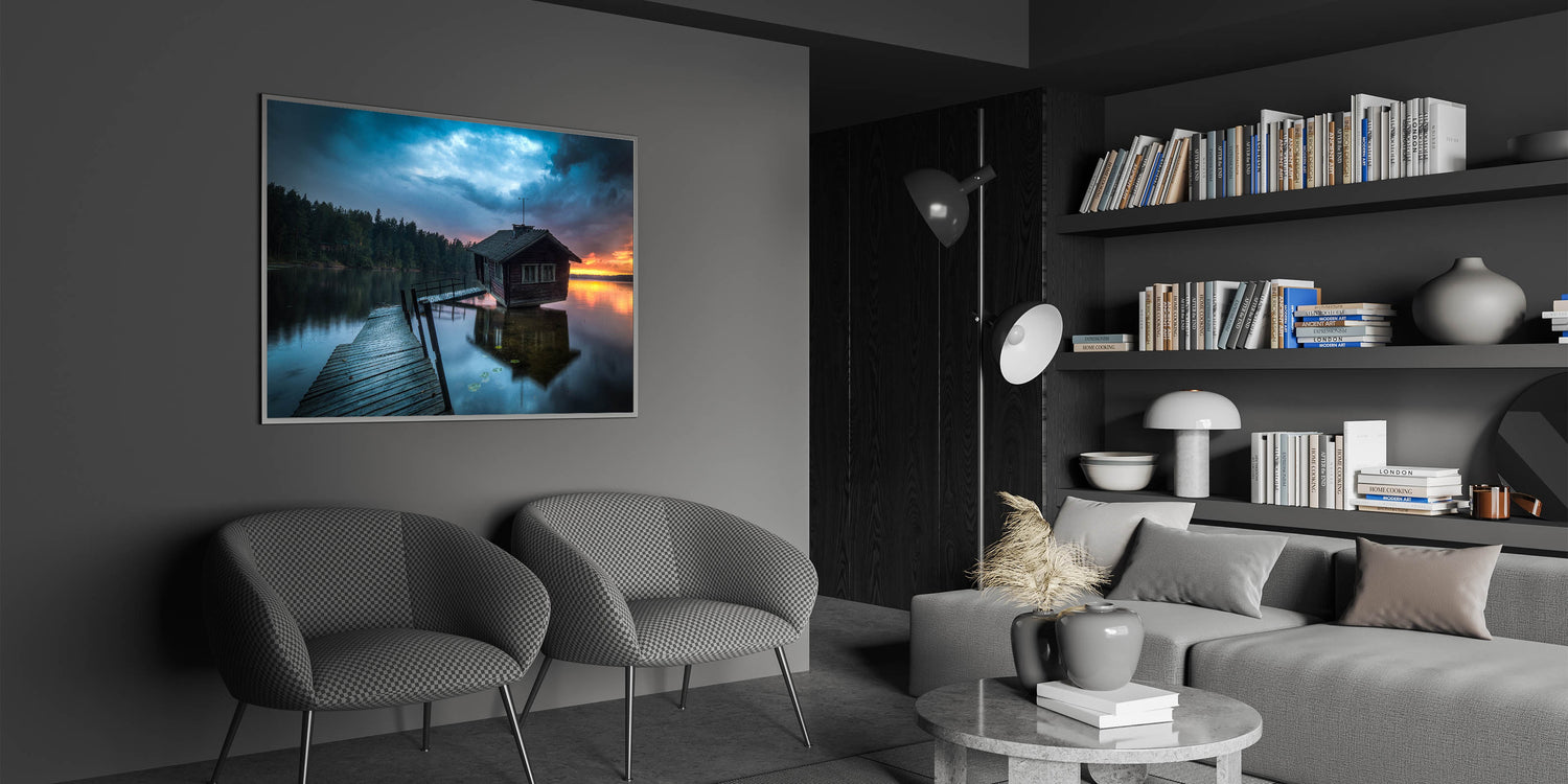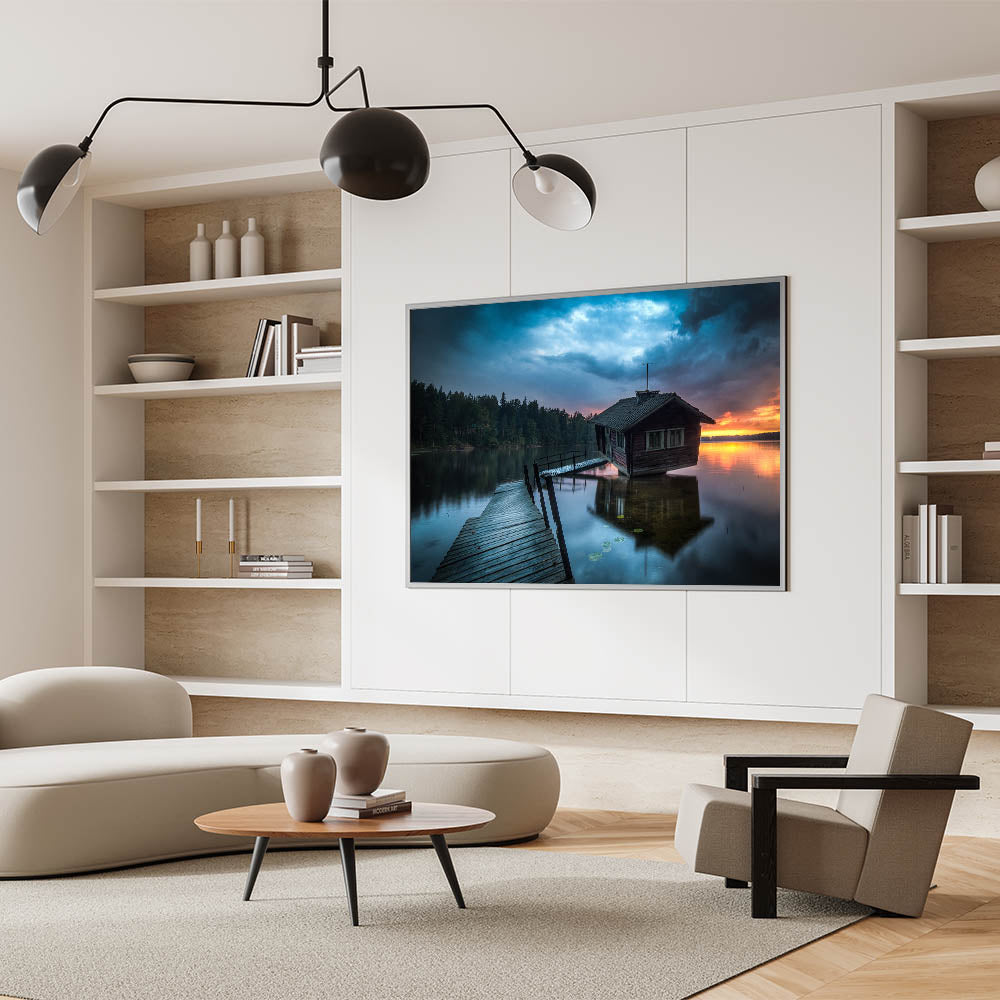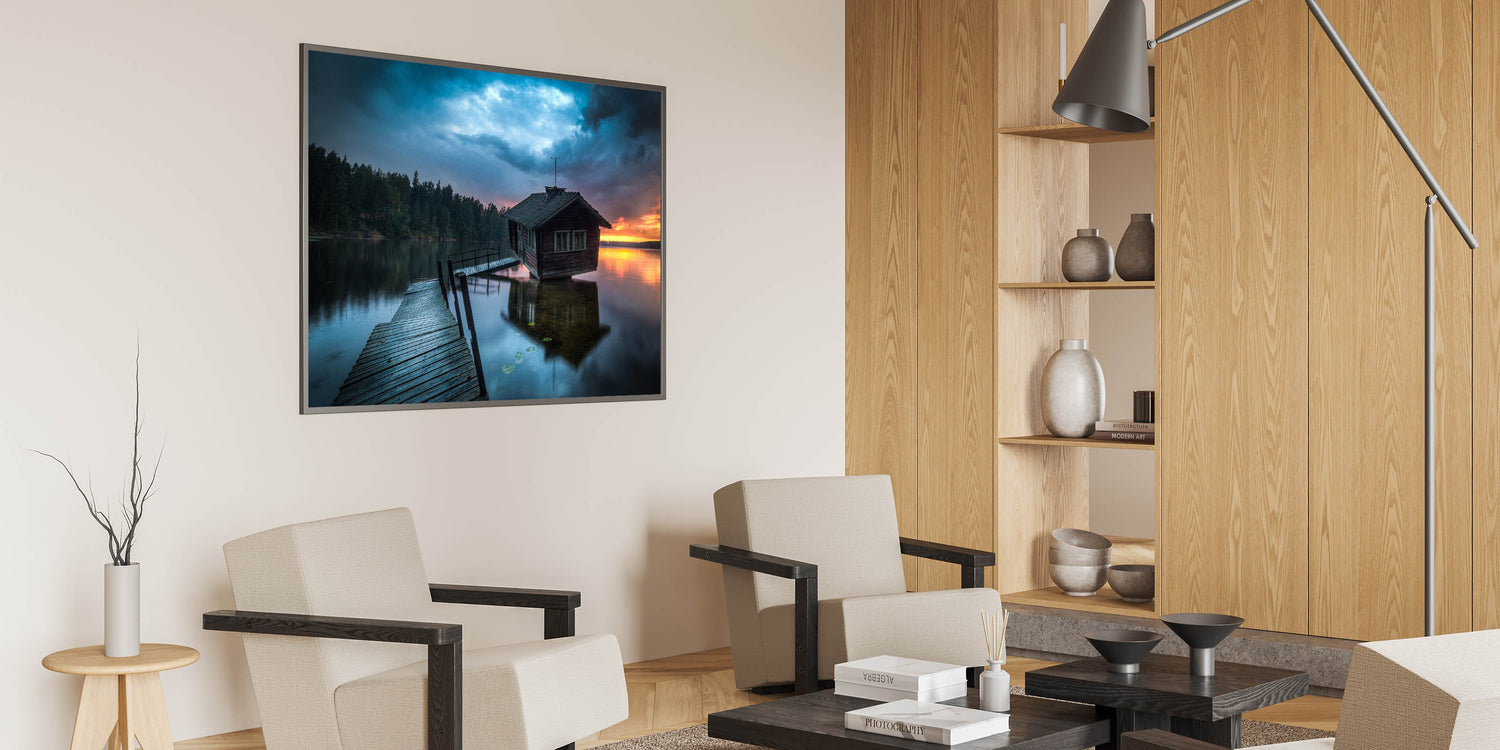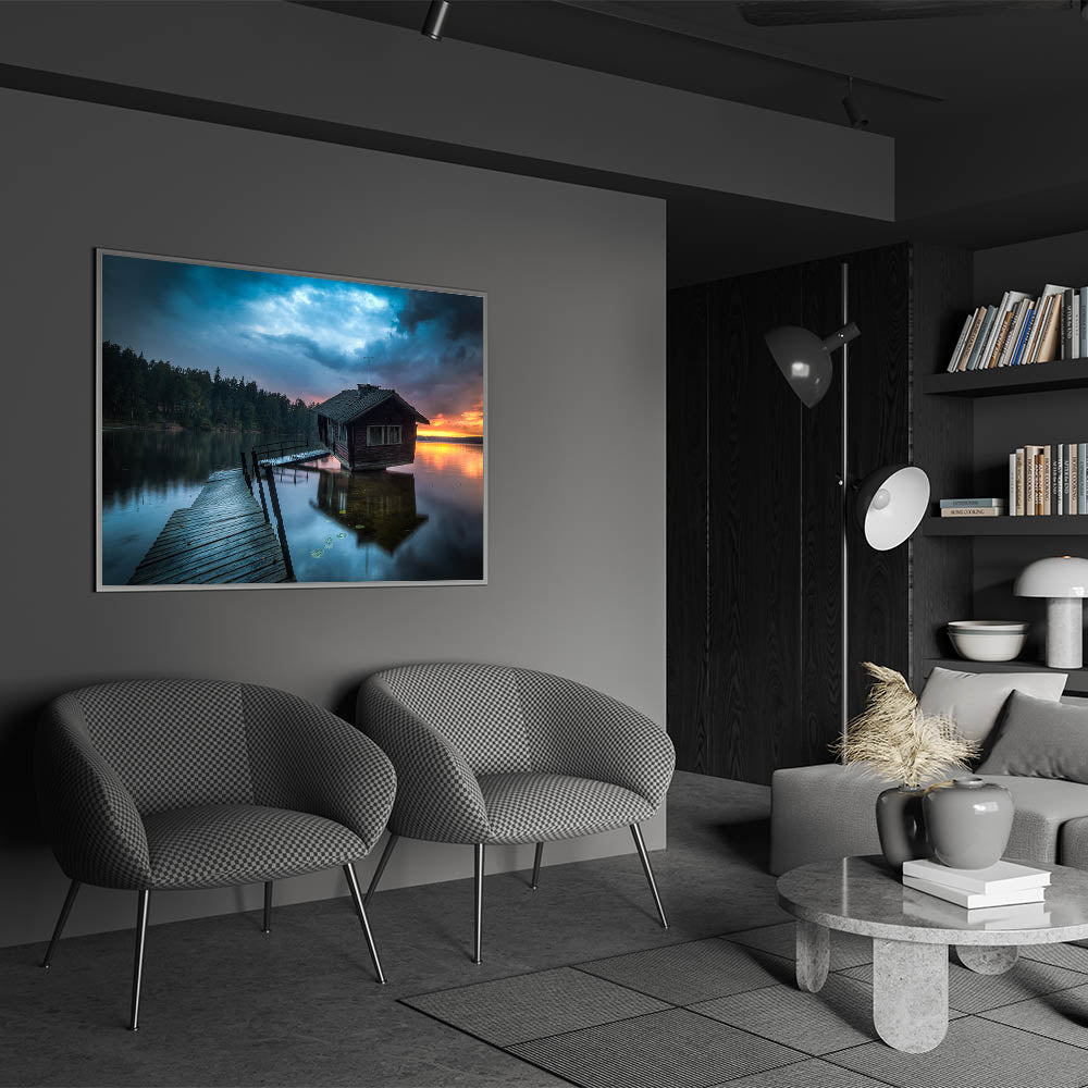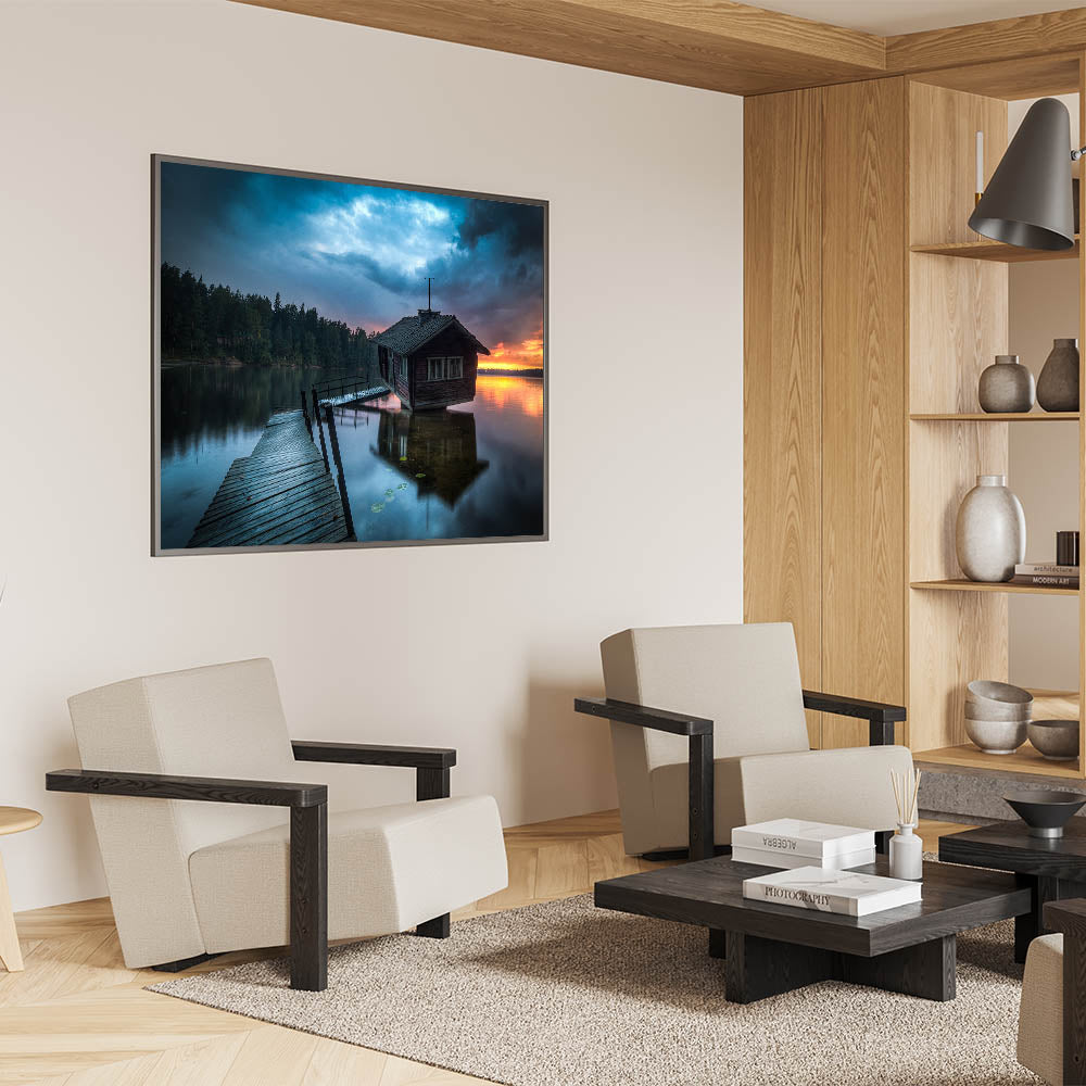 Bring the enchanting and mysterious beauty of Finland’s lakeside scenery into your home with this stunning wall art. This artwork captures a tranquil cabin resting on the still waters of a lake, with the soft glow of the sunset reflecting on the calm surface. The dark clouds and deep blues of the sky create a moody atmosphere, while the setting sun adds warmth and contrast. Perfect for nature lovers and those who appreciate Nordic landscapes, this piece evokes a sense of calm and introspection.