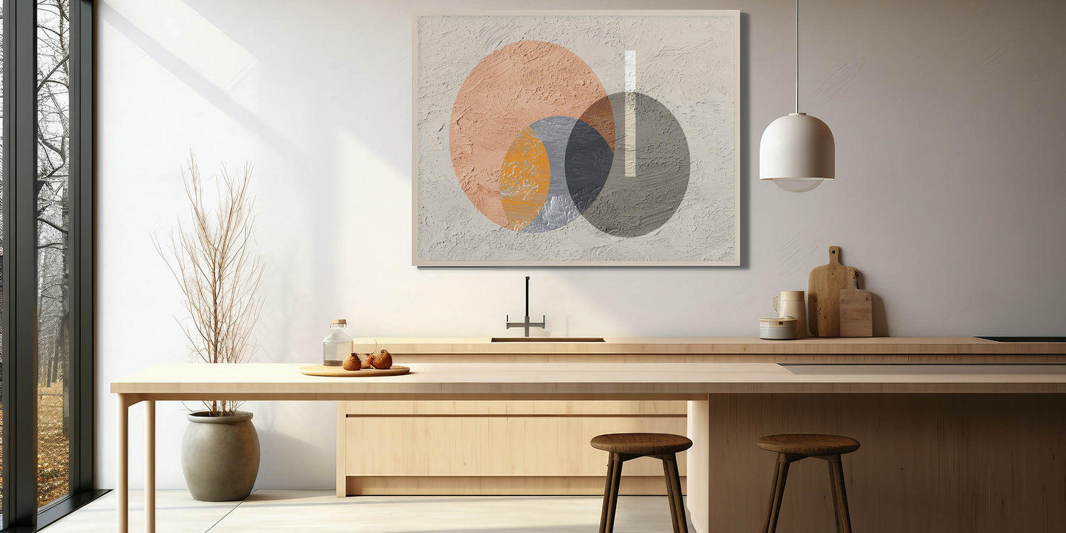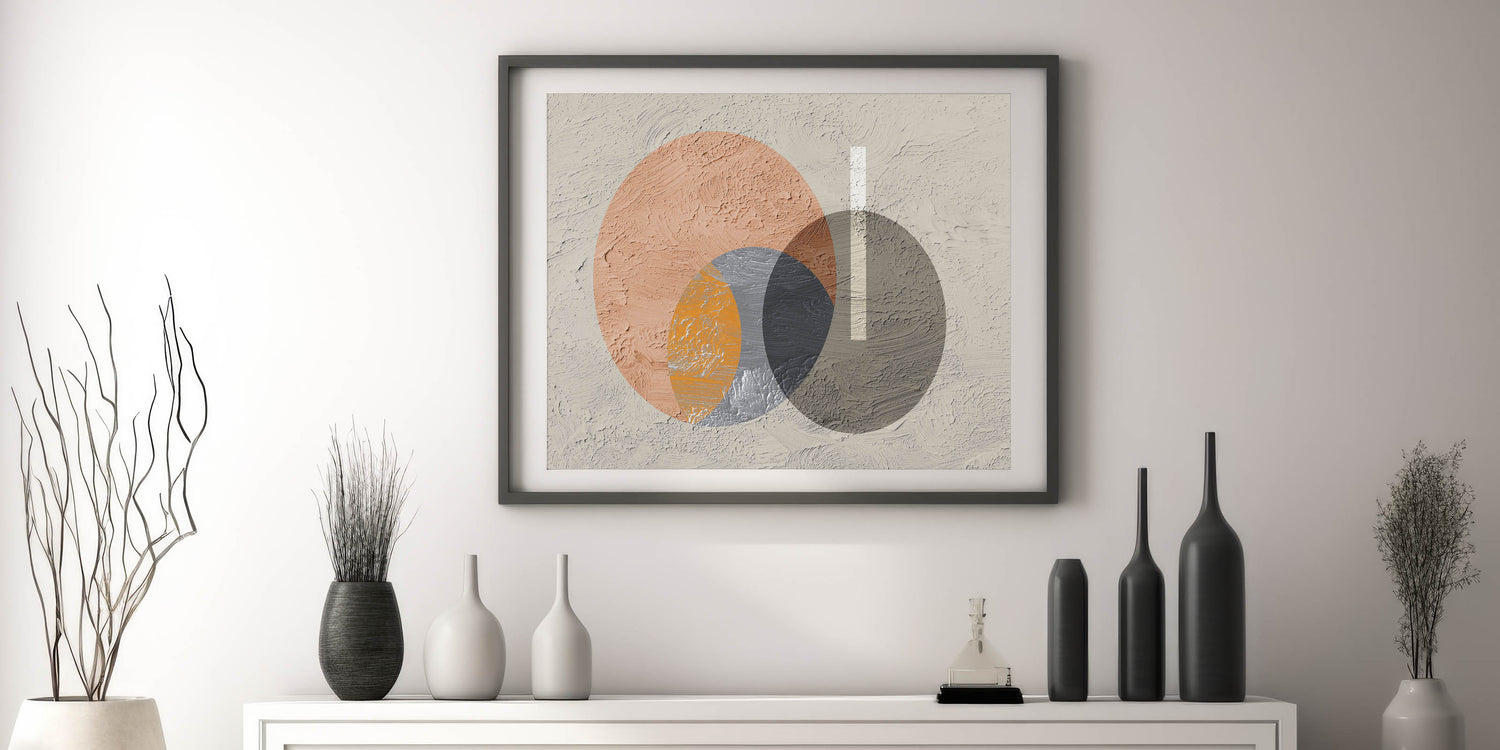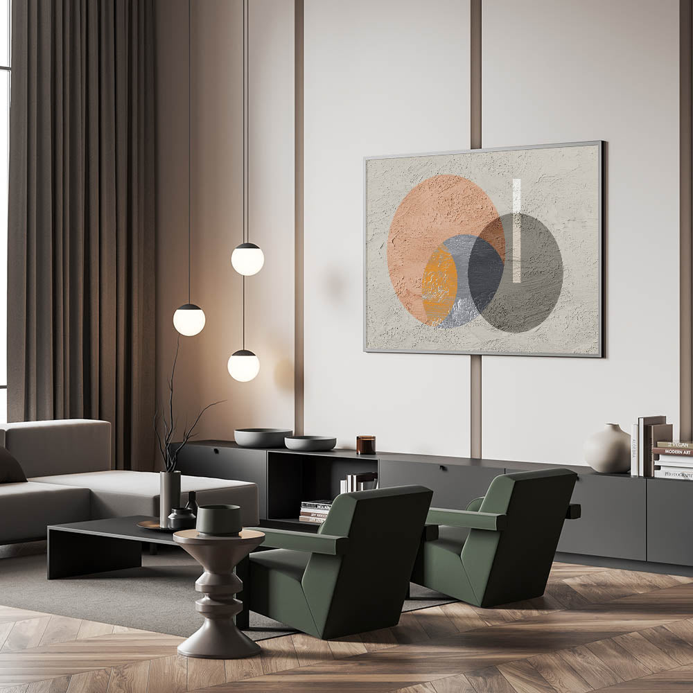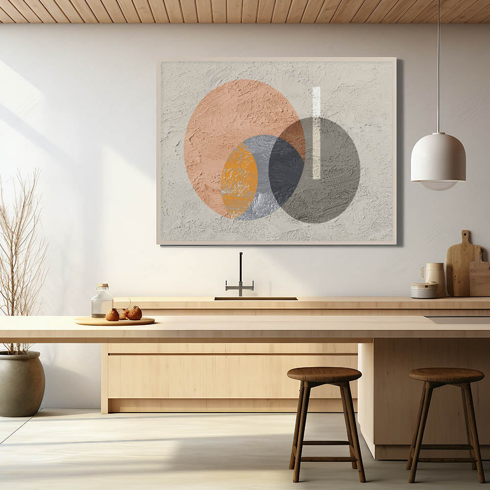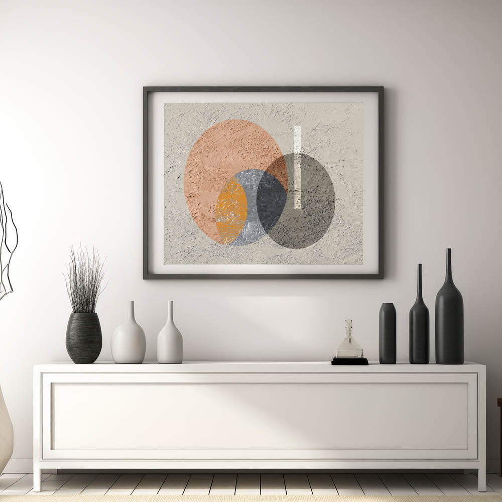 Add a contemporary touch to your space with this striking geometric circle art. The artwork features a dynamic interplay of overlapping circles in earthy tones of orange, gray, and beige, creating a modern yet harmonious composition. The textured background adds depth and dimension, while the minimalist design allows this piece to seamlessly blend into various decor styles, from modern to industrial. This artwork is perfect for bringing a sense of balance and visual interest to your living room, bedroom, or office.