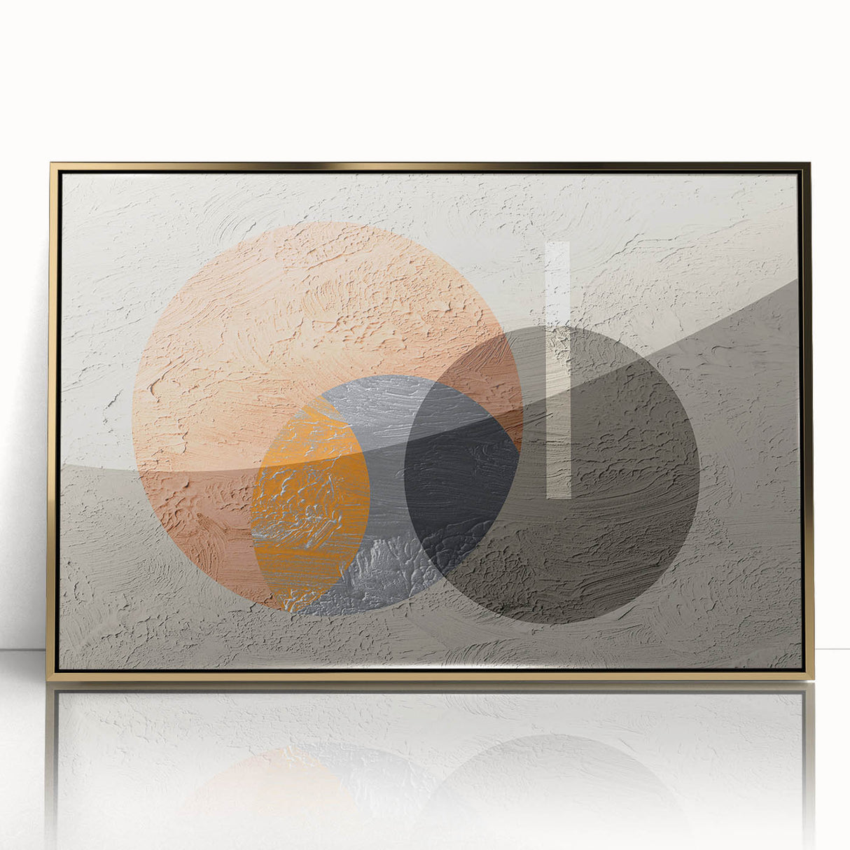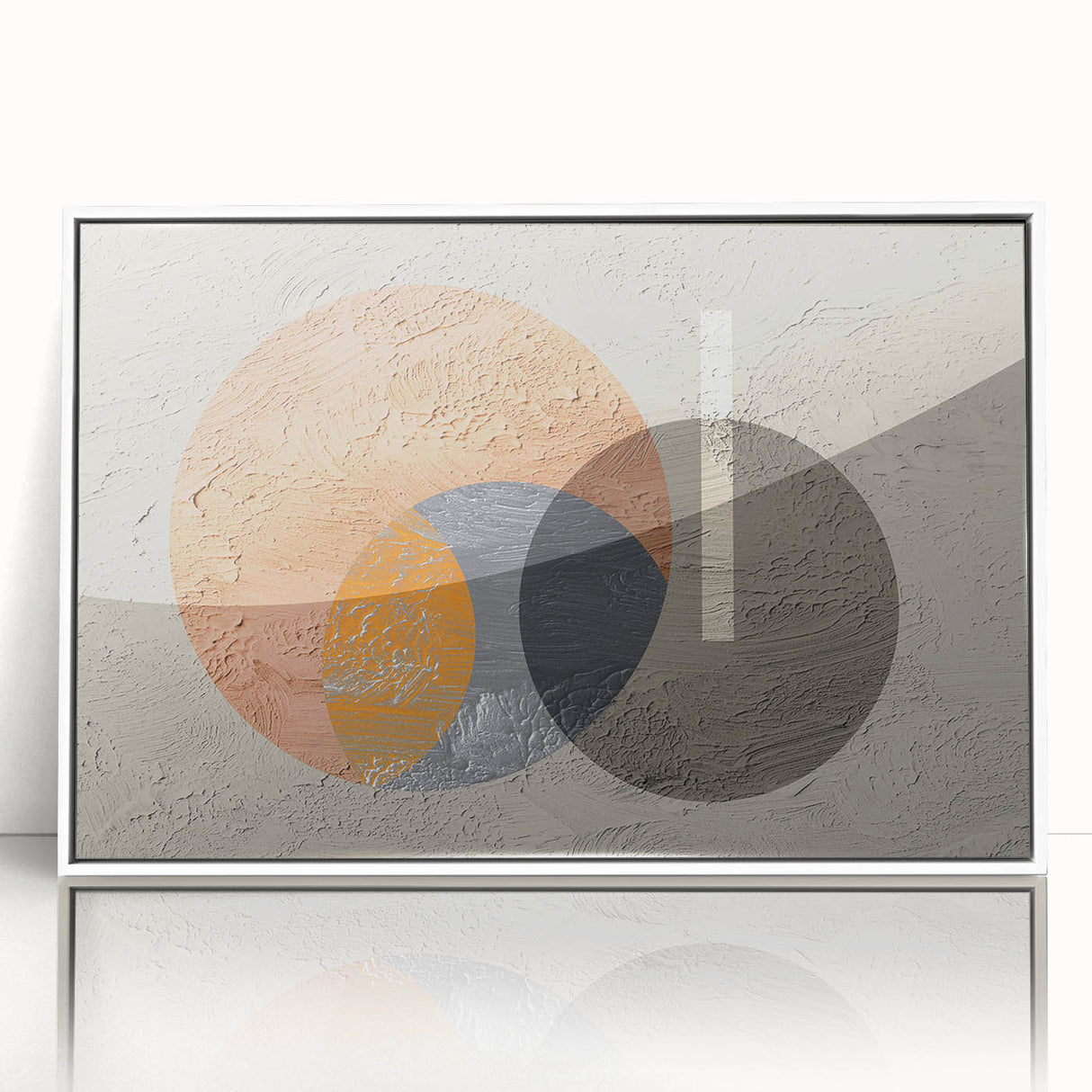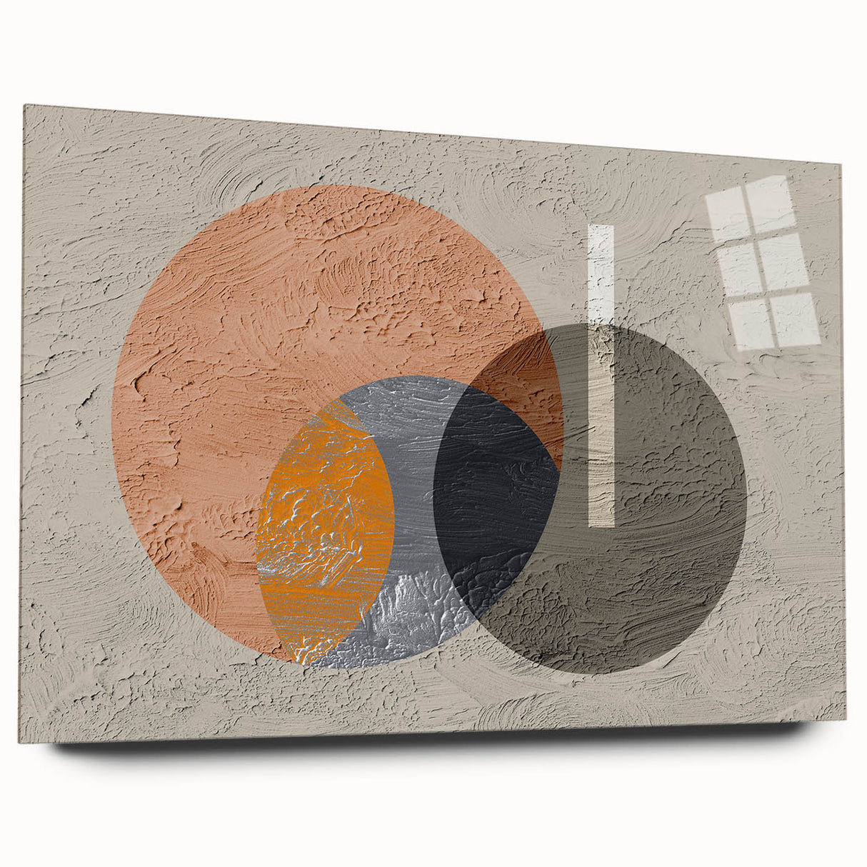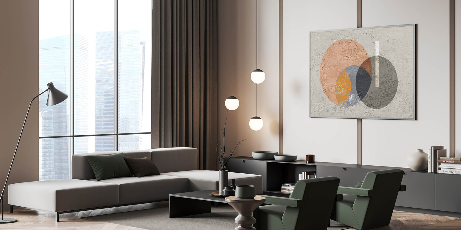 Add a contemporary touch to your space with this striking geometric circle art. The artwork features a dynamic interplay of overlapping circles in earthy tones of orange, gray, and beige, creating a modern yet harmonious composition. The textured background adds depth and dimension, while the minimalist design allows this piece to seamlessly blend into various decor styles, from modern to industrial. This artwork is perfect for bringing a sense of balance and visual interest to your living room, bedroom, or office.