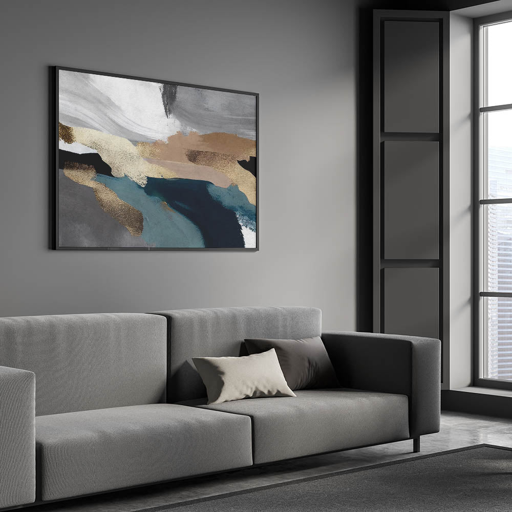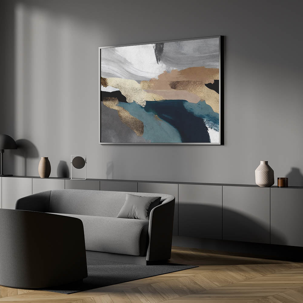 Introduce a touch of elegance to your home with this stunning geometric strokes and lines abstract art. This piece is a sophisticated blend of earth tones and dynamic brush strokes, featuring deep teal, warm gold, and muted grays. The design captures the essence of natural landscapes, making it a perfect choice for creating a serene yet impactful focal point in any room.