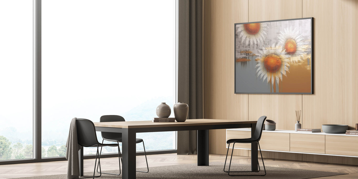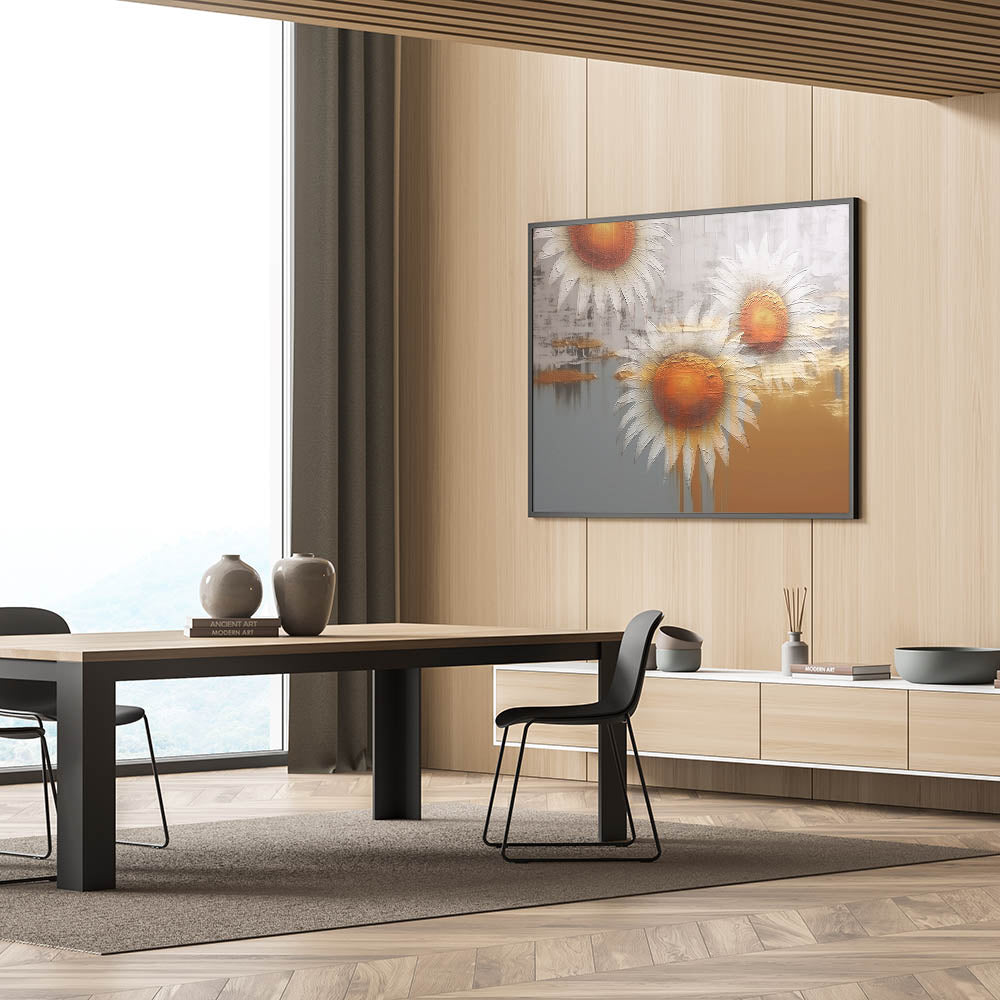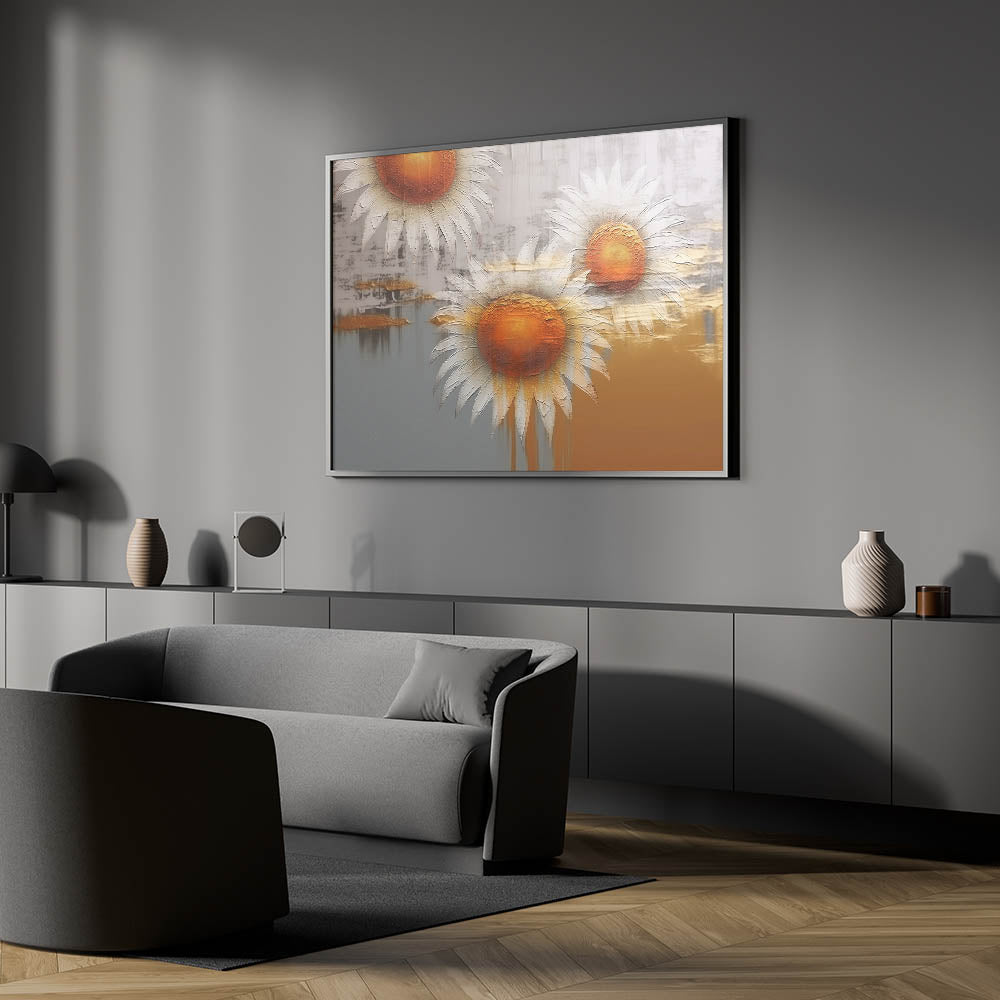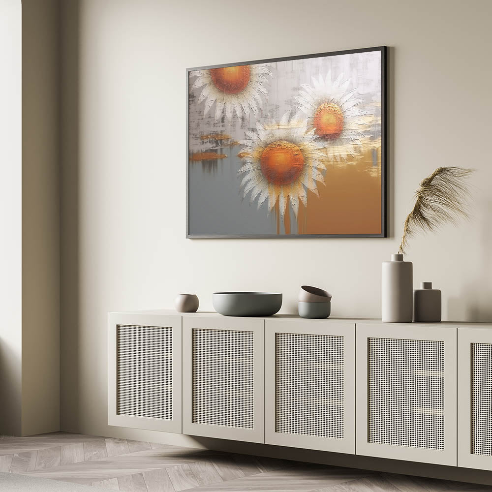 Brighten your living space with this Geometric Strokes and Lines Abstract Art, featuring bold sunflower designs layered with dynamic brush strokes. The combination of rich, warm colors and intricate geometric patterns brings a lively and artistic touch to any room, making it an ideal choice for modern and contemporary decor styles. Perfect for living rooms, kitchens, or offices, this artwork adds both warmth and visual interest to your space.