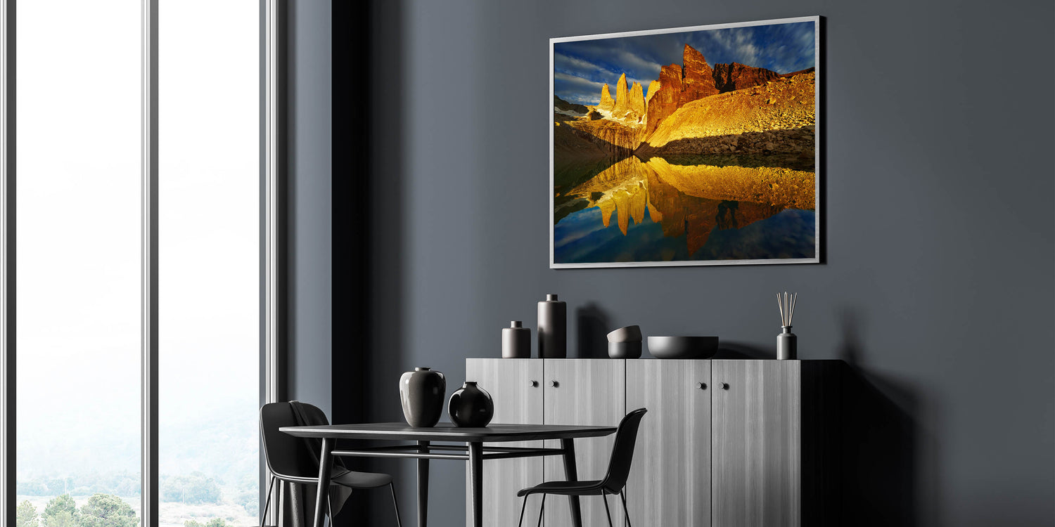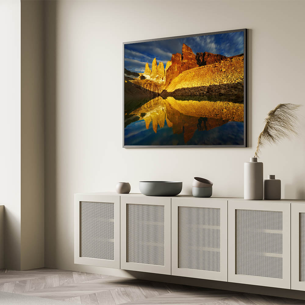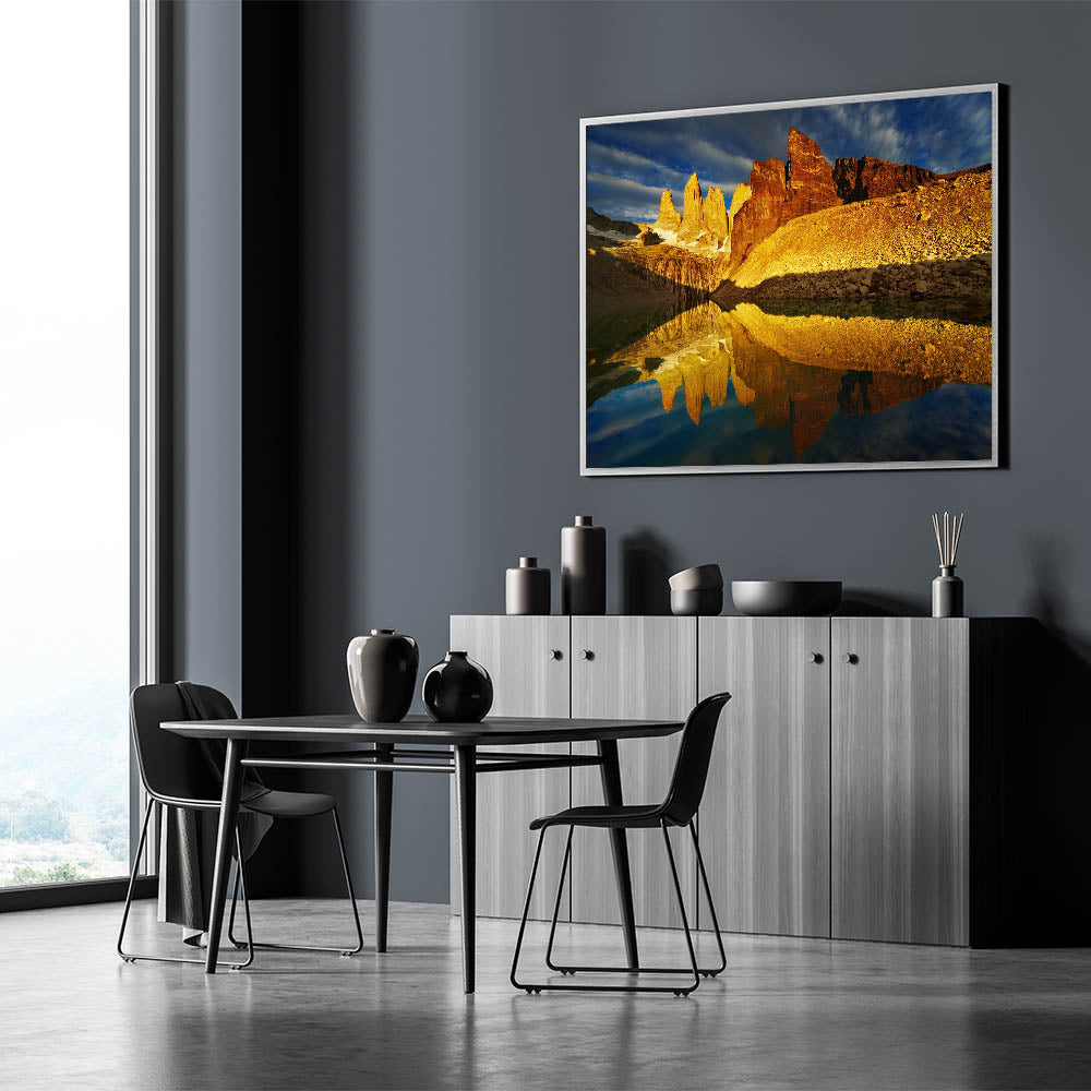 Immerse yourself in the breathtaking beauty of nature with this golden canyon reflection wall art. This stunning piece captures the dramatic interplay of light and shadow on the canyon's golden cliffs, perfectly mirrored in the tranquil waters below. The rich, warm tones of the canyon and the deep blues of the sky and water create a striking contrast that will enhance any room with its vibrant energy and natural beauty.
