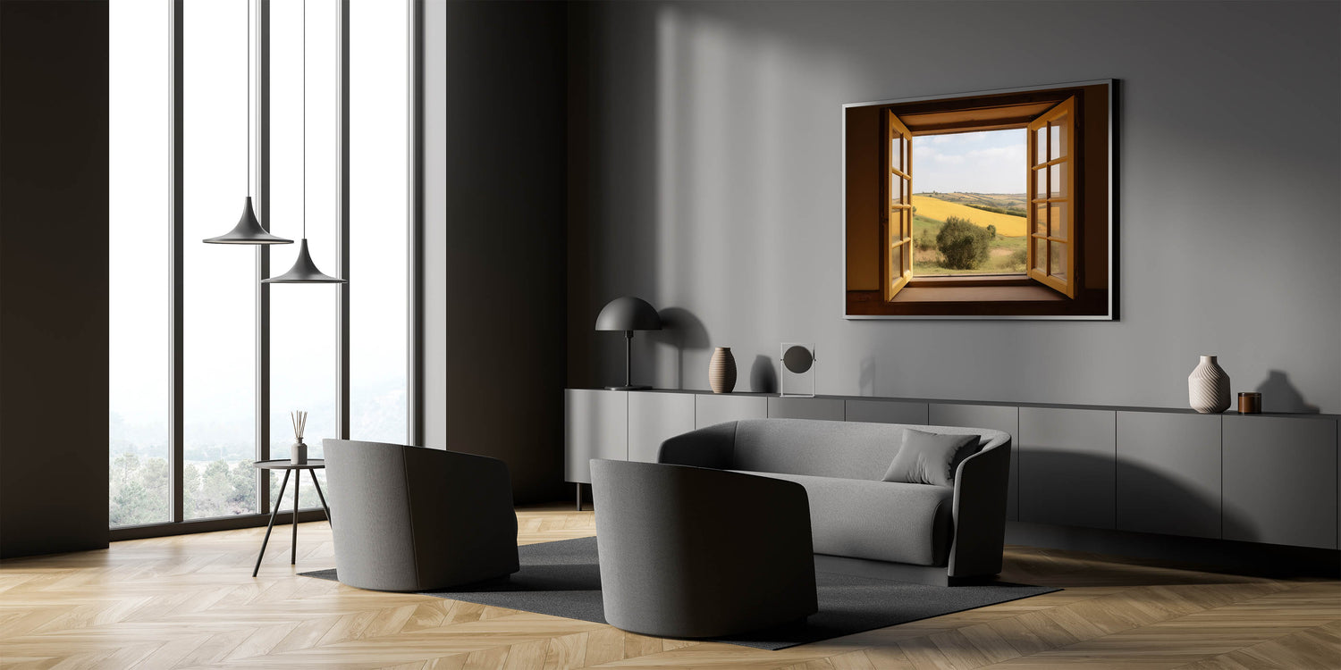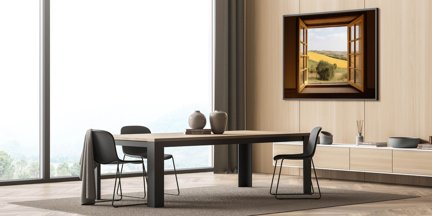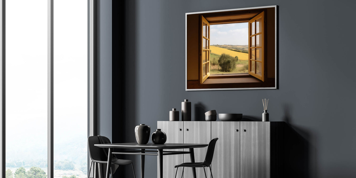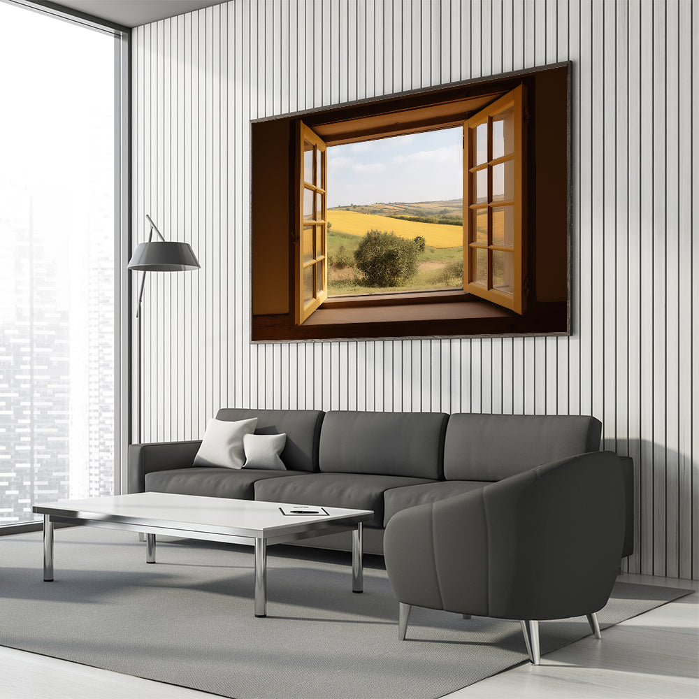 This window canvas art is perfect for those who appreciate the simplicity and beauty of nature. Whether you’re decorating a living room, bedroom, or office, this unique urban window decor piece will bring a sense of calm and relaxation to your environment. Embrace the tranquility of the countryside with this elegant and timeless window artwork.
