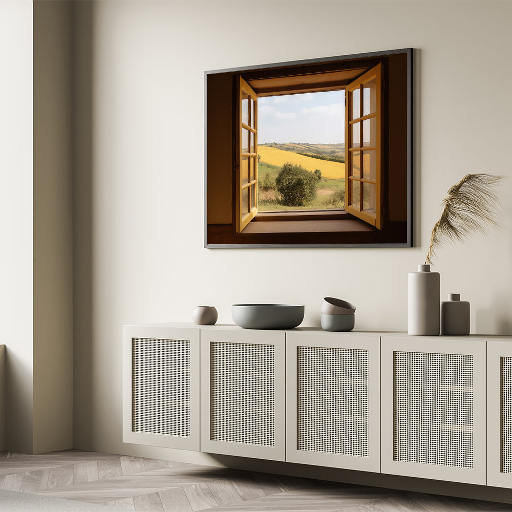 Transform your space with the warmth and serenity of the countryside with this Golden Fields Window Wall Art. Featuring a breathtaking view of rolling golden fields through an open window, this artwork brings the beauty of rural landscapes into your home or office. The soft golden tones and peaceful scenery create a calming atmosphere, making this piece perfect for any room that needs a touch of nature's tranquility.