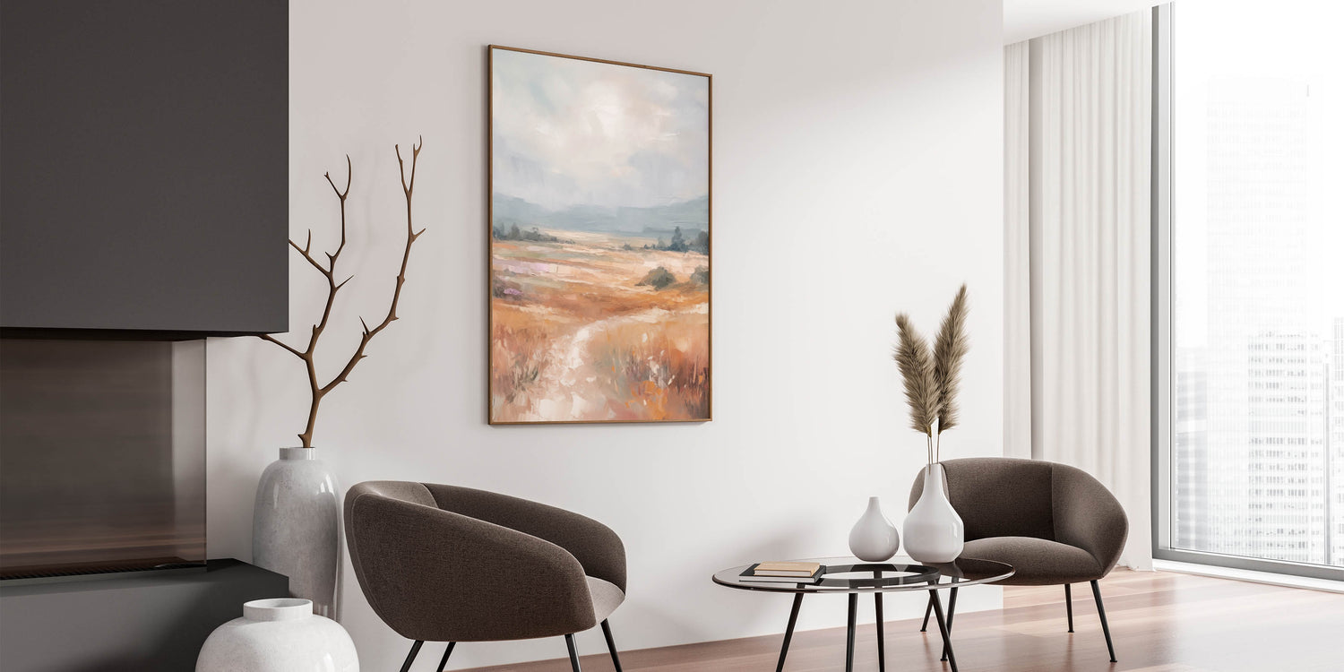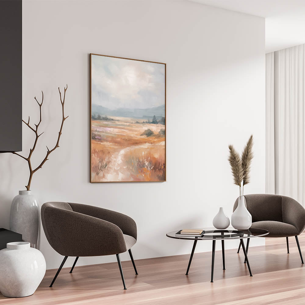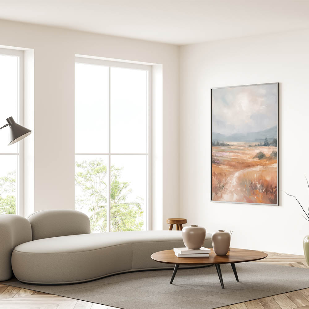 Capture the essence of a golden, sunlit landscape with "Golden Horizon," a minimalist abstract art piece that brings warmth and depth to any space. The warm earth tones blend seamlessly with soft, muted blues and grays, creating a serene yet vibrant depiction of an open field stretching toward the horizon. This artwork is perfect for those who appreciate the beauty of nature and the calming influence of minimalist design.