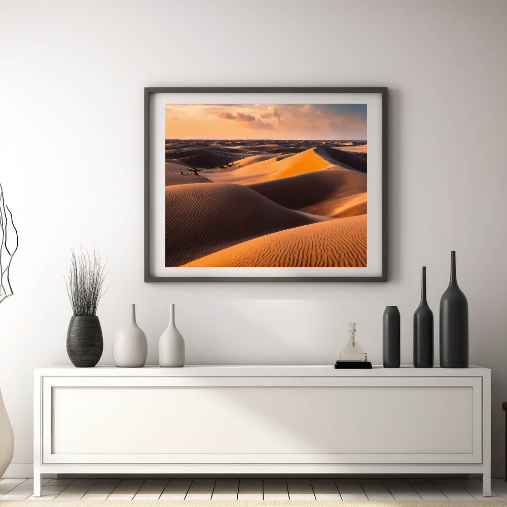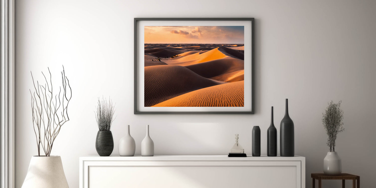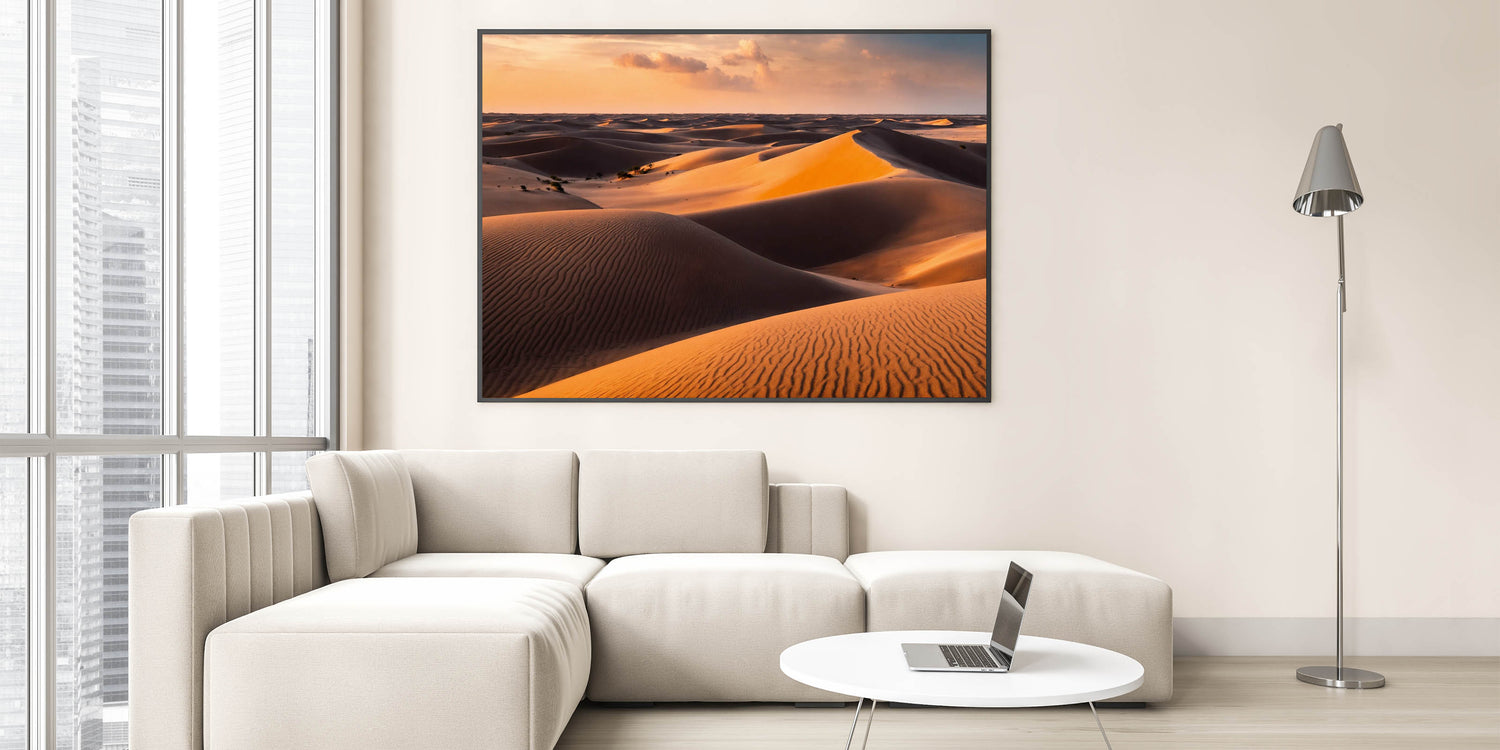 - High-quality sunset dune wall art available in various formats, including stretched canvas, framed canvas, acrylic glass, and more.