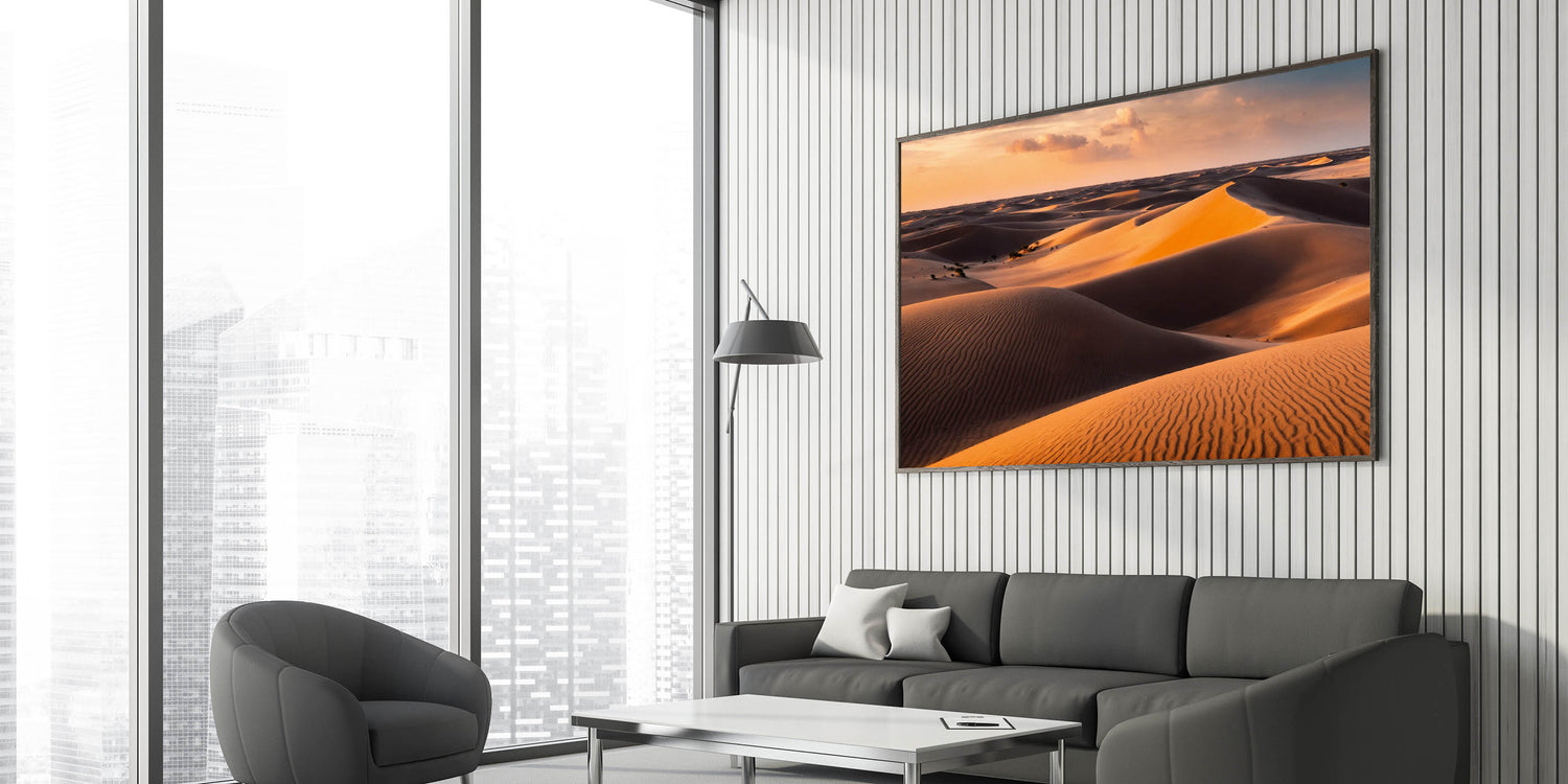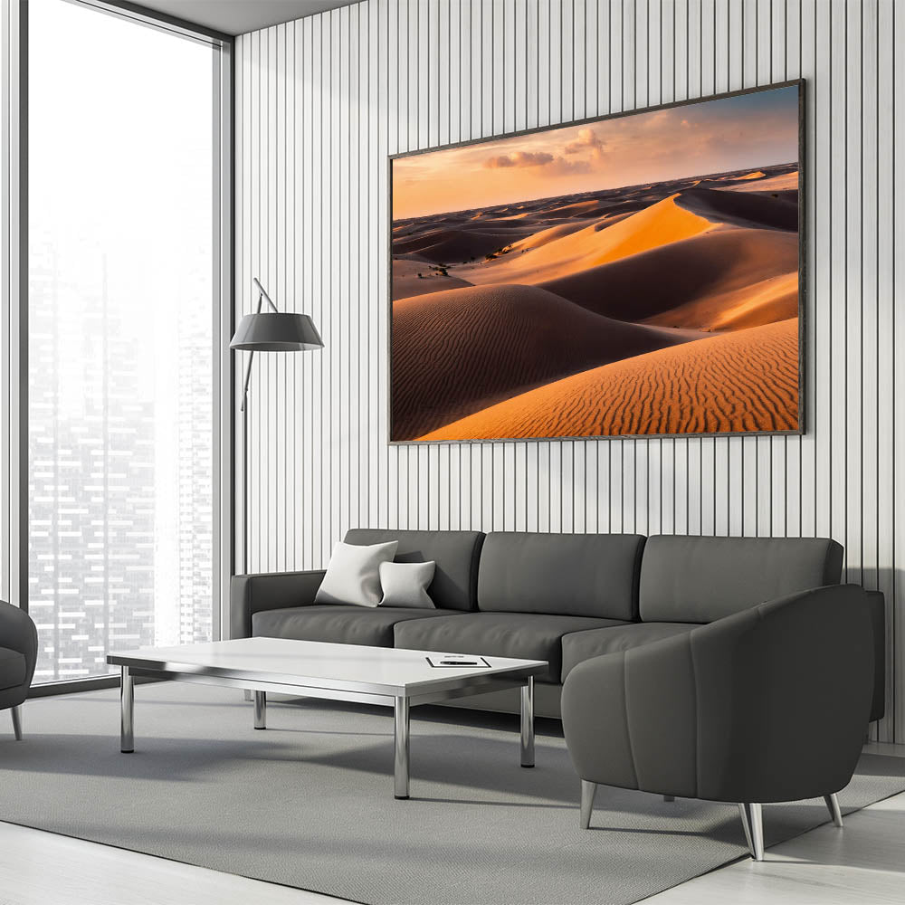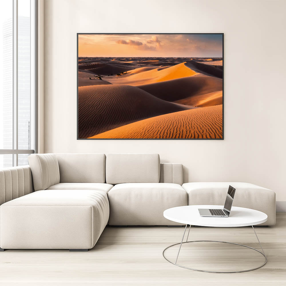 - High-quality sunset dune wall art available in various formats, including stretched canvas, framed canvas, acrylic glass, and more.