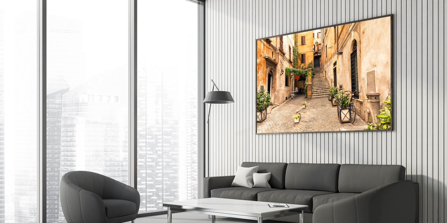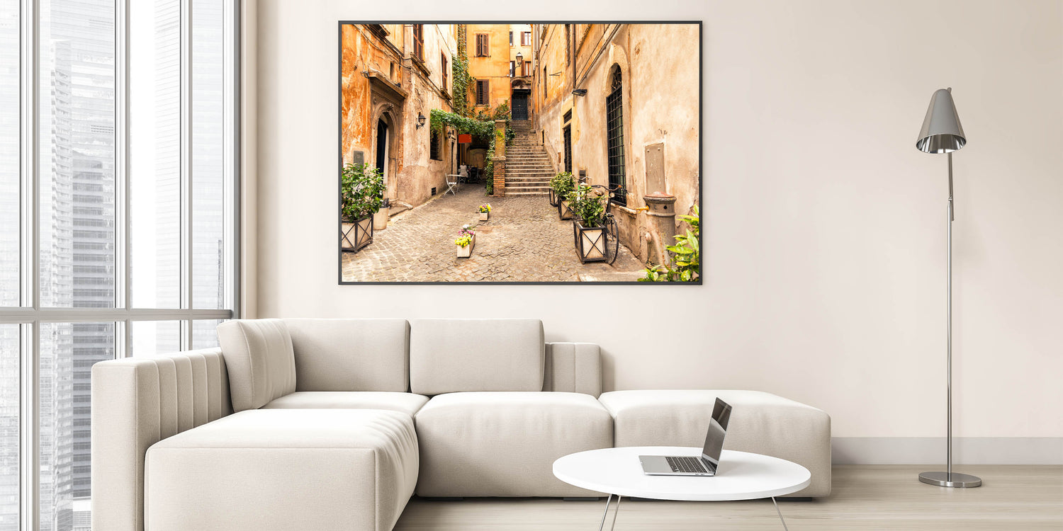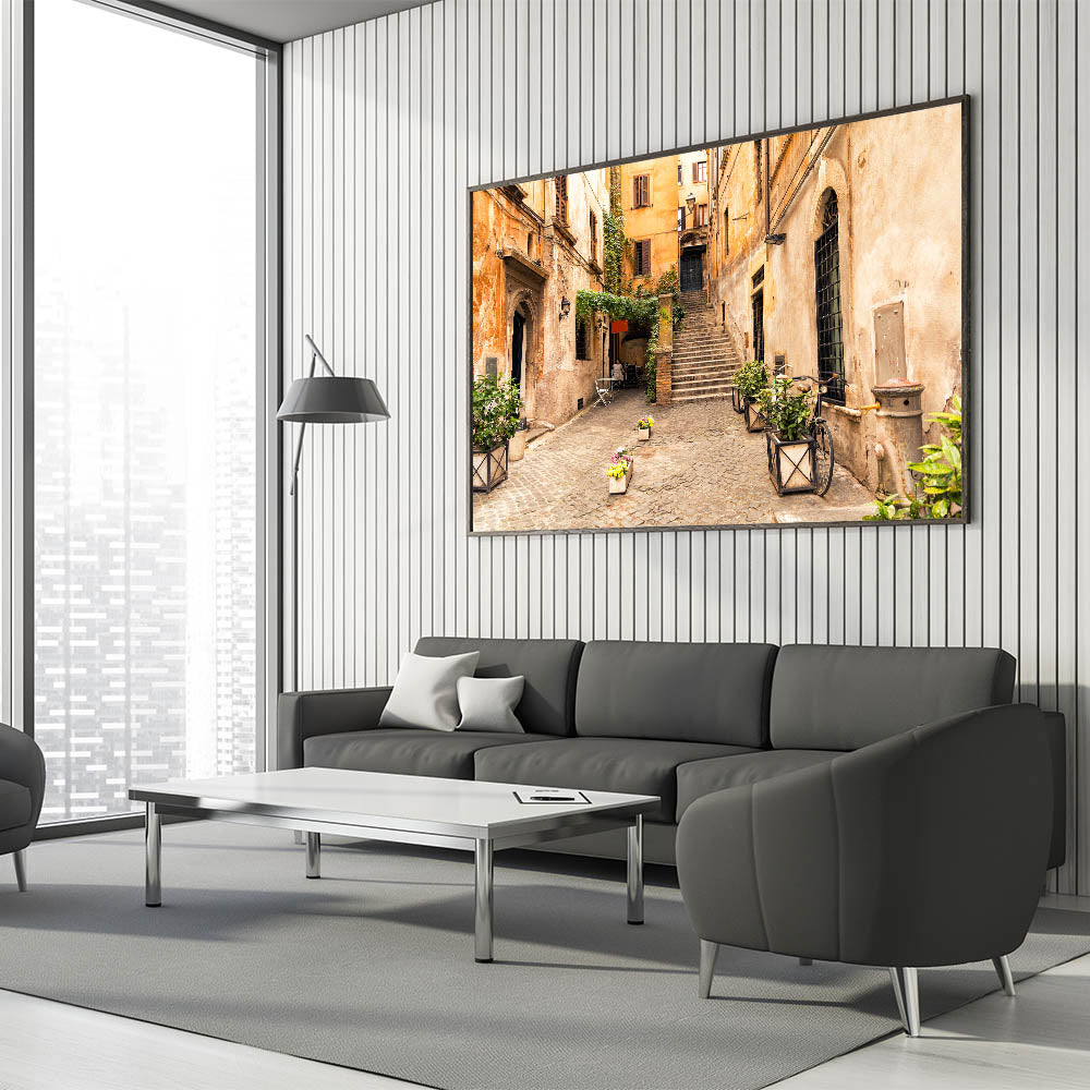 This piece of Trastevere wall decor is perfect for those who love Italian architecture and scenic prints. Whether you are looking to add warmth to your living room or find the perfect gift for a friend, this artwork is sure to captivate.