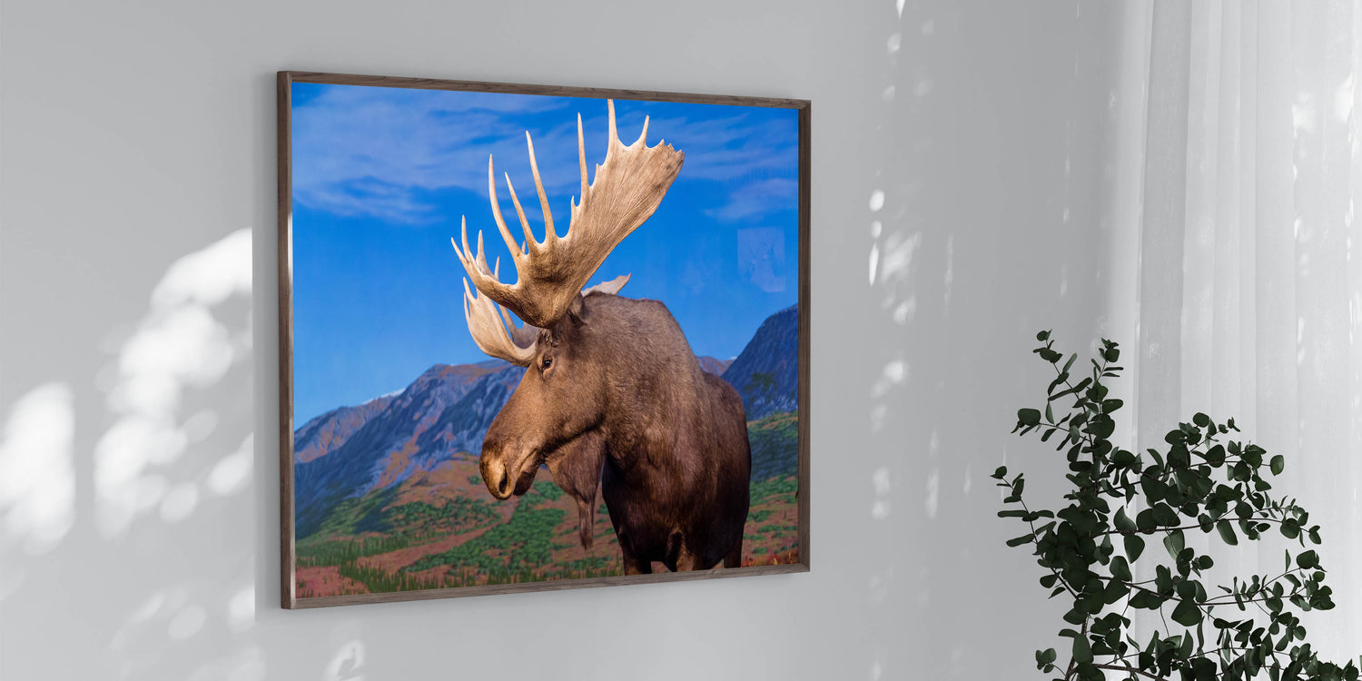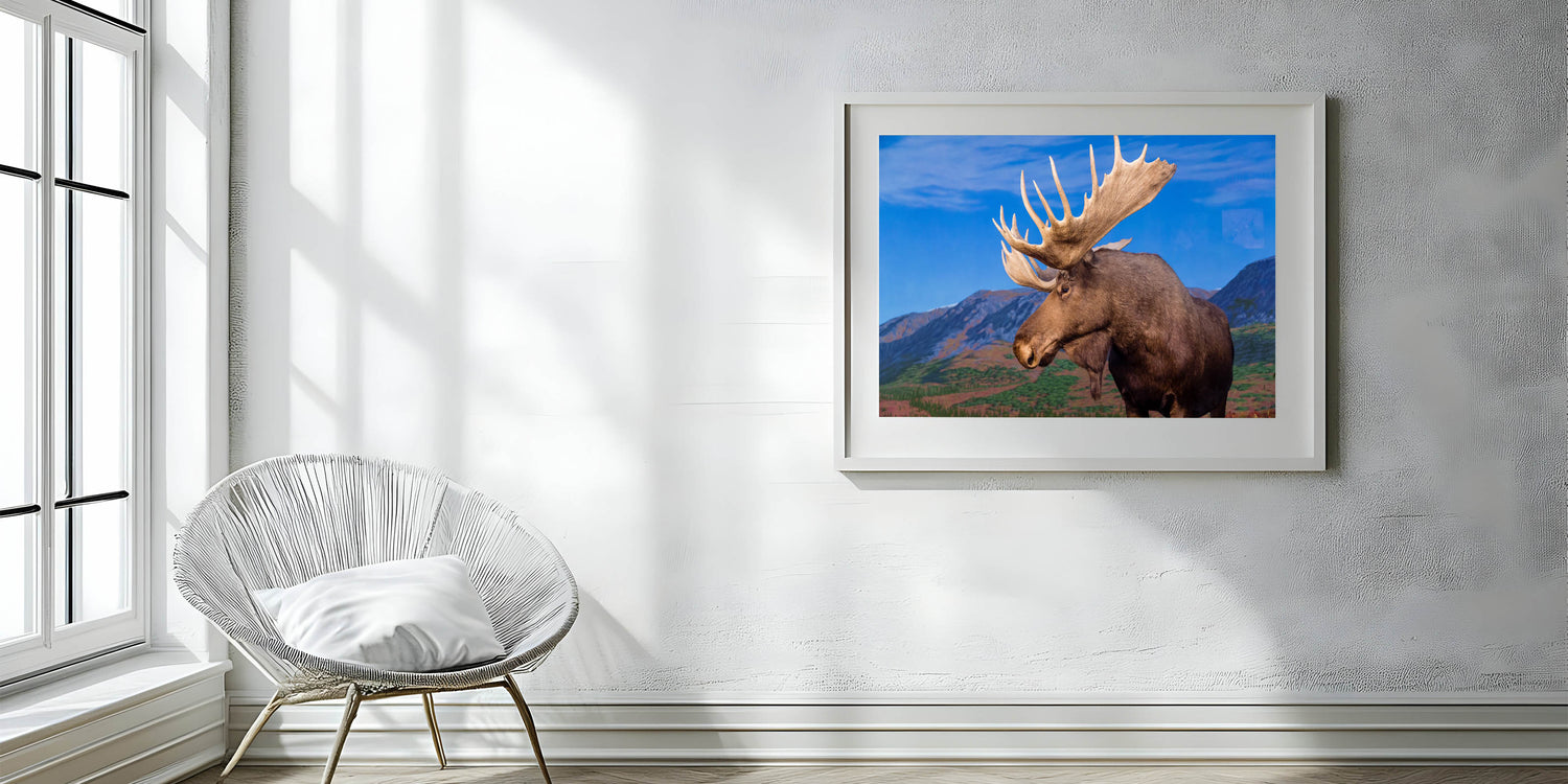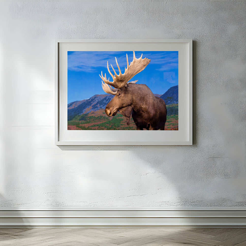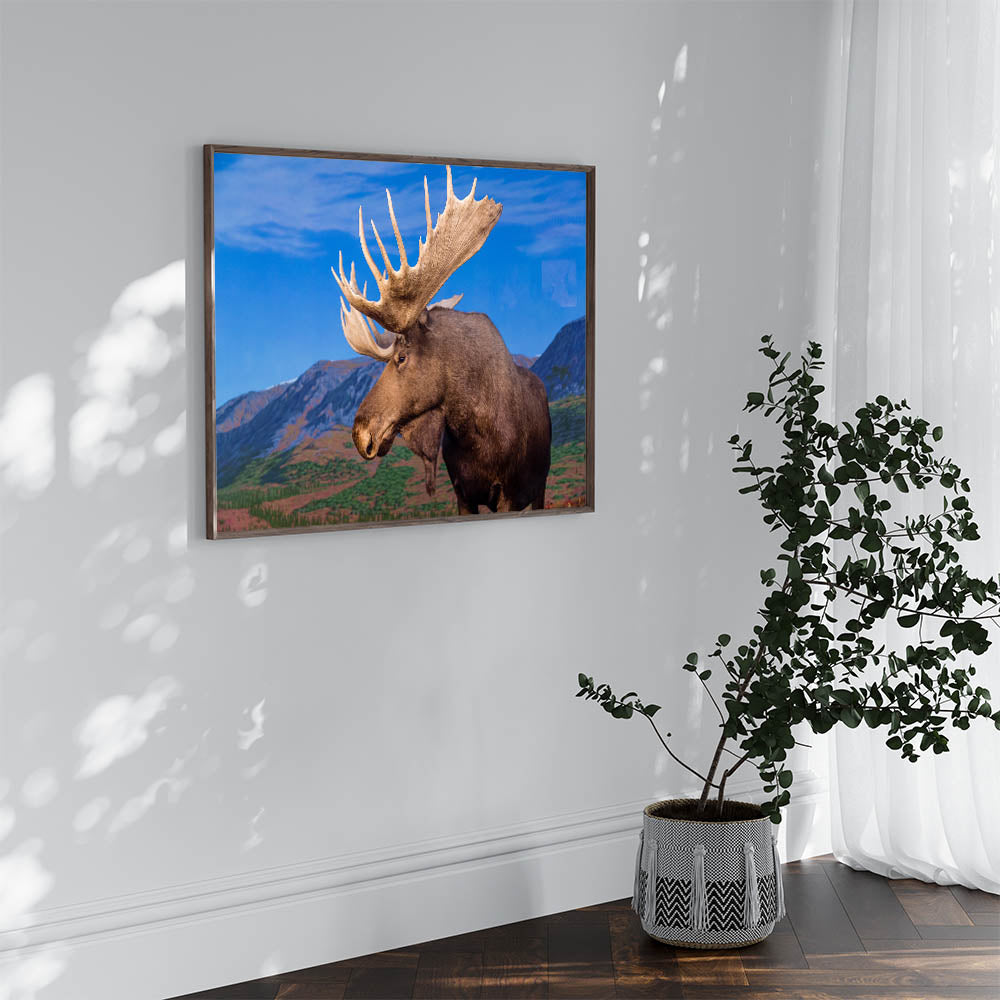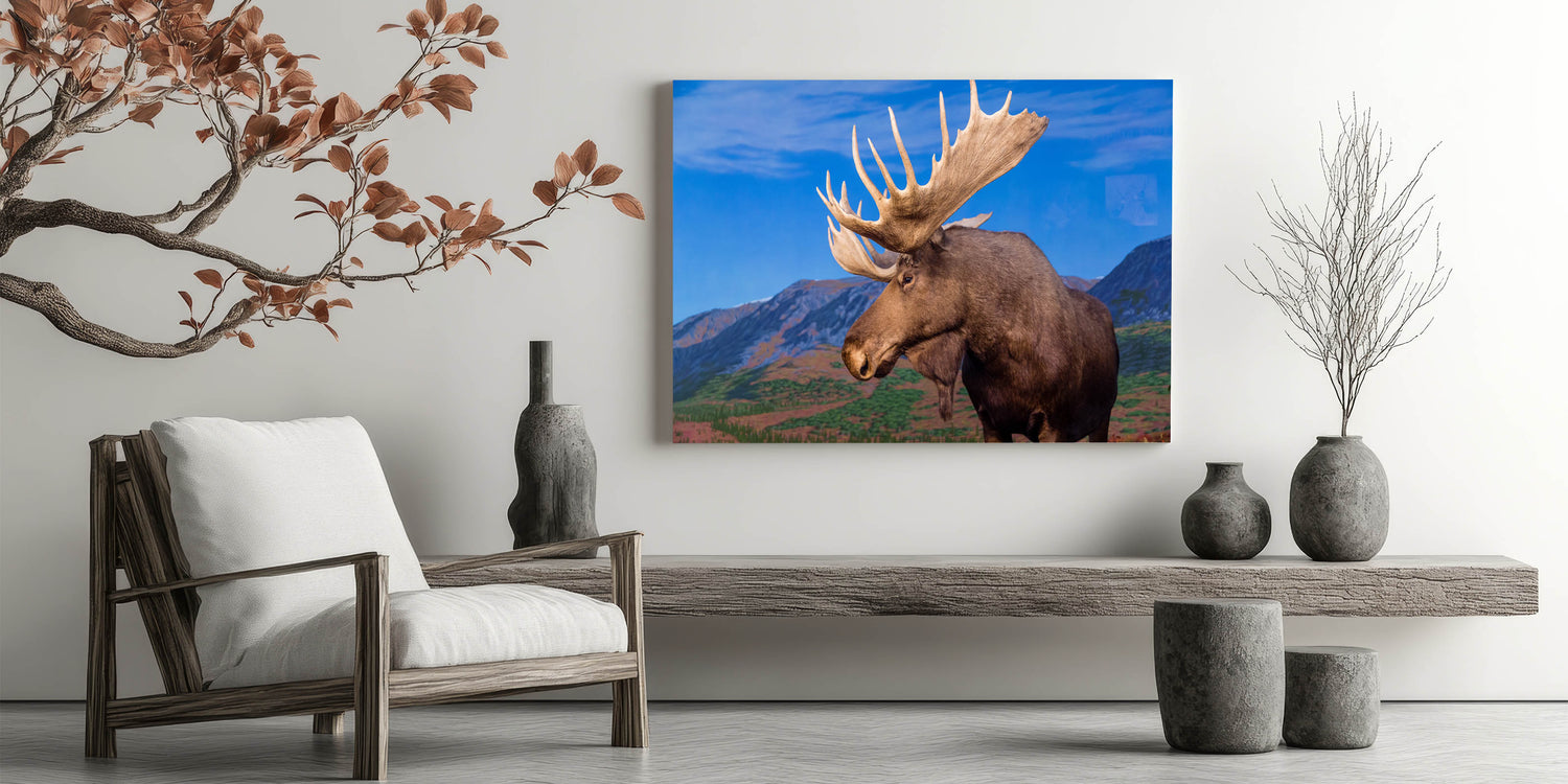 Immerse yourself in the grandeur of nature with this striking Elk Canvas Print. This captivating artwork features a majestic elk in its natural habitat, with a stunning mountain landscape in the background. The piece perfectly captures the strength and beauty of the elk, making it a perfect addition to any rustic or nature-themed decor.