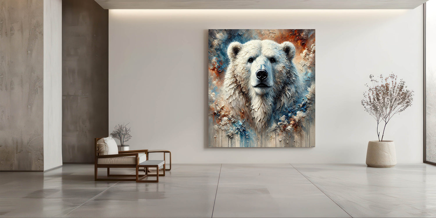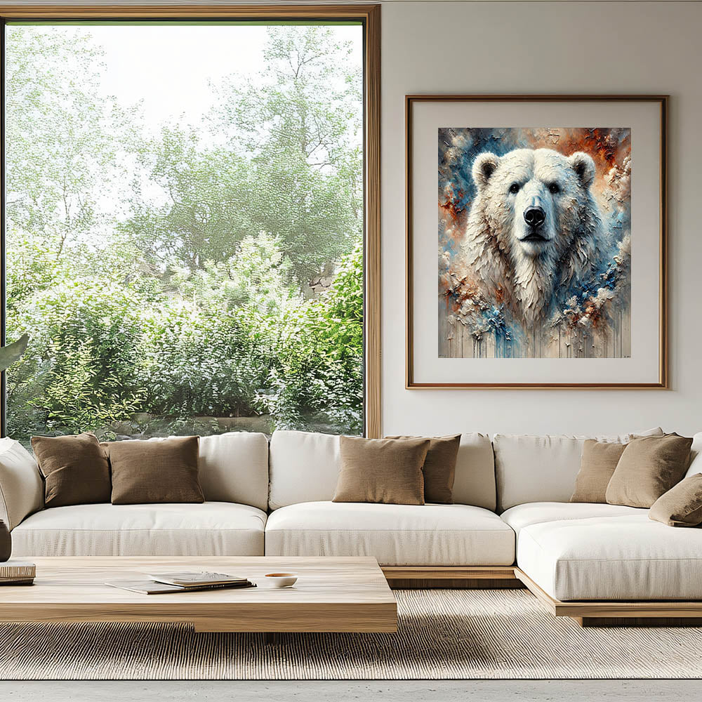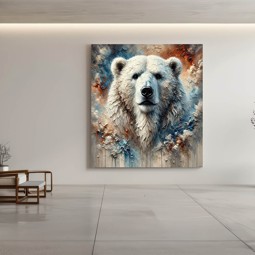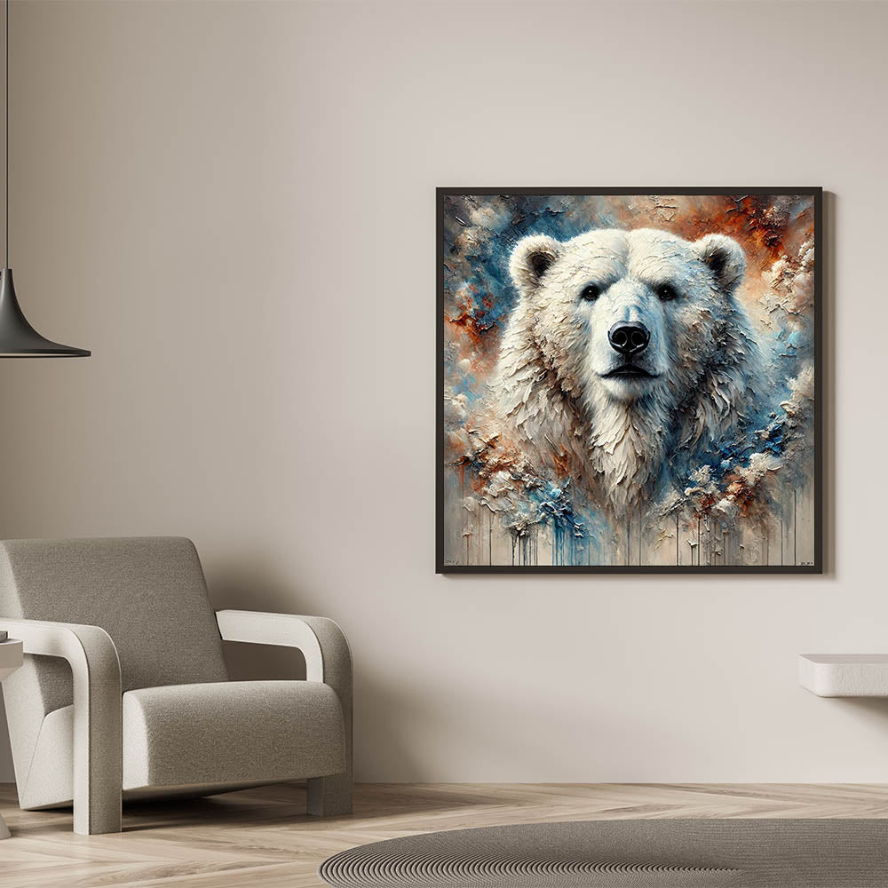 Immerse yourself in the majestic beauty of the Arctic with this stunning Polar Bear Wall Decor. This artwork, featuring a powerful portrait of a polar bear with rich textures and vibrant colors, is perfect for those who admire wildlife and nature's grandeur.