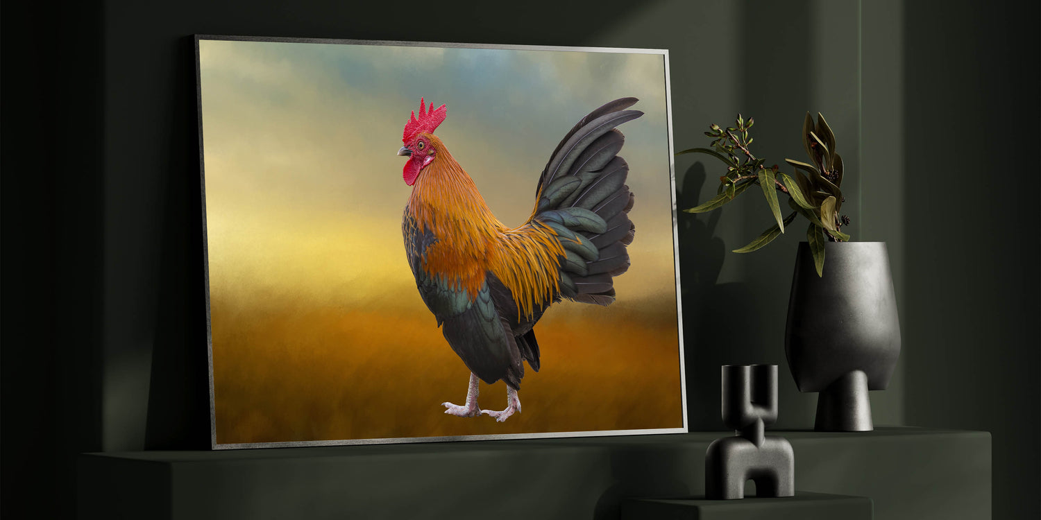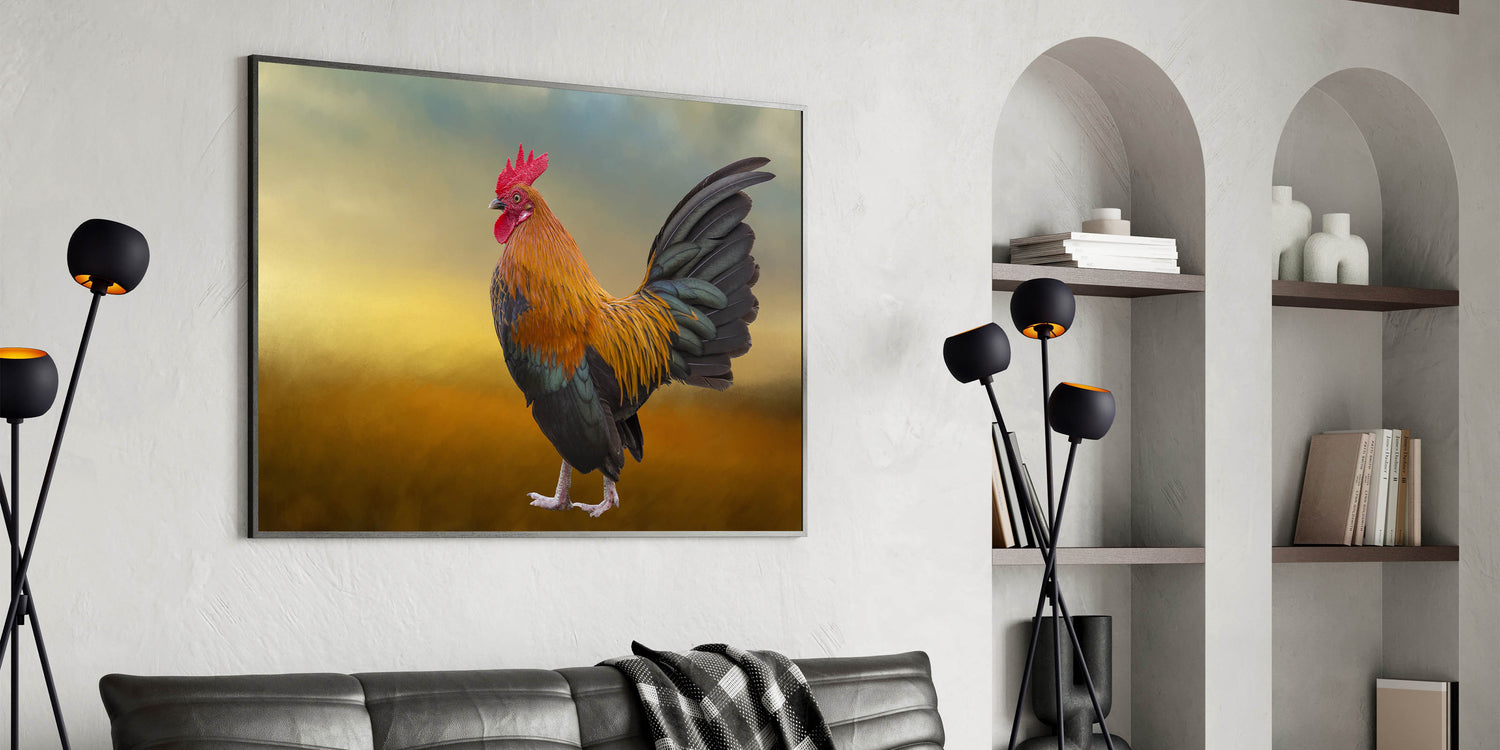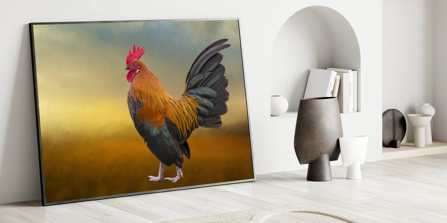 Majestic Rooster at Dawn - Stunning Chicken Wall Art for Rustic Decor