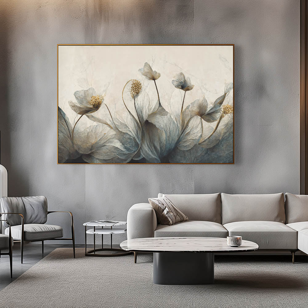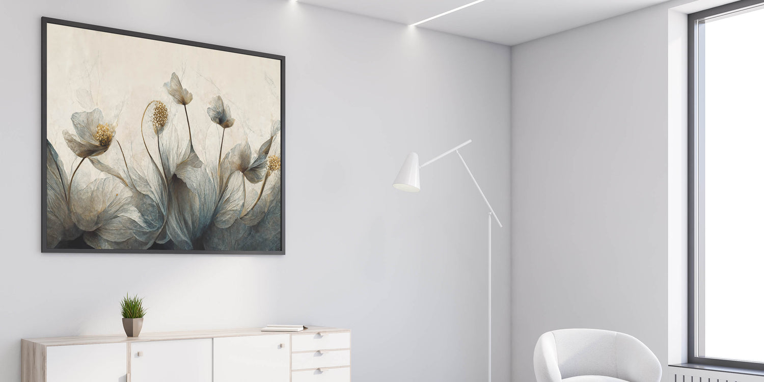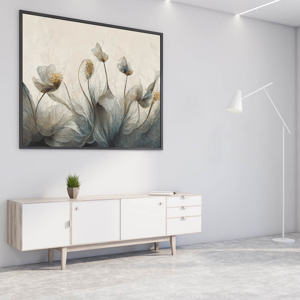 Transform your space with the mysterious elegance of this abstract floral canvas, featuring midnight blooms highlighted with golden accents. The artwork blends deep shades of blue and gold, creating a captivating and sophisticated atmosphere. Ideal for modern and contemporary interiors, this piece is available in various formats, including stretched canvas, framed canvas, acrylic glass, framed acrylic glass, framed print, rolled canvas, and rolled print, offering versatile options to match your decor style.