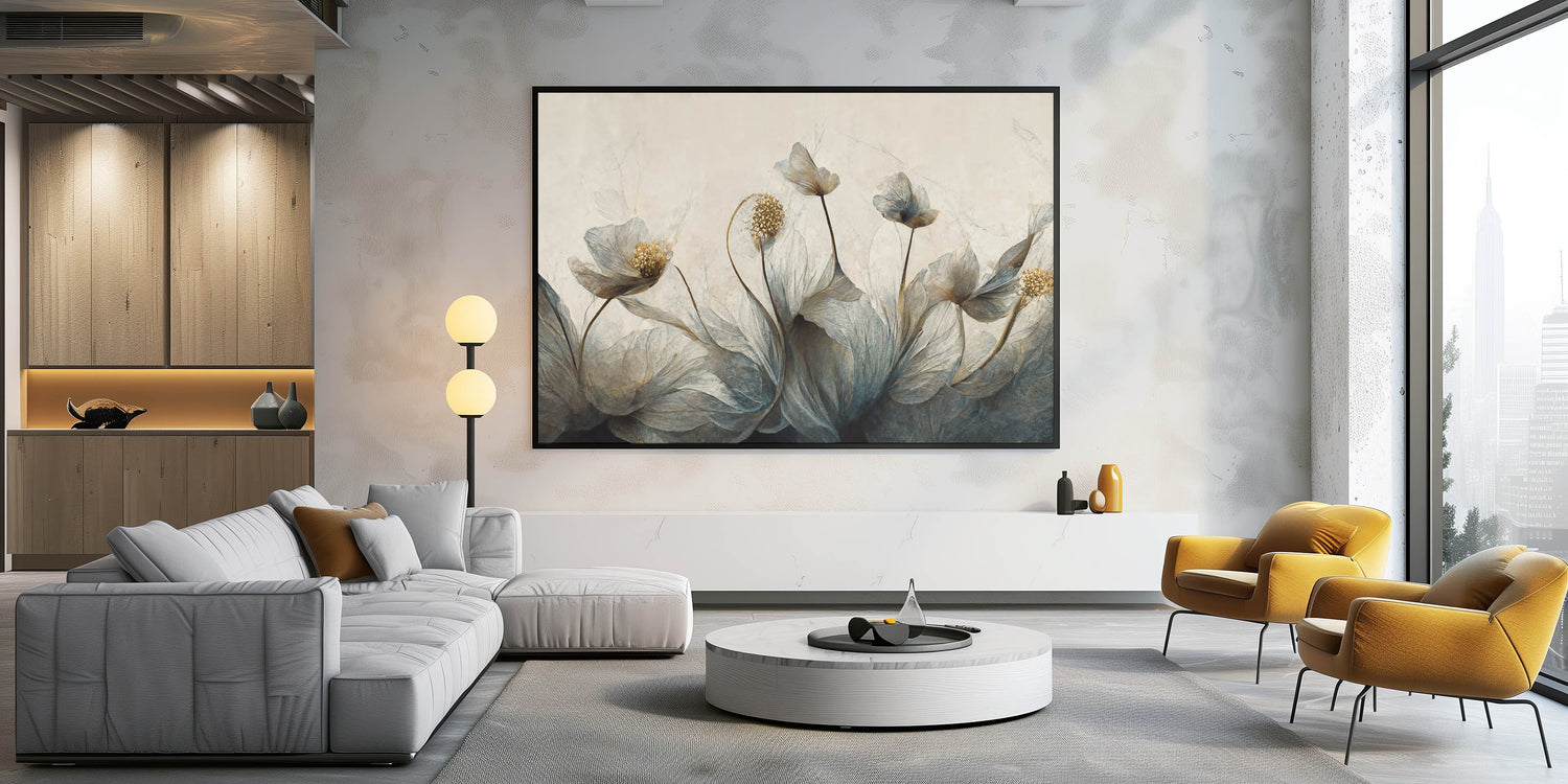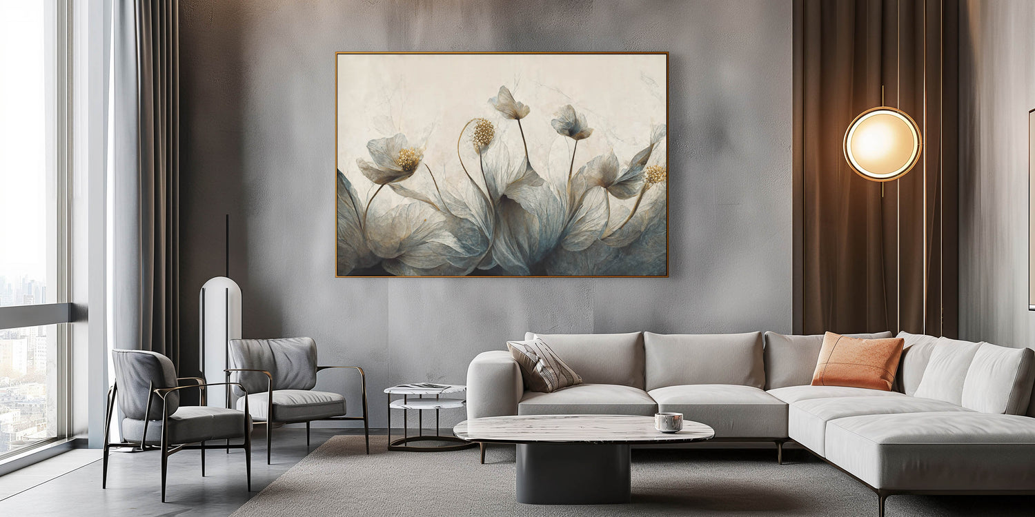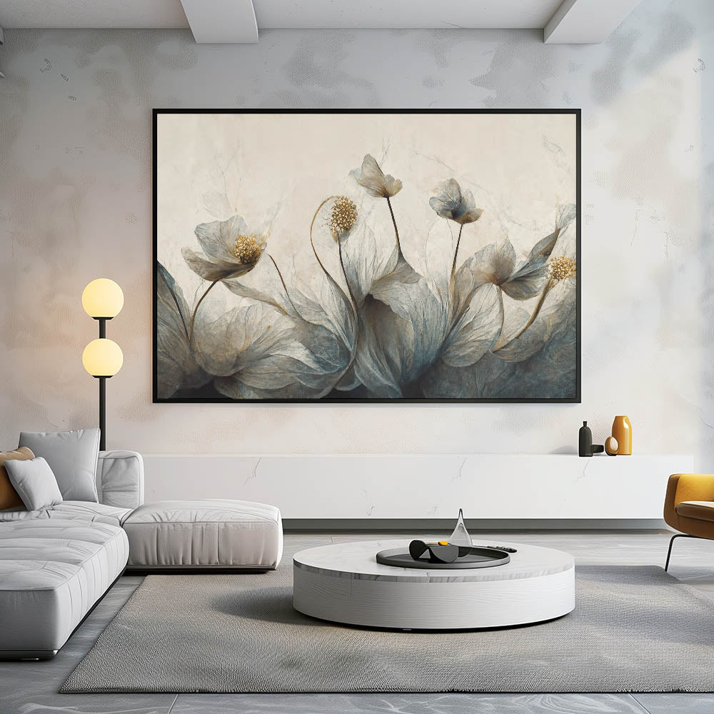 Transform your space with the mysterious elegance of this abstract floral canvas, featuring midnight blooms highlighted with golden accents. The artwork blends deep shades of blue and gold, creating a captivating and sophisticated atmosphere. Ideal for modern and contemporary interiors, this piece is available in various formats, including stretched canvas, framed canvas, acrylic glass, framed acrylic glass, framed print, rolled canvas, and rolled print, offering versatile options to match your decor style.