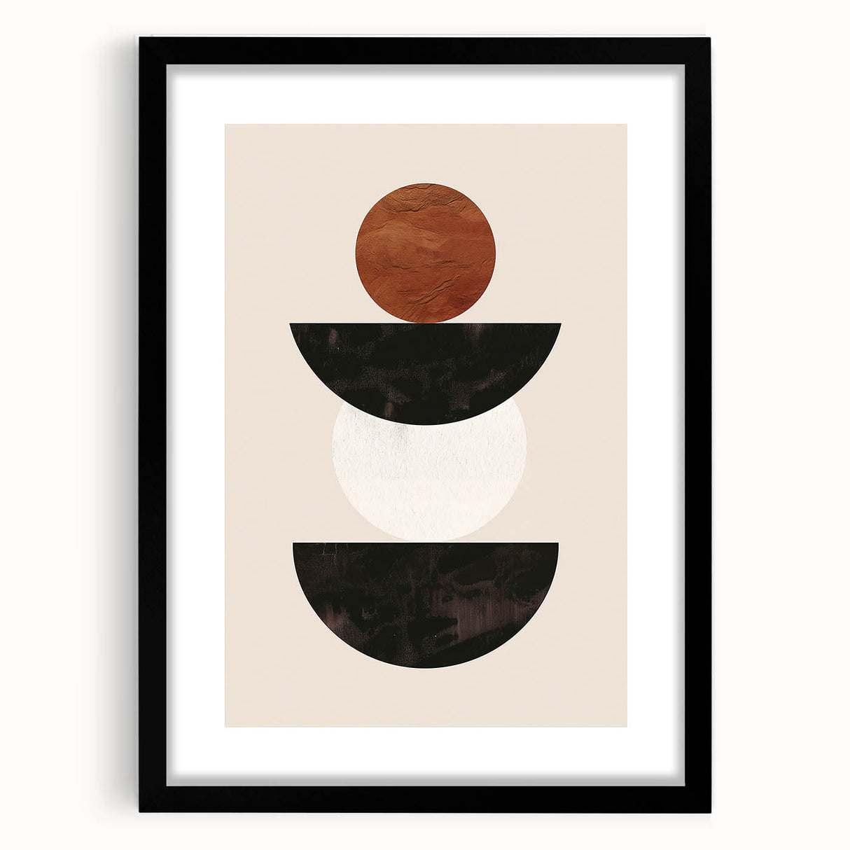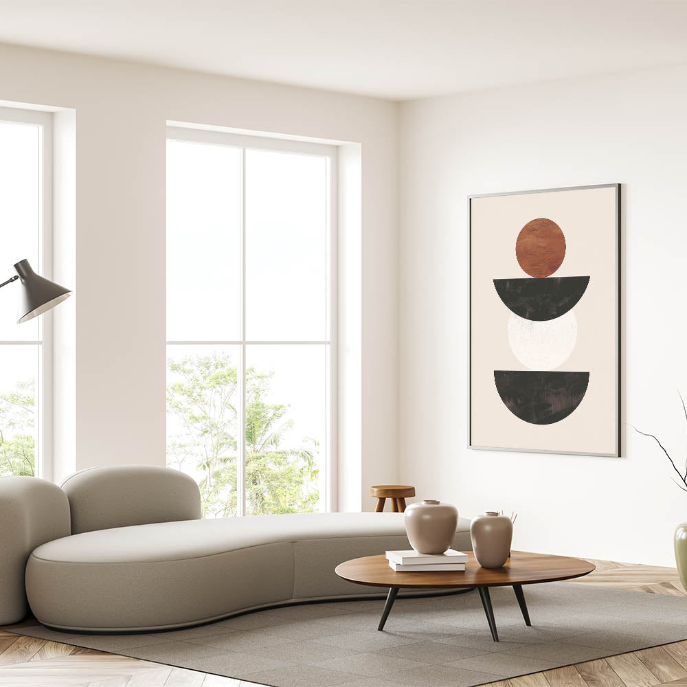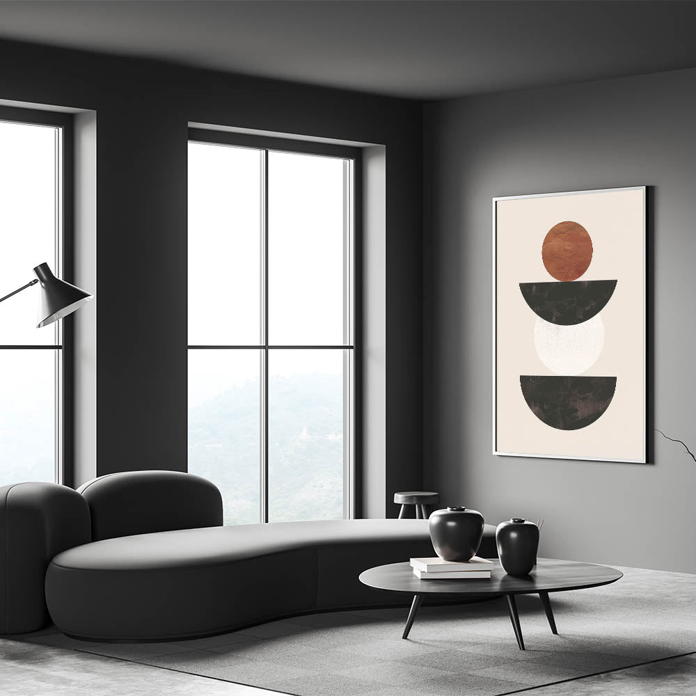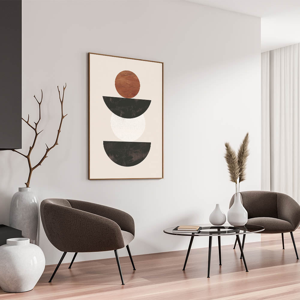 Introduce a sense of modern elegance to your space with this stunning minimalist geometric wall art. Featuring a balanced composition of black, white, and brown shapes, this piece embodies the essence of minimalist abstract art. The contrast between the earthy brown circle and the sleek black and white semicircles creates a visually striking yet simple design that complements any modern interior.