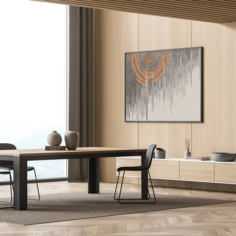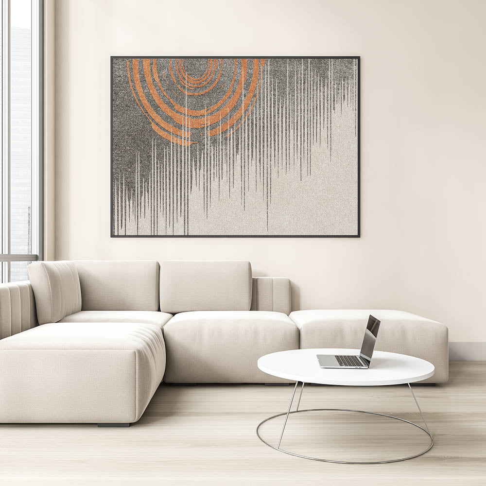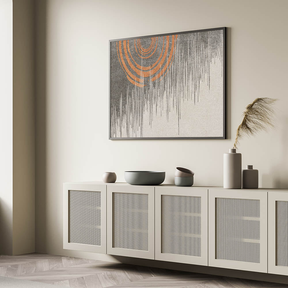 Add a bold, modern touch to your space with this striking abstract art piece featuring vivid orange concentric circles paired with intricate linear patterns. The contrasting elements of the design create a dynamic visual effect, making this artwork a perfect centerpiece for contemporary interiors. The combination of warm orange tones with the cool, structured lines adds balance and sophistication to the piece, making it ideal for a living room, office, or hallway.